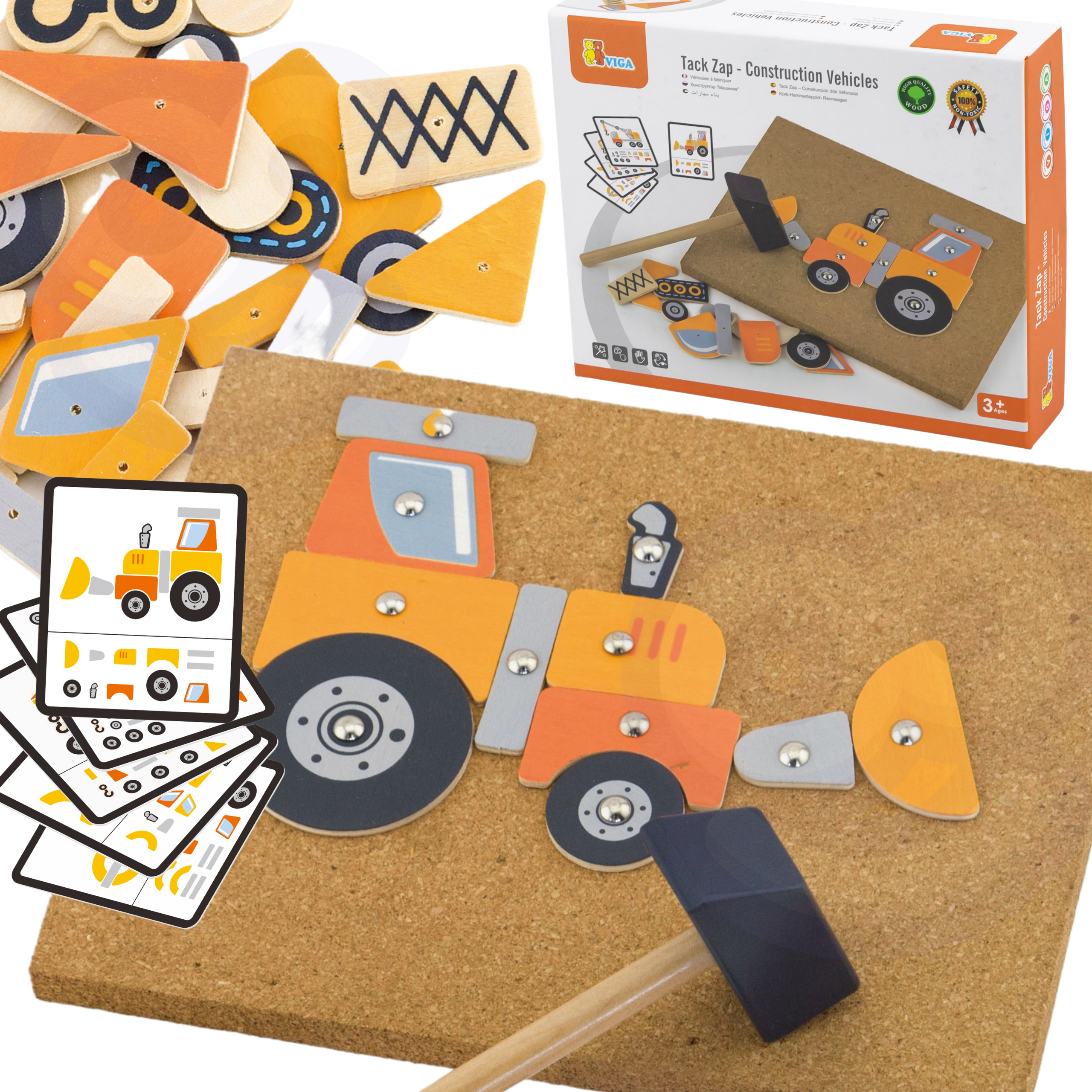 Čo všetko obsahuje tento 45-dielny set? V krabičke nájdete všetko potrebné pre okamžitú hru: pevnú korkovú podložku, bezpečné drevené kladivko, balenie kovových klinčekov, rôzne maľované drevené dieliky na stavbu vozidiel a obojstranné kartičky s predlohami, podľa ktorých môže dieťa stroje skladať.