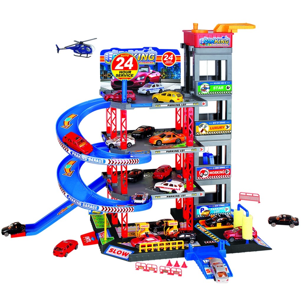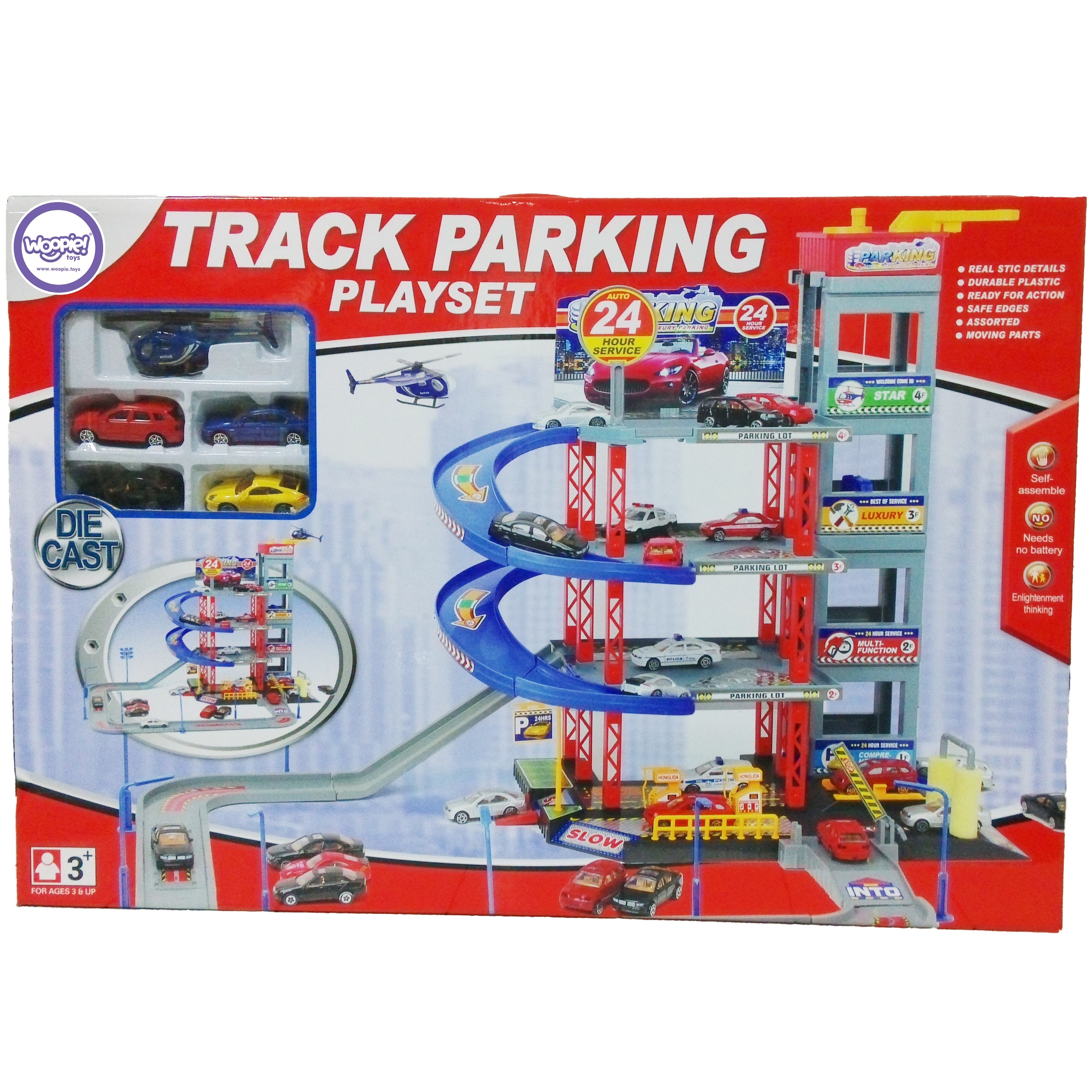Senzačné poschodové parkovisko a autodráha od spoločnosti WOOPIE s benzínovou pumpou, výťahom, autoumyvárňou, autoservisom a heliportom, prebudí predstavivosť každého fanúšika rýchlych automobilov a motorizmu.
