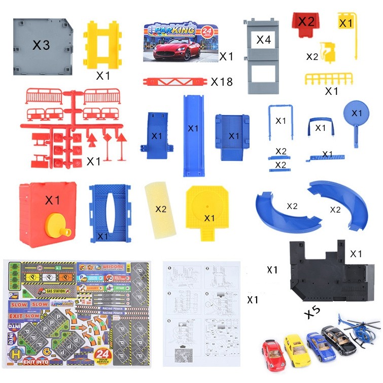 - obsah balenia: 4 autá a vrtuľník, parkovacie garáže, dopravné značky, kužele, prvky vstupnej cesty na parkovisko, výťah a nálepky,
