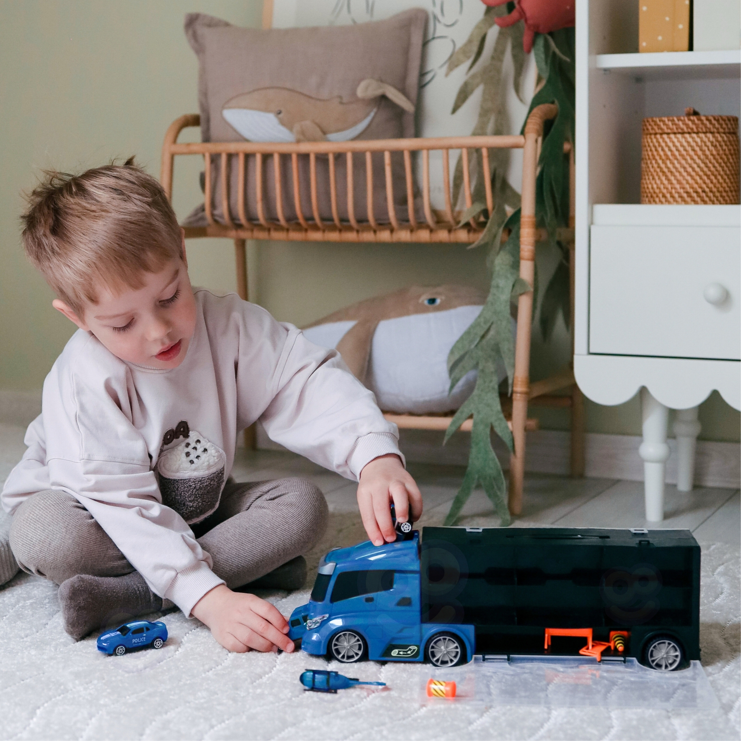 Policajný kamión 3v1 od spoločnosti WOOPIE. Je to dokonalá hračka pre každého malého fanúšika policajných vozidiel, dopravy a akcie! Súprava pozostáva z veľkého prívesu TIR, do ktorého sa zmestia až 4 policajné autá, helikoptéry a sada ďalších dopravných značiek, ktoré dodávajú hre na realite. Vďaka odpaľovaču umiestnenému na prívese môžu deti vysúvať autíčka a strieľať ich na rôzne vzdialenosti. Odťahové vozidlo je dlhé 40 cm, vďaka čomu je dostatočne veľké, aby sa doň zmestili všetky vozidlá a príslušenstvo. Súprava dokonale rozvíja predstavivosť vášho dieťaťa a pomáha vám vytvárať si vlastné herné scenáre. Vďaka dopravným značkám sa môžu naučiť základom bezpečnosti na cestách, vďaka čomu je hra náučná a emotívna.