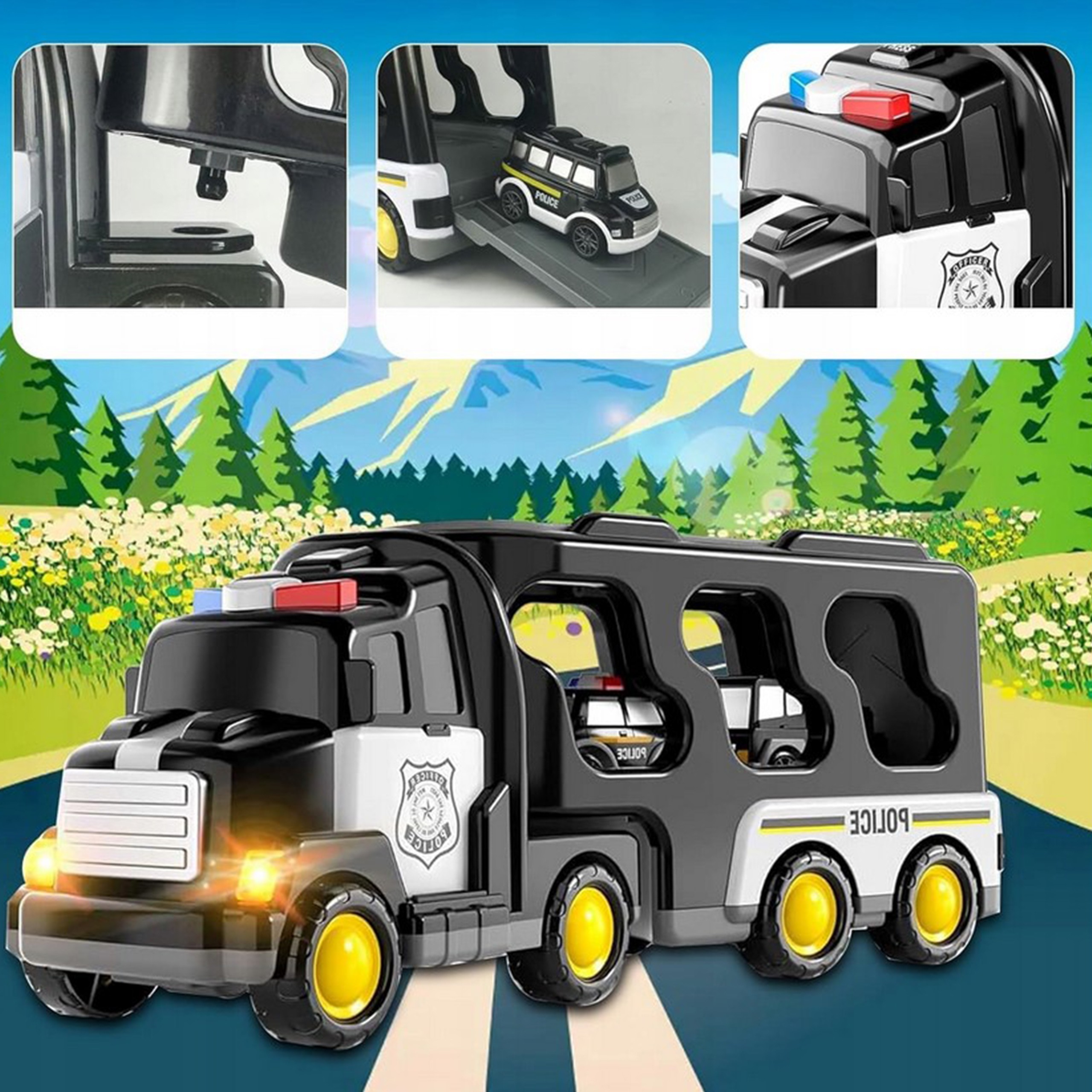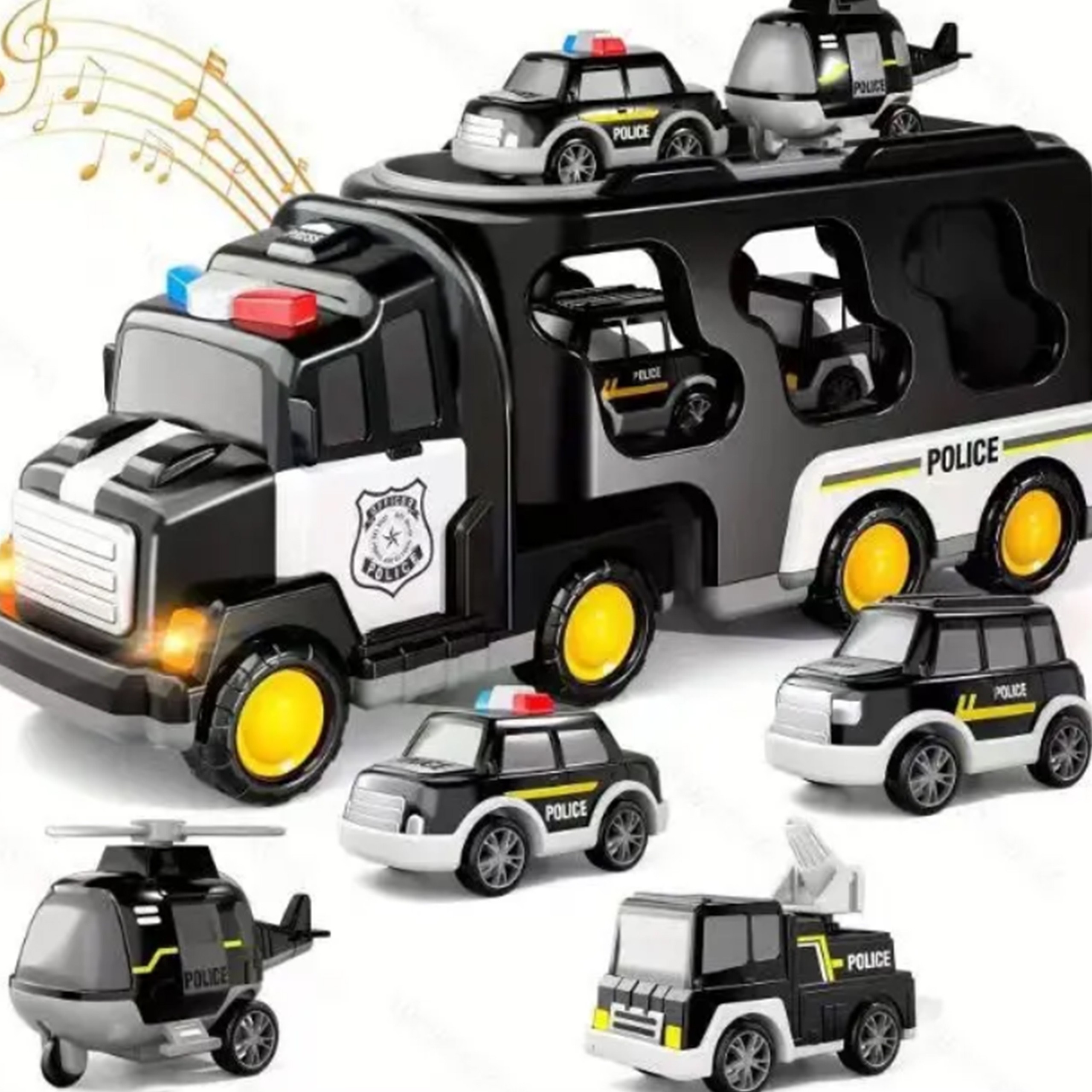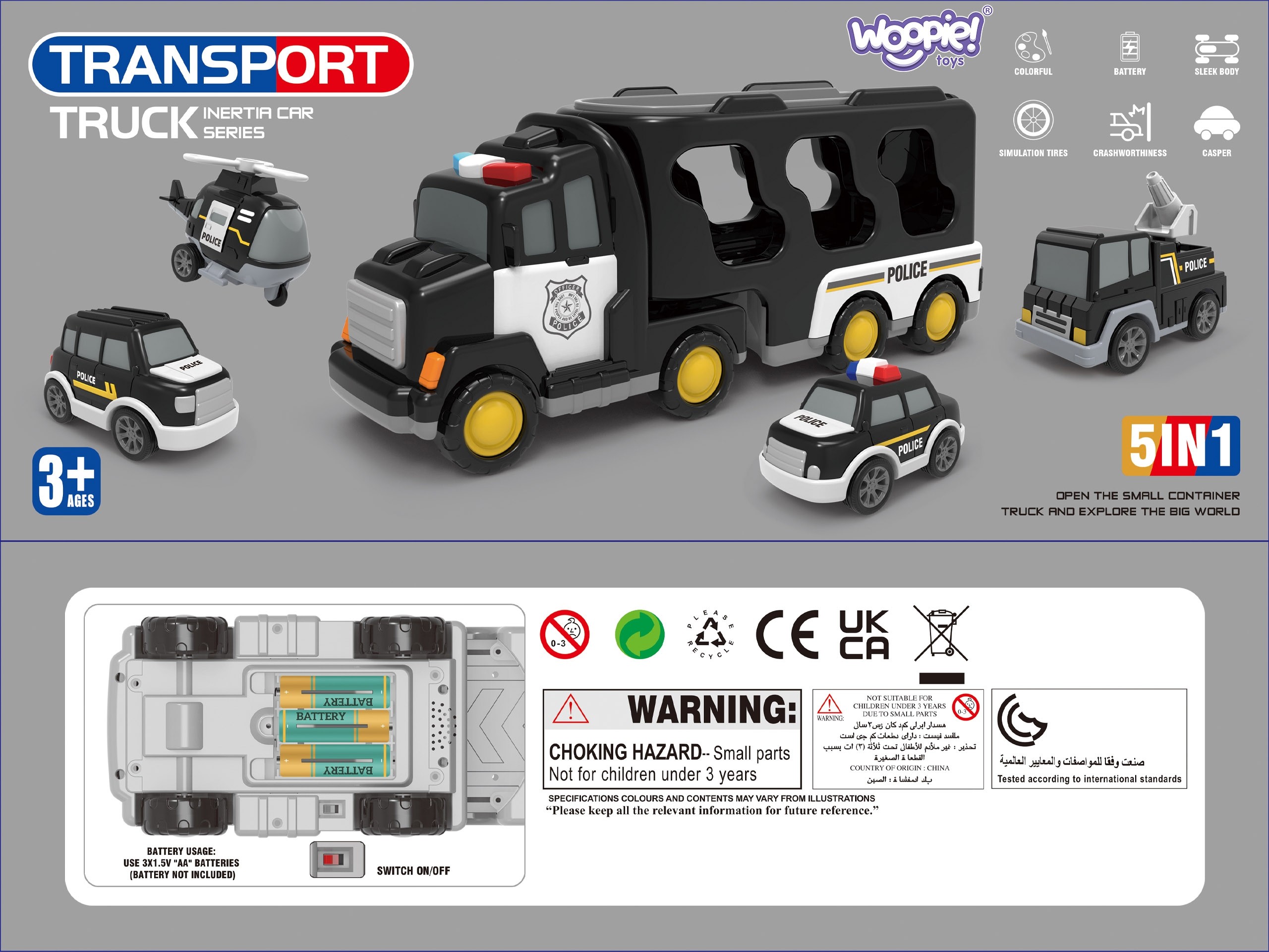 Veľký policajný kamión + 4 autá od spoločnosti Woopie. Táto hračka 5 v 1 navrhnutá pre malých policajných nadšencov je dokonalou súpravou pre každého malého záchranára! Stlačte tlačidlo v hornej časti kabíny nákladného auta, aby ste videli jasné blikajúce svetlá a počuli realistické sirény, veľmi atraktívne pre deti. Sada obsahuje veľké transportné auto a štyri policajné vozidlá: obrnené auto, nákladné auto s vodným delom, helikoptéru a policajné auto. Každé vozidlo má pohyblivé prvky, vďaka ktorým sa bude vaše dieťa počas záchranných operácií cítiť ako skutočný hrdina!
