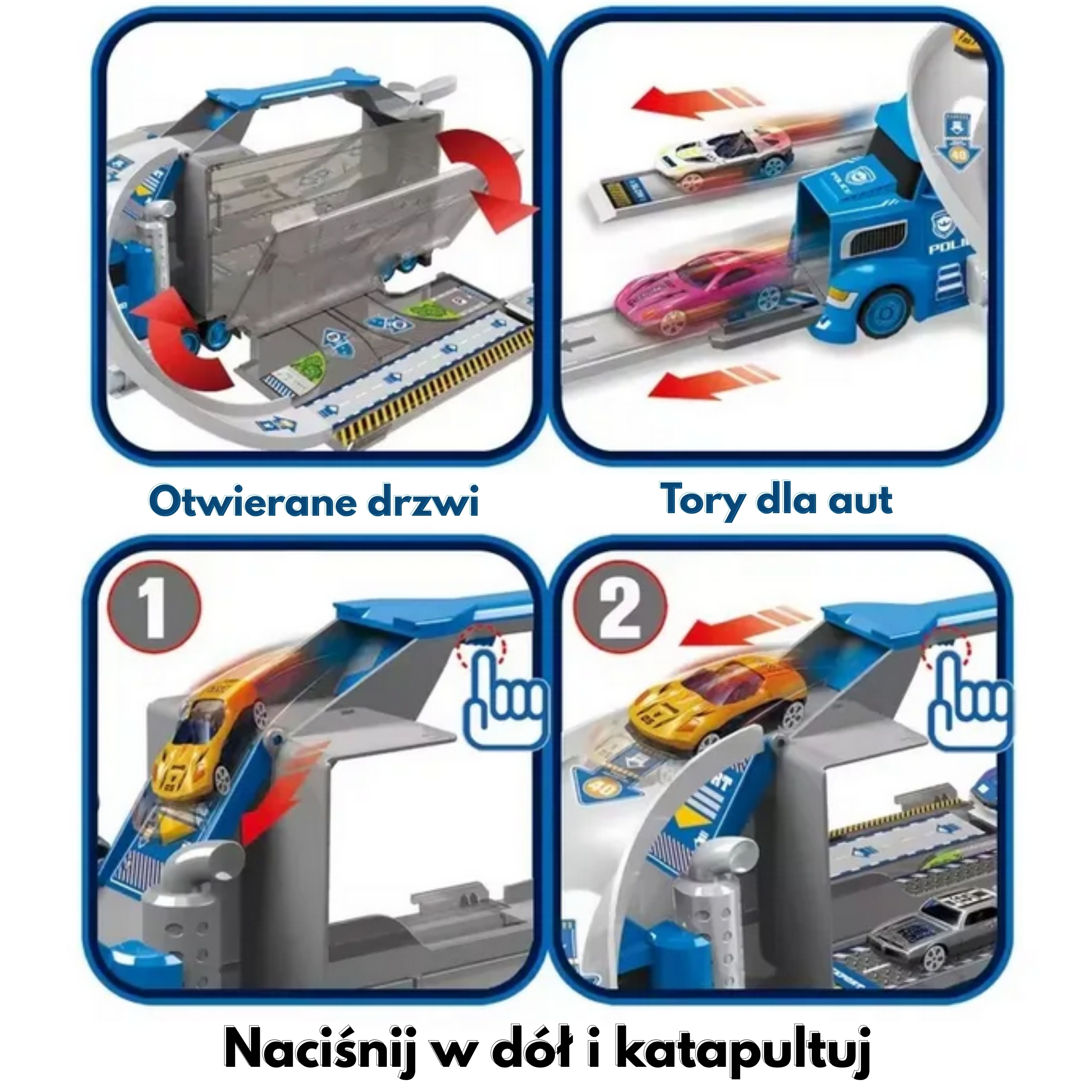Policajné nákladné auto je multifunkčná hračka od spoločnosti Woopie. V jednom okamihu sa dá premeniť na klasické dopravné nákladné auto a po rozložení sa premení na komplexnú pretekársku dráhu s odpaľovacím zariadením. Sredobodom sady je veľké, pôsobivé nákladné auto štylizované podľa policajného vozidla, ktoré slúži ako prepravné vozidlo aj prenosný kufor na autá a príslušenstvo. Po otvorení prívesu a rozložení komponentov získa používateľ prístup do garáže a na pretekársku dráhu, kde je možné organizovať vzrušujúce preteky a automobilové súboje.