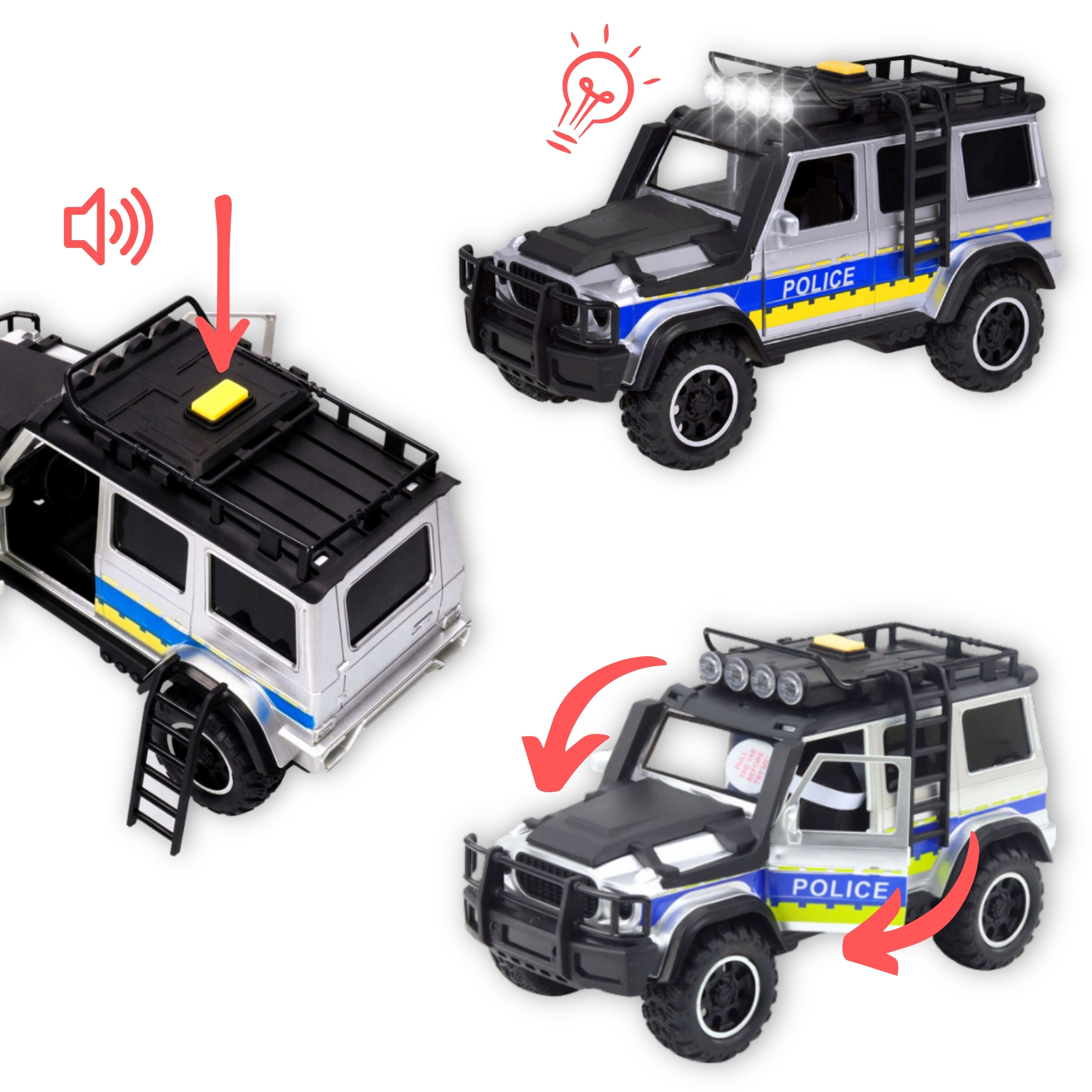 Interaktívny policajný džíp (SUV): Robustné terénne auto je vybavené blikajúcimi majákmi a realistickými zvukmi (napr. siréna, motor). Pre ešte väčšiu autenticitu má otváracie dvere.