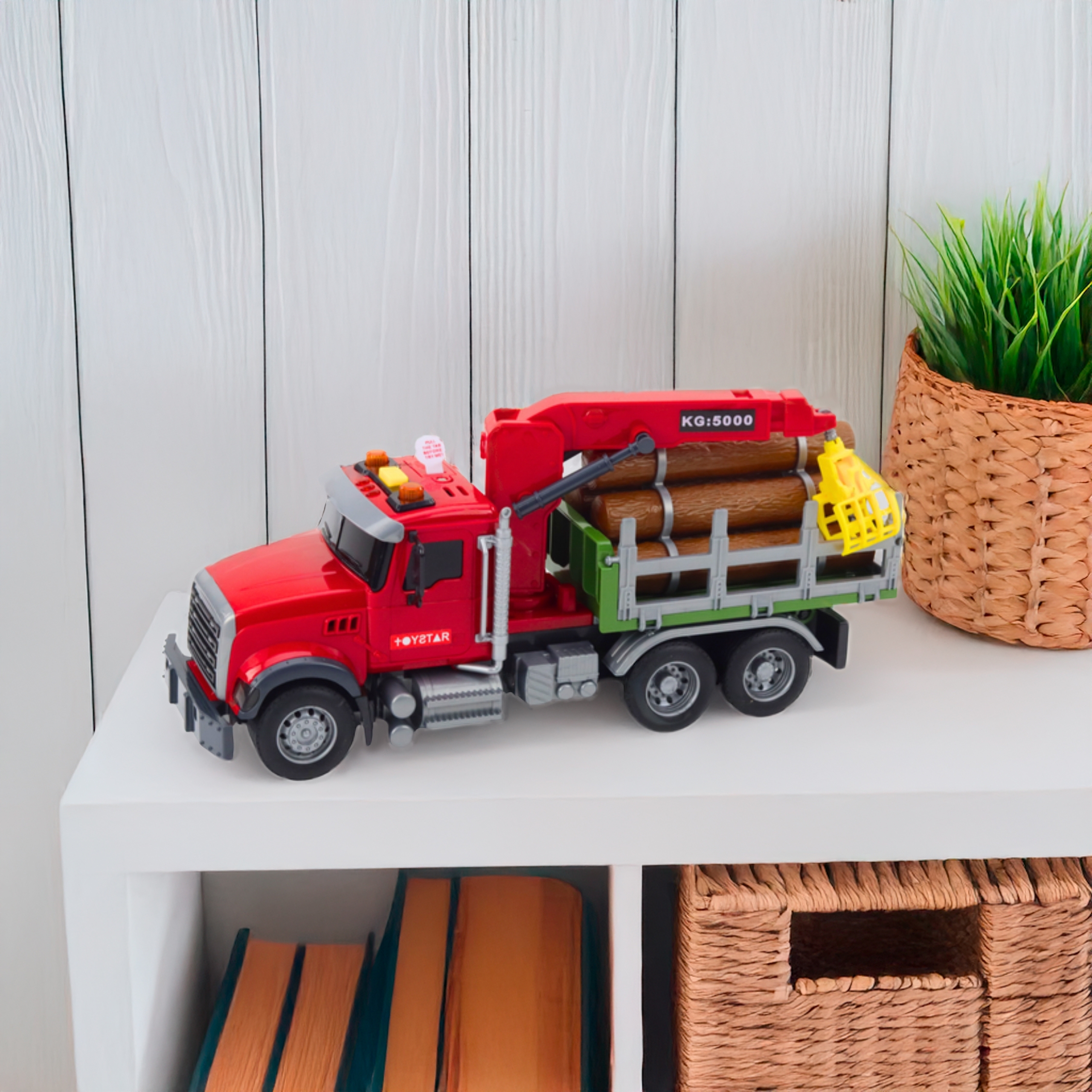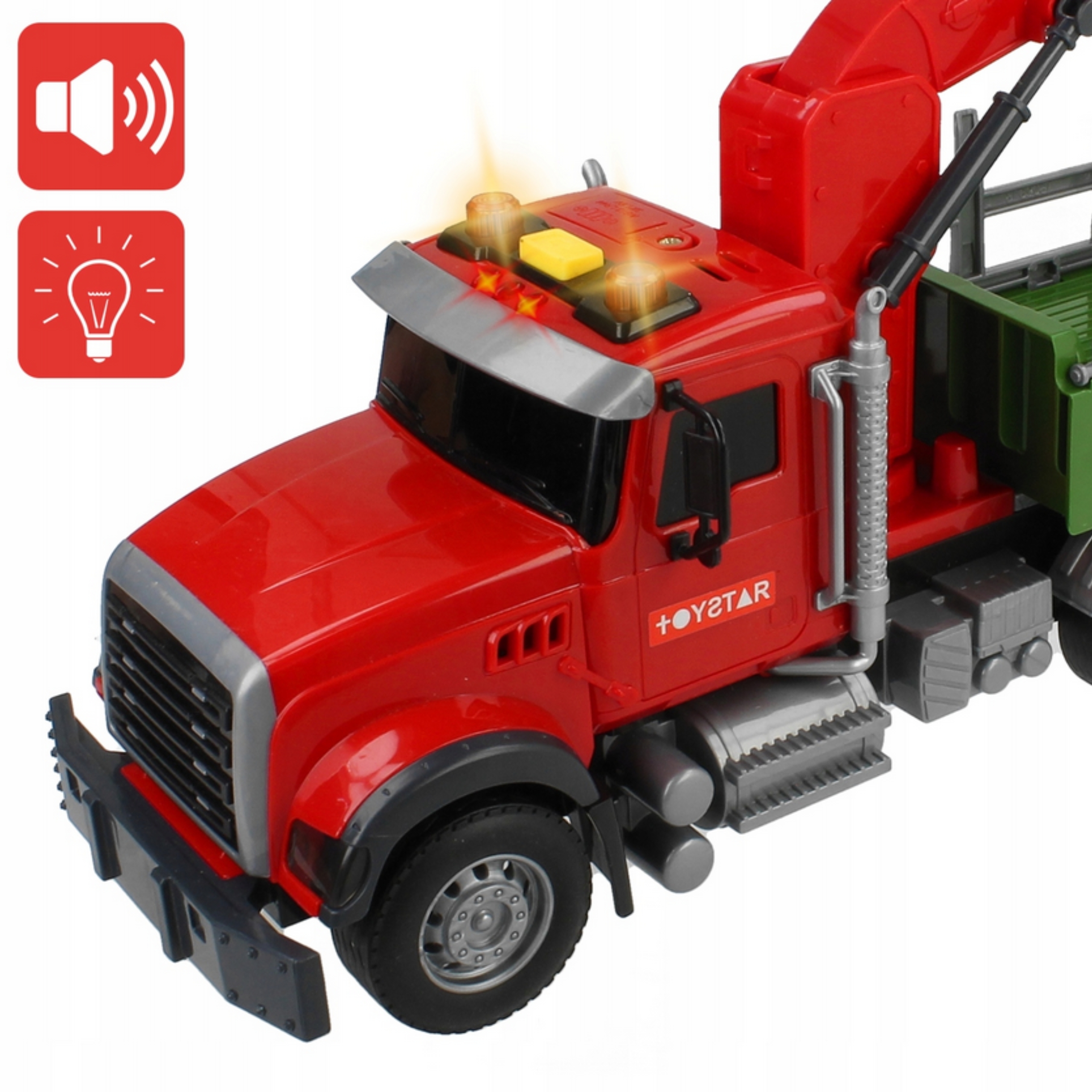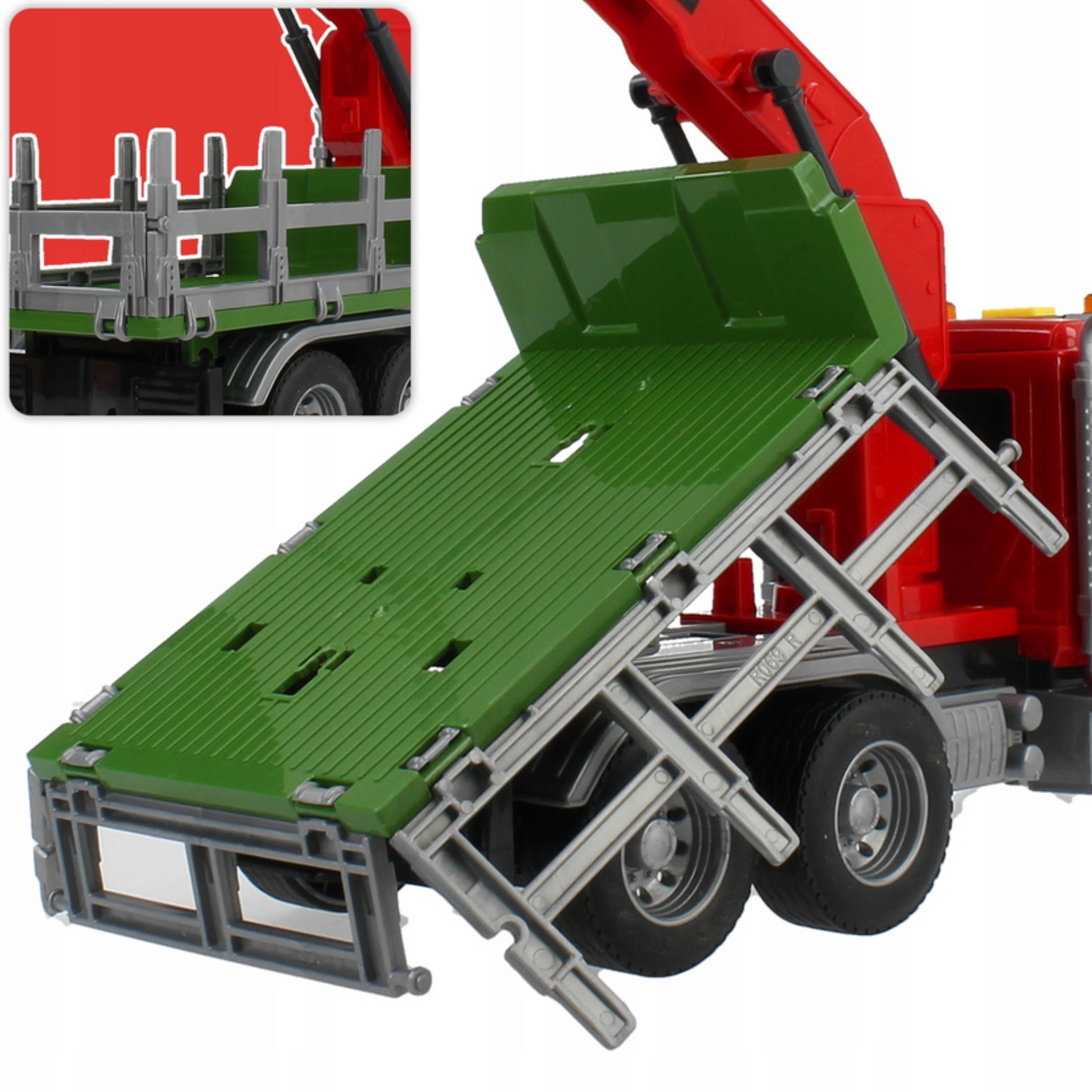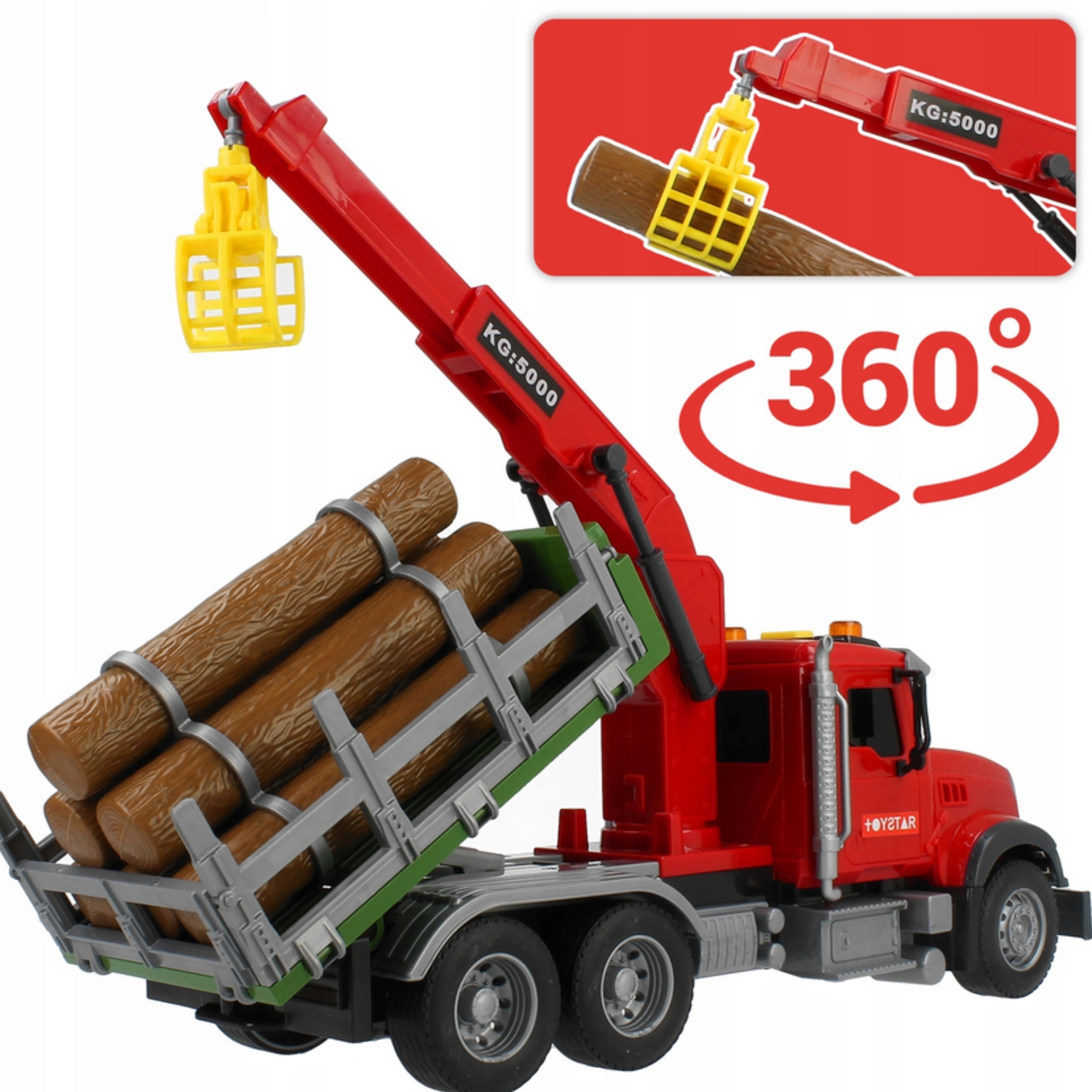 Najväčším lákadlom je plne funkčný, otočný žeriav s mechanickým drapákom, ktorým môže dieťa samo uchopiť, nadvihnúť a naložiť priloženú guľatinu. Hra ožíva po stlačení tlačidiel na kabíne – aktivujte blikajúce výstražné majáky a 3 realistické zvuky (motor, klaksón, zvuk stroja). Vďaka pohonu na zotrvačník ("push-and-go") stačí kamión potlačiť a on sa sám rozbehne vpred!
