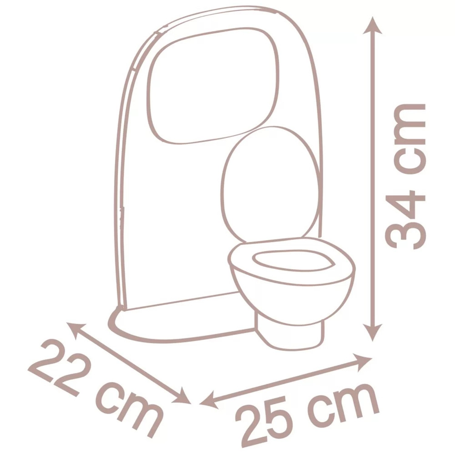 Tento očarujúci záchodík pre bábiky je obojstranný, každá časť z nich ponúka iné možnosti na hranie s bábikou. Na jednej strane sa nachádza pohyblivé WC so záchodovou doskou a otočnou rolkou toaletného papiera a na druhej je umiestnené umývadlo so zrkadlom a pohár so zubnou kefkou. Súprava nábytku pre bábiky je v odtieňoch púdrovej ružovej farby, ktorá pritiahne pozornosť dieťaťa.