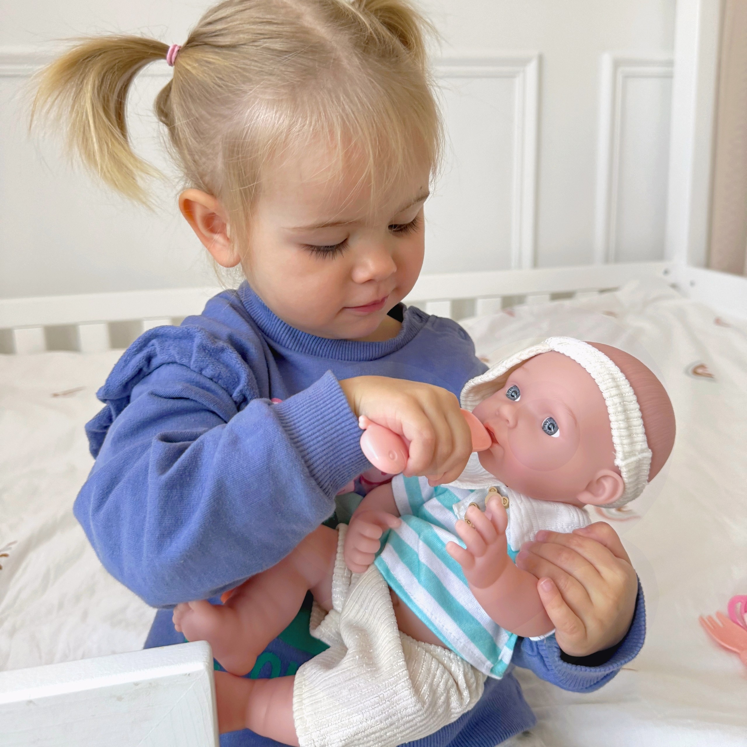 Detská súprava na starostlivosť o bábiky je mimoriadna hračka vytvorená pre deti, ktoré sa chcú hrať na dospelých. Bábika dlhá 30 cm je starostlivo vyrobená z mäkkej gumy, ktorá zaisťuje jemnosť a potešenie na dotyk. Jej ruky, nohy a hlava sú otočné, čo umožňuje rôzne polohy pri hre a má aj odnímateľné oblečenie, vďaka ktorému môžu deti bábiku kreatívne obliekať a vyzliekať. Sada obsahuje všetko potrebné príslušenstvo na starostlivosť o bábiku. Nájdete tu súpravu na kŕmenie, prebaľovanie a hranie. Na prechádzky sa oplatí brať bábiku a ruksak s nosičom, ktorý deťom umožní byť pri hre ešte integrovanejší a kreatívnejší.