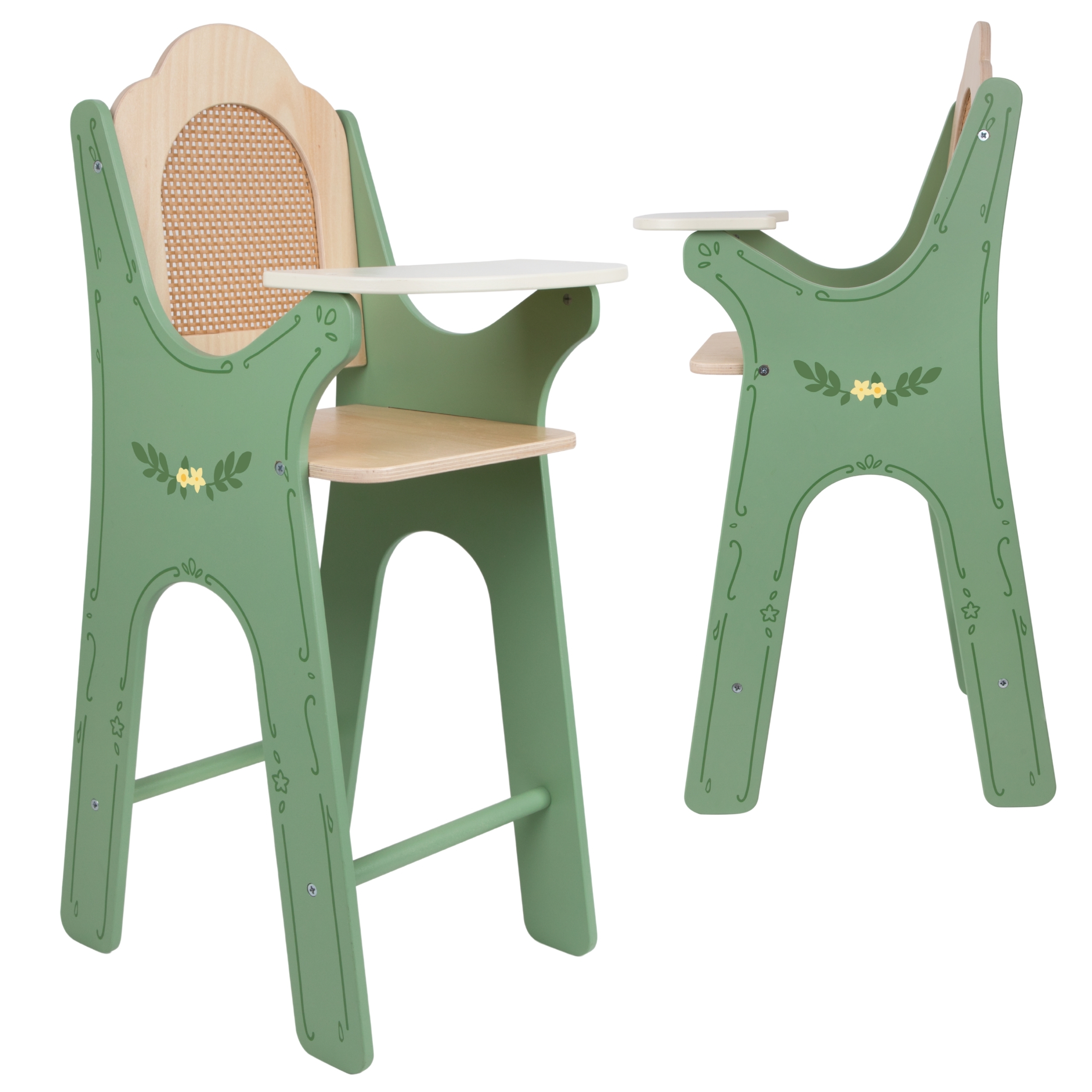 Táto elegantná detská stolička je perfektným doplnkom k starostlivosti o bábiky. V zelených tónoch s jemnými kvetinovými dekoráciami a odkazuje na klasický vintage štýl. Prírodný ratanový výplet v operadle mu dodáva jedinečné čaro a autentický vzhľad. Je ideálna na tematické hry, rozvíja empatiu a predstavivosť dieťaťa.