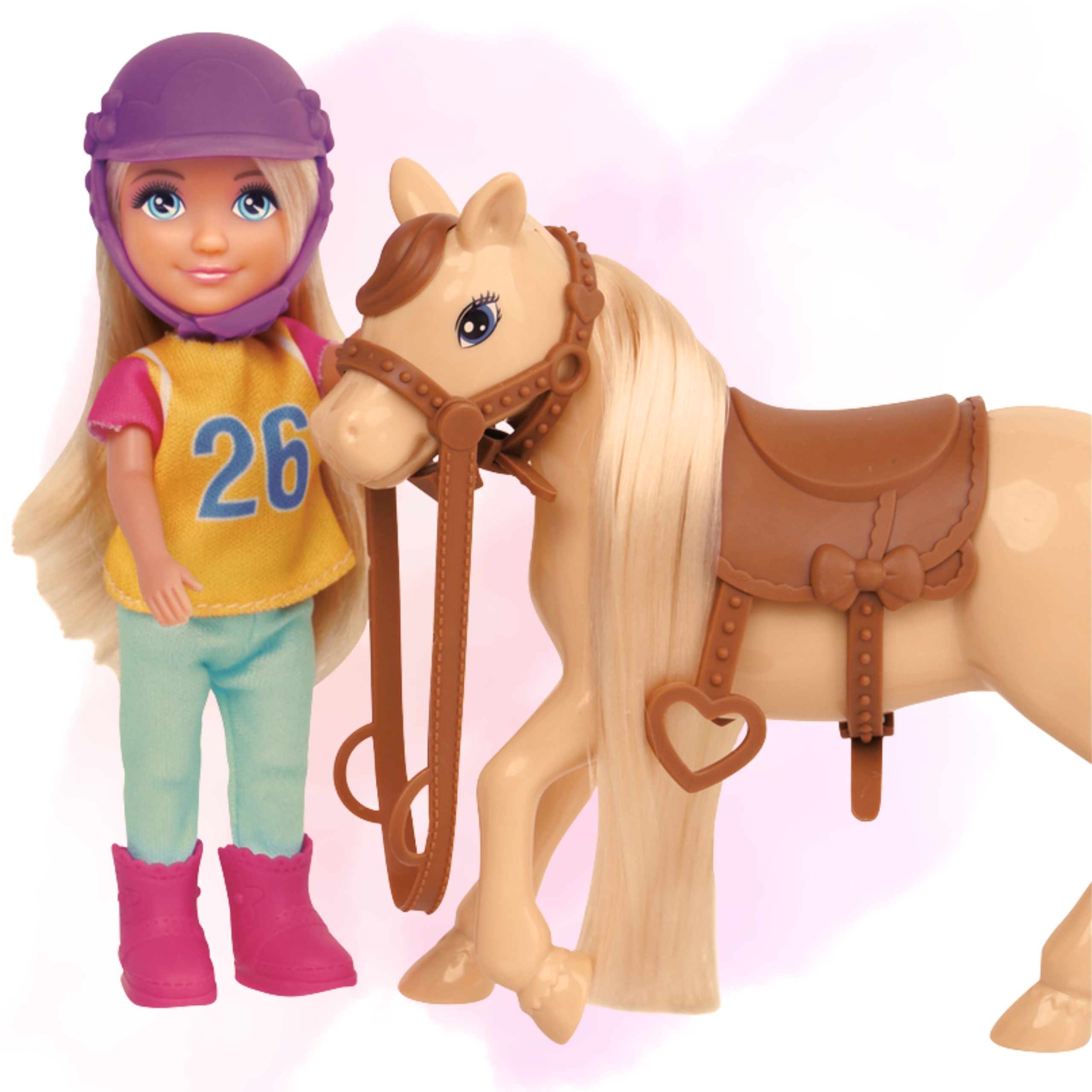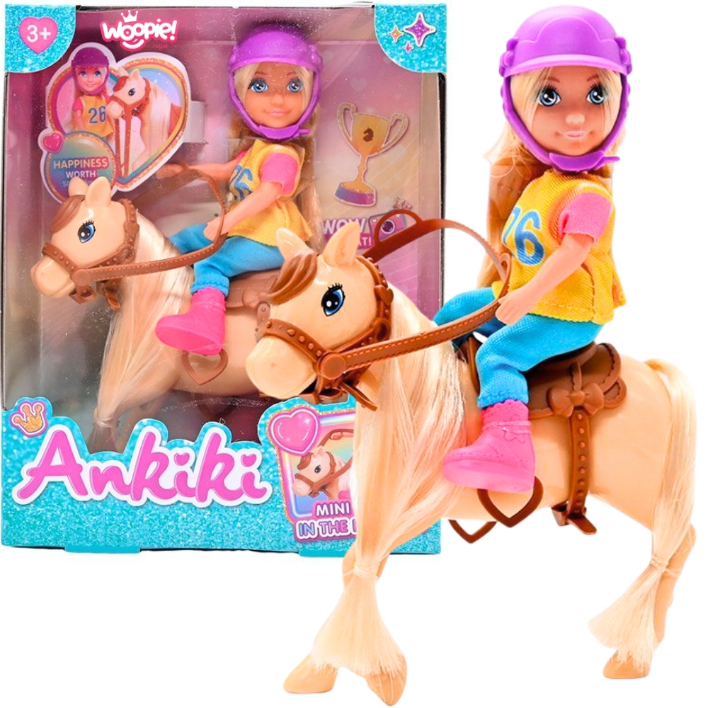 Bábika Ankiki je oblečená v štýlovom jazdeckom oblečení a pre maximálnu bezpečnosť má na hlave fialovú prilbu. Je pripravená na náročný tréning a veľké preteky! Jej verný hnedý kôň s dlhou svetlou hrivou a chvostom má odnímateľné sedlo a uzdu. A po víťaznom preteku ich čaká zaslúžená odmena – zlatý pohár (trofej)! Nezabudnite odfotiť víťazný moment priloženým fotoaparátom.