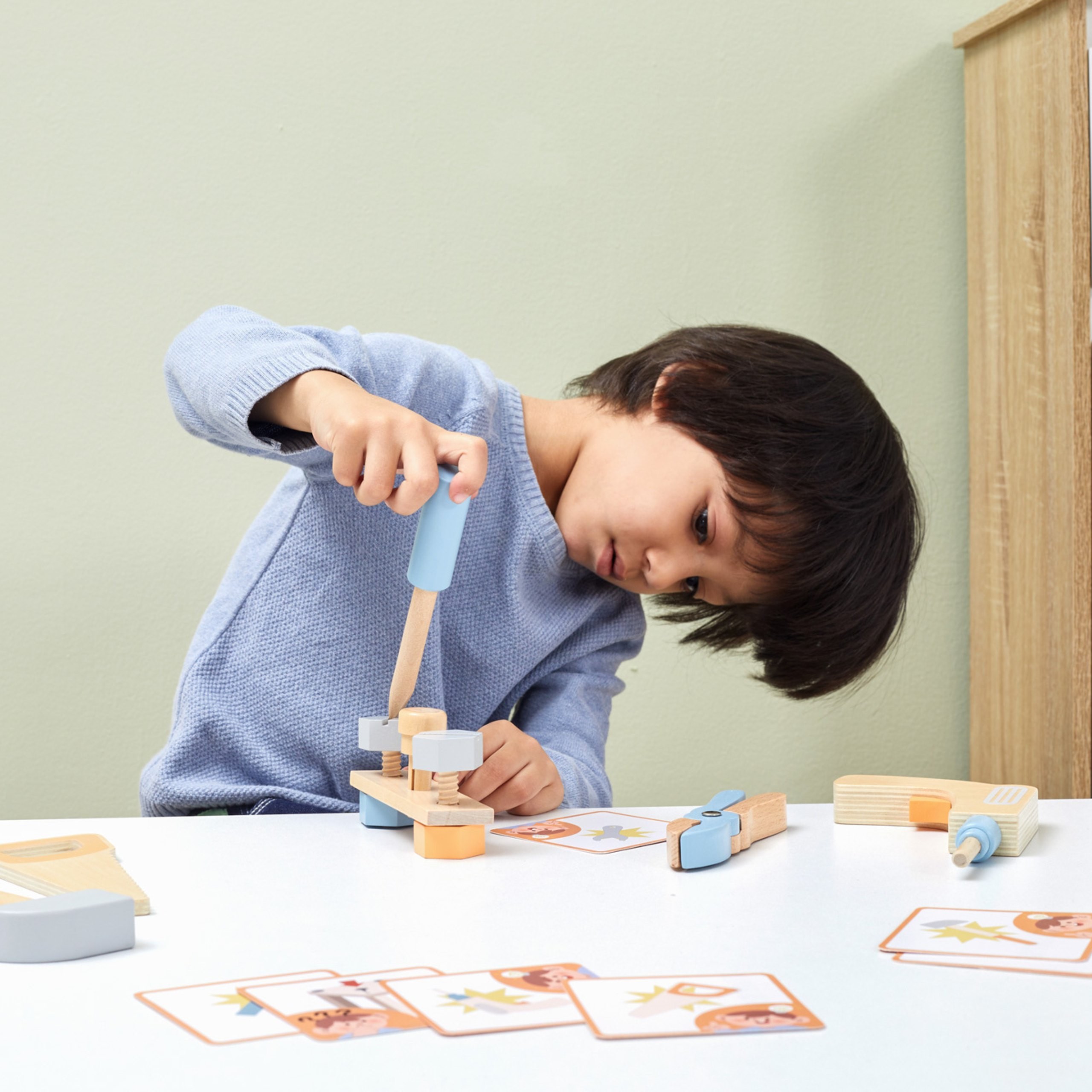 Samotné majstrovanie je pre detský vývoj doslova zlatou baňou. Skrutkovanie matíc na závity či zatĺkanie "klincov" do pripravených otvorov je úžasným tréningom jemnej motoriky, štipcového úchopu a dôležitej koordinácie oko-ruka. Dieťa pri hre zapája priestorové vnímanie a učí sa, ako do seba jednotlivé dieliky zapadajú. Tento typ hrania rolí (role-play) navyše obrovsky buduje detské sebavedomie – veď práve oni sú teraz tými dôležitými opravármi, ktorí dokážu všetko spraviť!