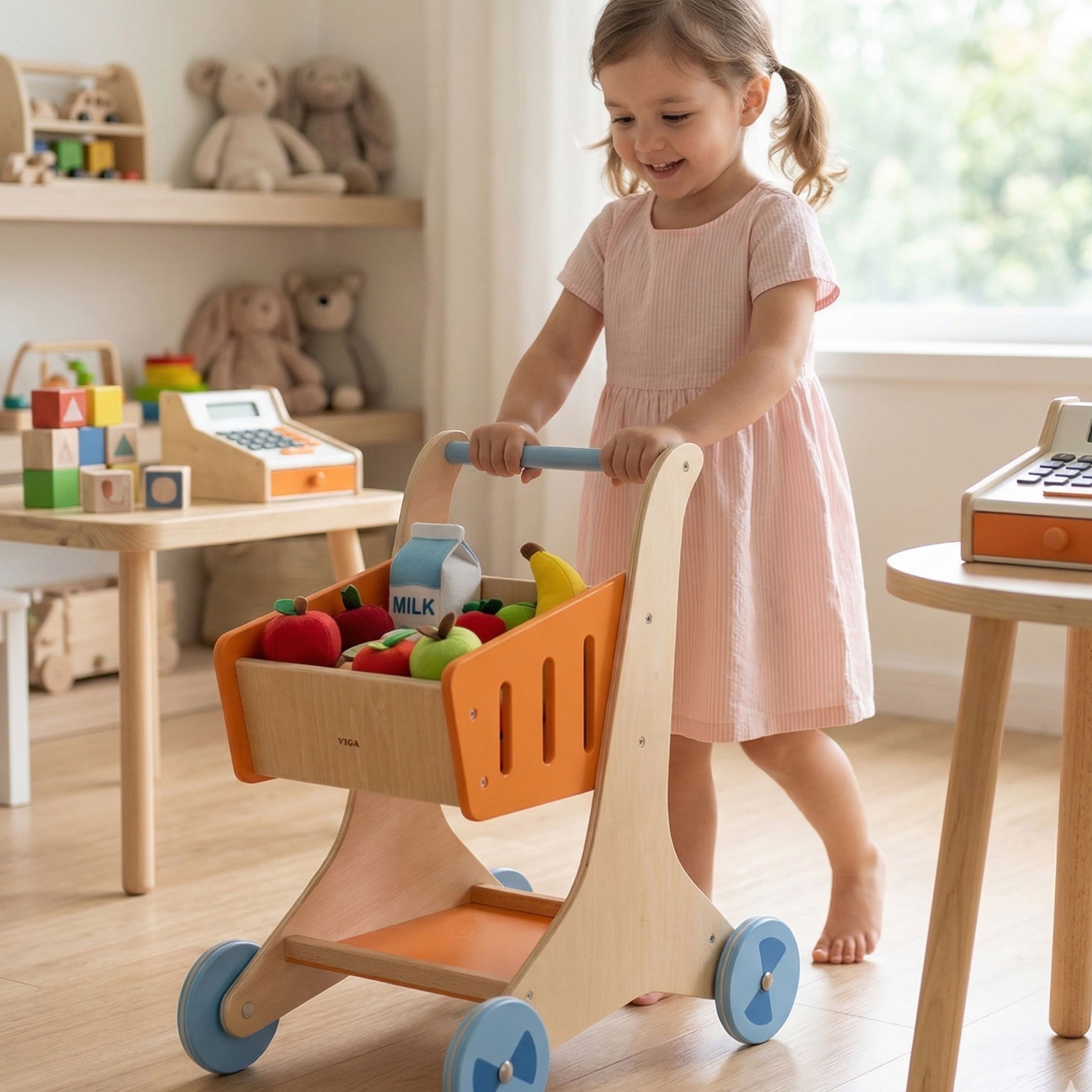 Priestranný celodrevený kôš tvorený pevnými lamelami a praktická spodná polička poskytujú dostatok miesta na nákupy, plyšové hračky či drevenú zeleninu. Táto rolová hra (pretend play) fantasticky stimuluje detskú fantáziu a rozširuje slovnú zásobu. Vďaka kvalitným kolieskam s gumeným lemom je pohyb vozíka úplne tichý a stopercentne šetrný k vašim podlahám.