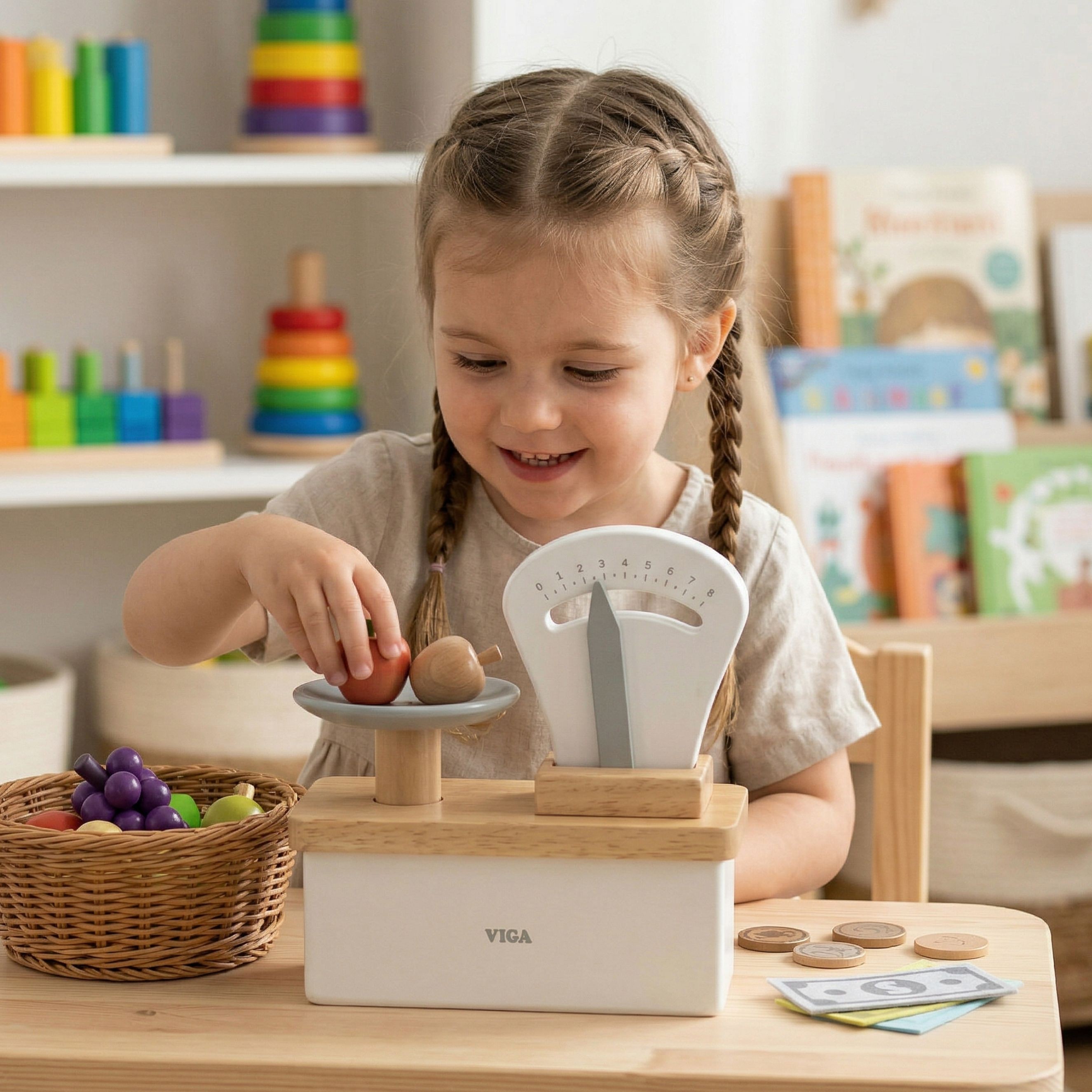 Drevená obchodná váha od spoločnosti Viga Toys je jednou z popredných hračiek, ktorá umožní vášmu dieťaťu vstúpiť do sveta zaujímavých a tvorivých hier.