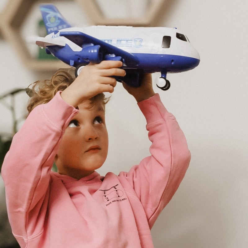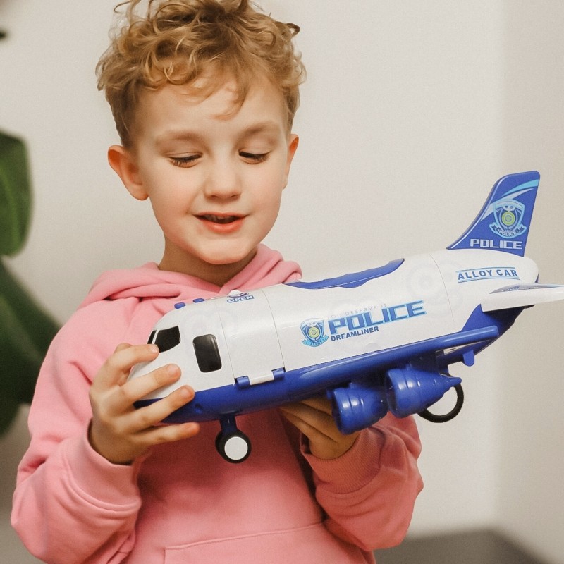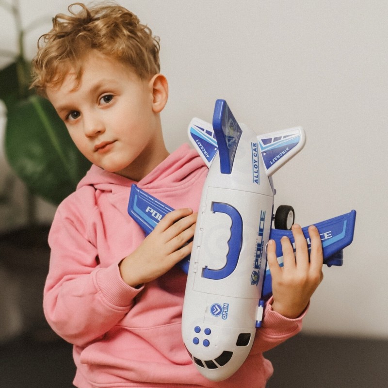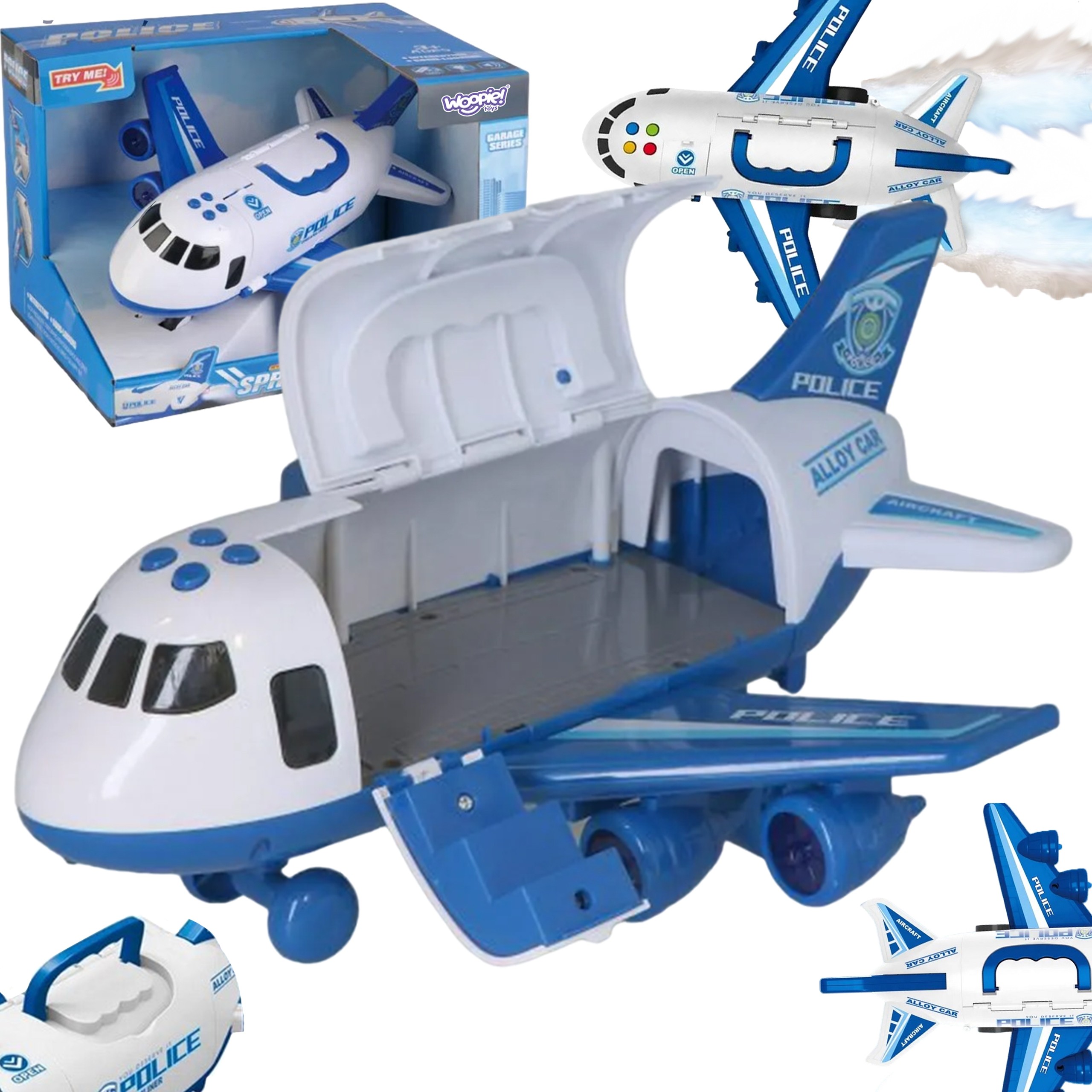 Interaktívne policajné lietadlo od spoločnosti WOOPIE určite poteší každého malého akčného fanúšika! Lietadlo bolo určené na prepravu vozidiel vďaka špeciálne upravenému nákladnému priestoru, do ktorého sa zmestia 3 autá zahrnuté v súprave. Môžete voziť policajné autá vo vnútri lietadla a prepravovať ich do akcie! Otváracia strana lietadla a schody vám umožňujú umiestniť autá dovnútra a v zadnej časti lietadla je umiestnená rampa na rýchle opustenie áut. Zvukové a svetelné efekty dodávajú nášmu vzdušnému vozidlu atraktivitu. Štyri tlačidlá vydávajú zvuky policajnej sirény a zvuky streľby spôsobia, že sa vaše dieťa bude cítiť ako na policajnej akcii. Rukoväť v hornej časti hračky vám umožňuje pohodlne sa kĺzať po oblohe.