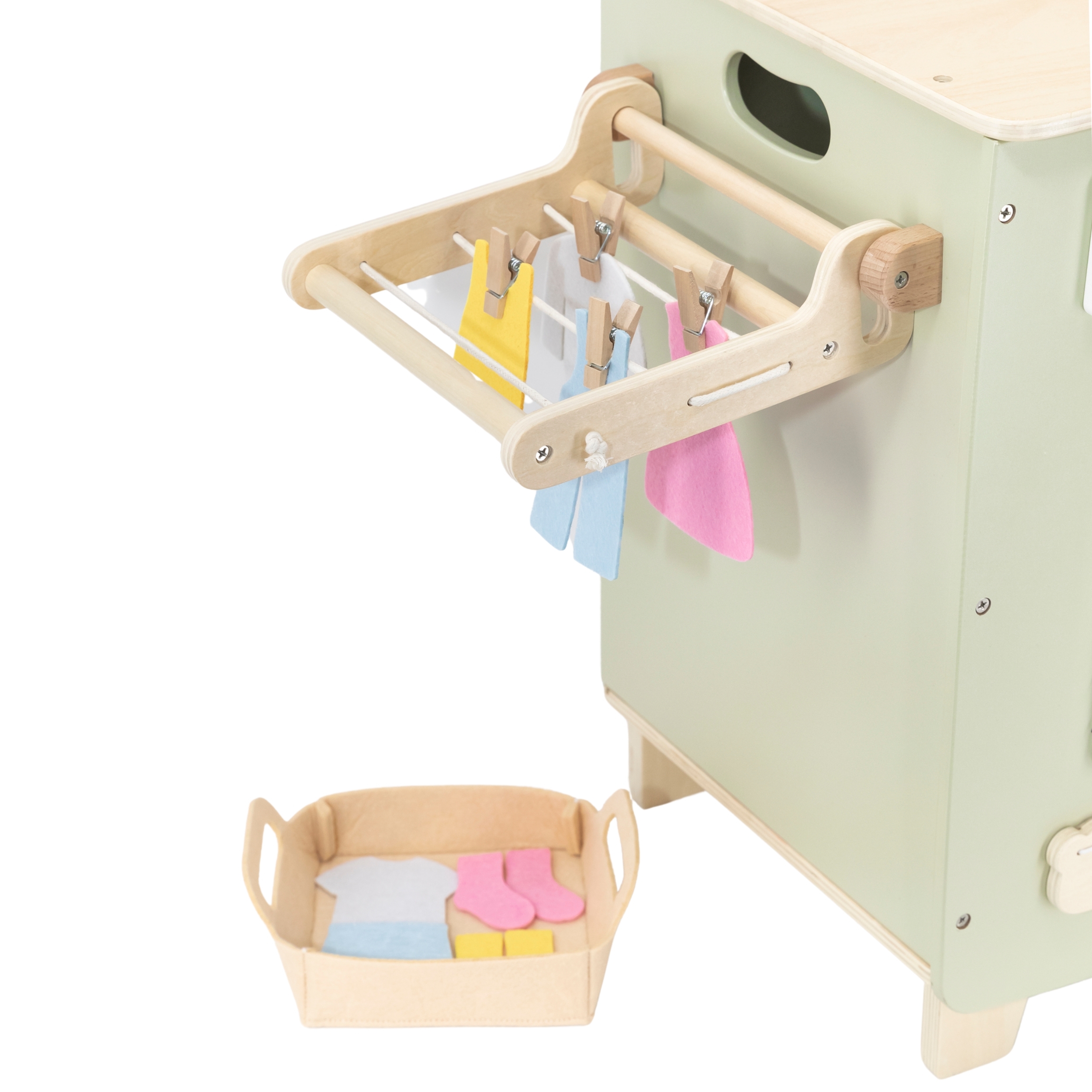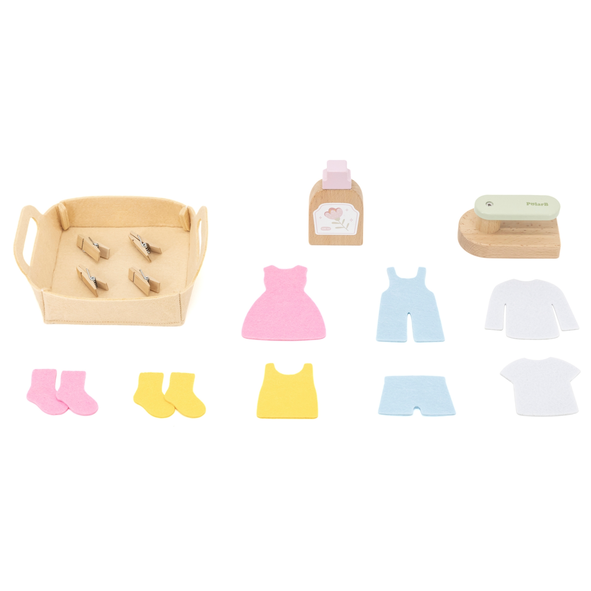 ✔️ Sada obsahuje drevený prací prostriedok, žehličku a kôš na bielizeň na spestrenie zábavy.