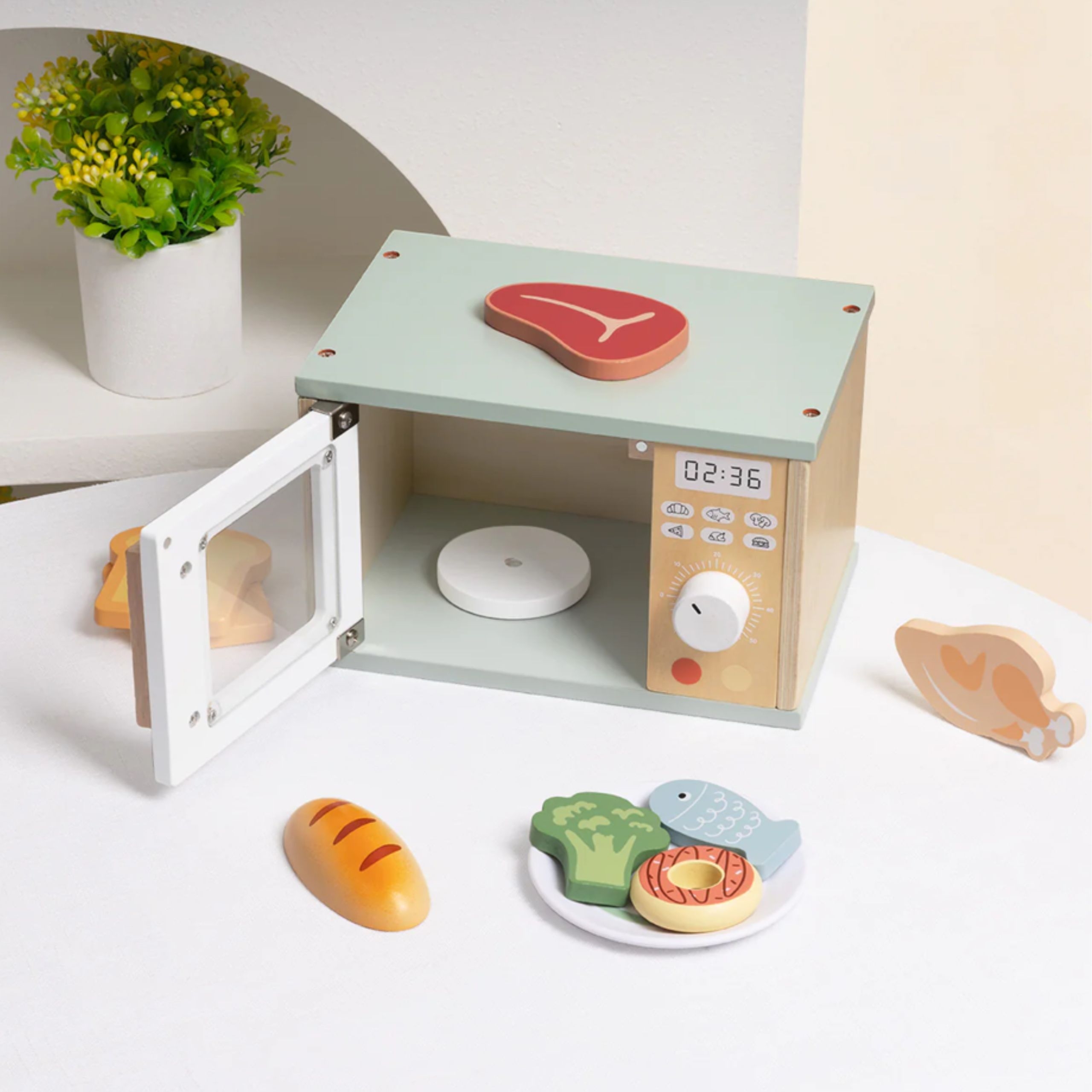 Toto nie je len prázdna mikrovlnka! Je to kompletný balíček na prípravu jedla. Sada obsahuje nielen modernú drevenú mikrovlnku s otváracími dvierkami, ale aj bohatú sadu drevených potravín. Dieťa si môže "ohriať" steak, kurča, rybu, chlieb alebo brokolicu. A ako dezert? Lahodná šiška! Všetko sa dá štýlovo servírovať na priloženom tanieriku.