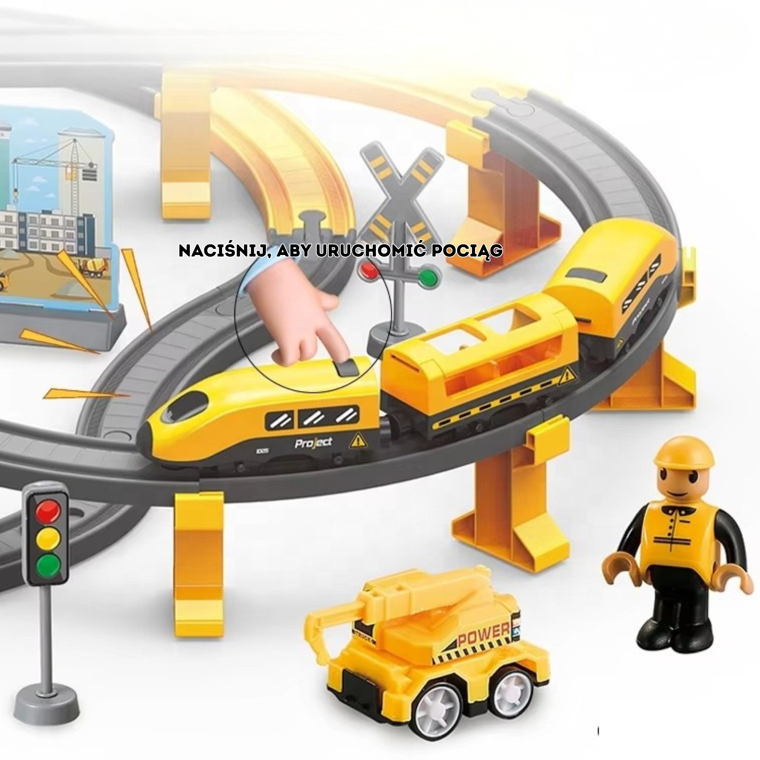Objavte fascinujúci svet dopravy a staviteľstva s Elektrickou vlakovou dráhou Stavenisko (92 ks) od značky WOOPIE! Toto nie je len obyčajný vláčik – je to kompletné veliteľské centrum pre malých konštruktérov od 3 rokov. Sada ožíva vďaka elektrickému žltému expresnému vlaku, ktorý po zapnutí samostatne jazdí po koľajniciach. O realistické zvukové efekty sa postará špeciálny diel koľajníc, ktorý pri prejazde vlaku aktivuje zvuky!
