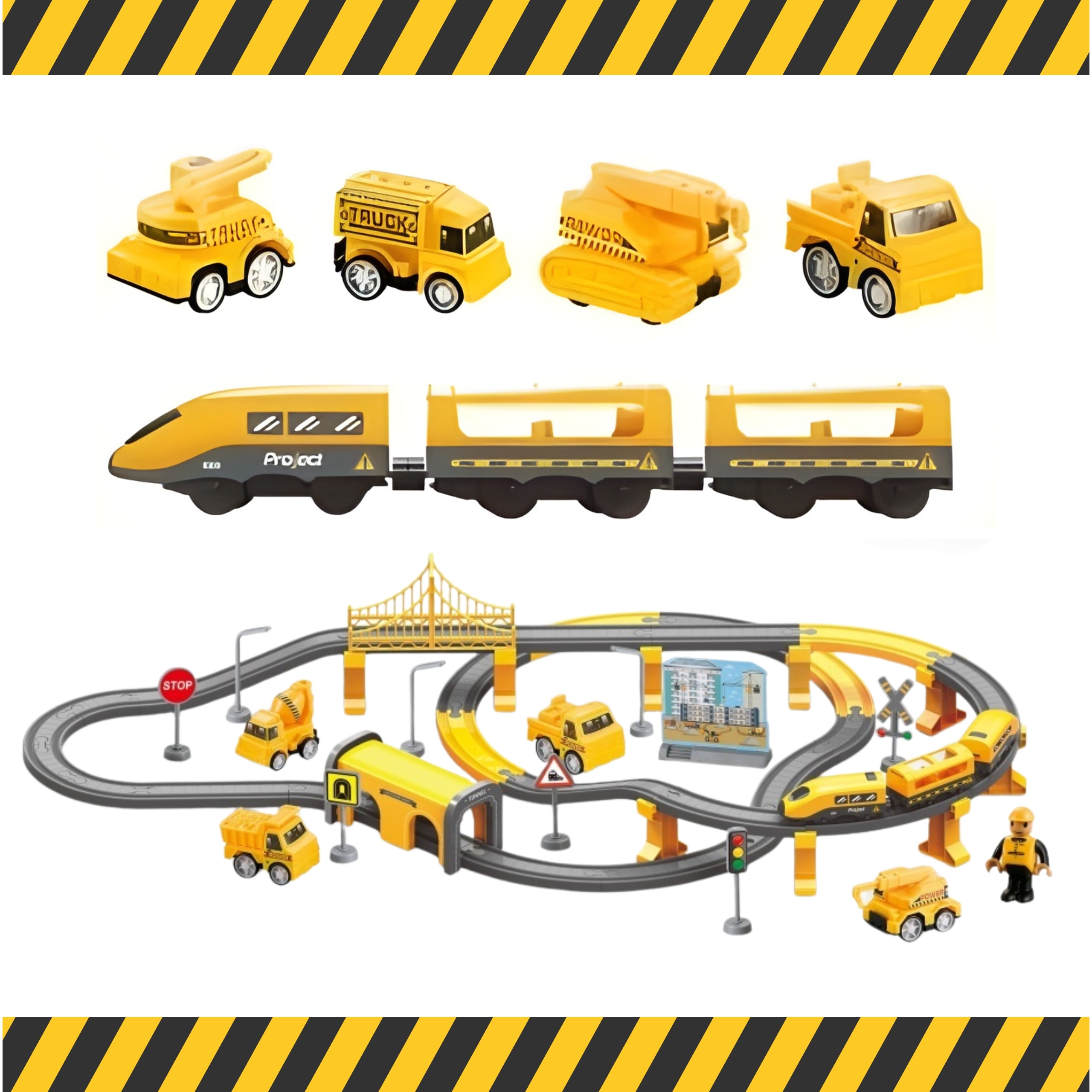 🏗️ Bohaté príslušenstvo pre komplexnú hru: Vláčik, koľaje, most, tunel, stanica, stavebné autá, figúrka, značky – všetko, čo potrebujete pre hodiny nápaditej hry.