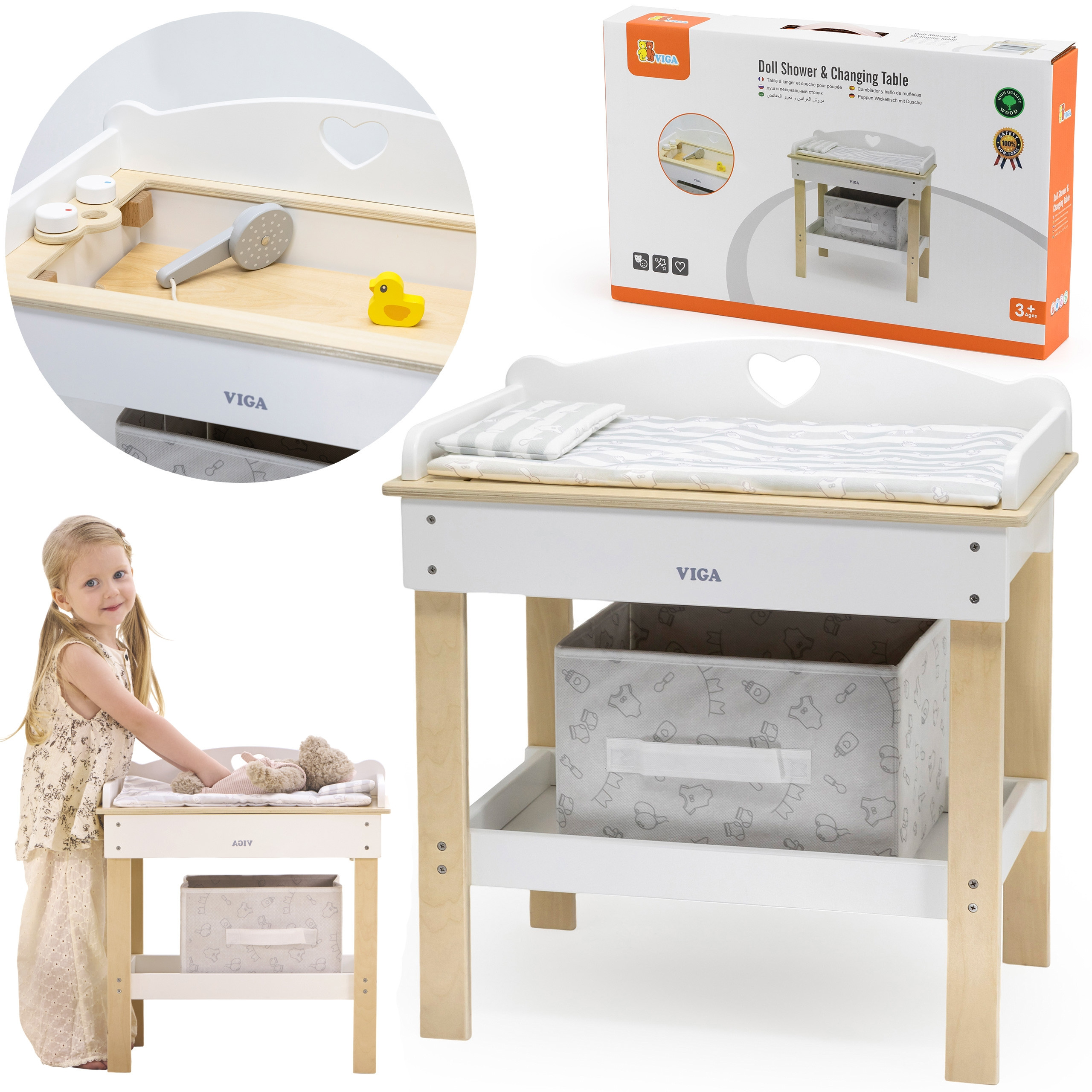 Drevený prebaľovací pult 2 v 1 od spoločnosti VIGA, ktorý v sebe spája funkcie prebaľovacieho pultu a vaničky pre bábätká. Prebaľovací pult má pohodlný, rovný povrch na hornej doske, ideálny na hranie. Polica umiestnená pod prebaľovacím pultom je praktickým miestom na uloženie príslušenstva, nachádza sa na nej látkový kôš, ktorý poskytuje ďalší priestor pre bezpečné uloženie predmetov. Ak sa používa ako vaňa, odstráňte hornú dosku a nainštalujte batériu a sprchovú hlavicu. Pevná drevená konštrukcia zaručuje stabilitu a bezpečnosť pri hre. Drevený prebaľovací pult 2 v 1 značky Viga je nielen praktickým kusom nábytku, ale aj výbornou hračkou, ktorá rozvíja detskú fantáziu.