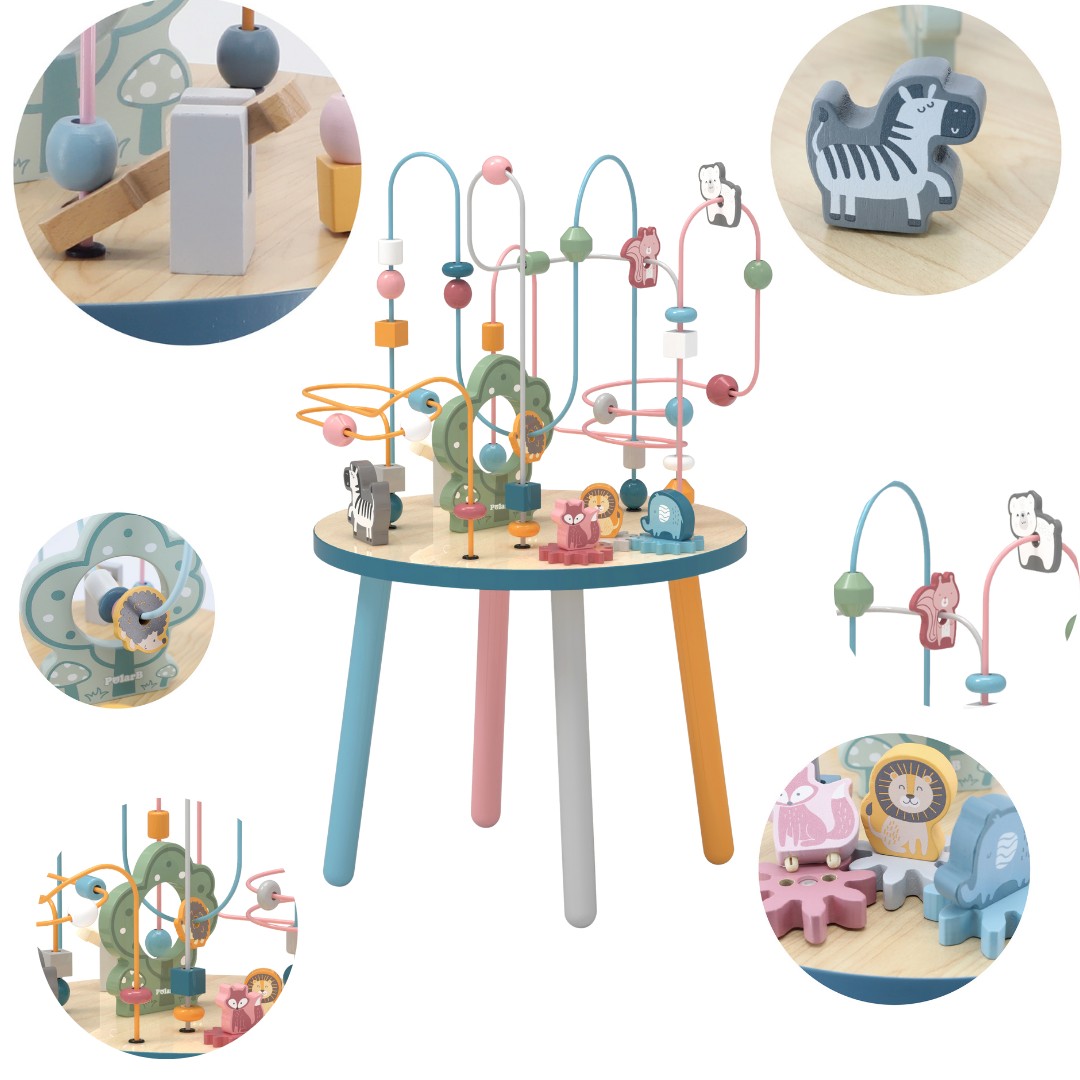 Drevený vzdelávací stôl poskytne deťom veľa zábavy a počas hry si deti precvičia manuálne zručnosti a vnímanie farieb a tvarov. Na kovových slučkách sú umiestnené drevené, farebné bloky a tri bloky s obrázkami- plyšového medvedíka, líšky a ježka. Dieťa môže pohybovať blokmi akýmkoľvek spôsobom pri precvičovaní pohybov prstov a rúk.