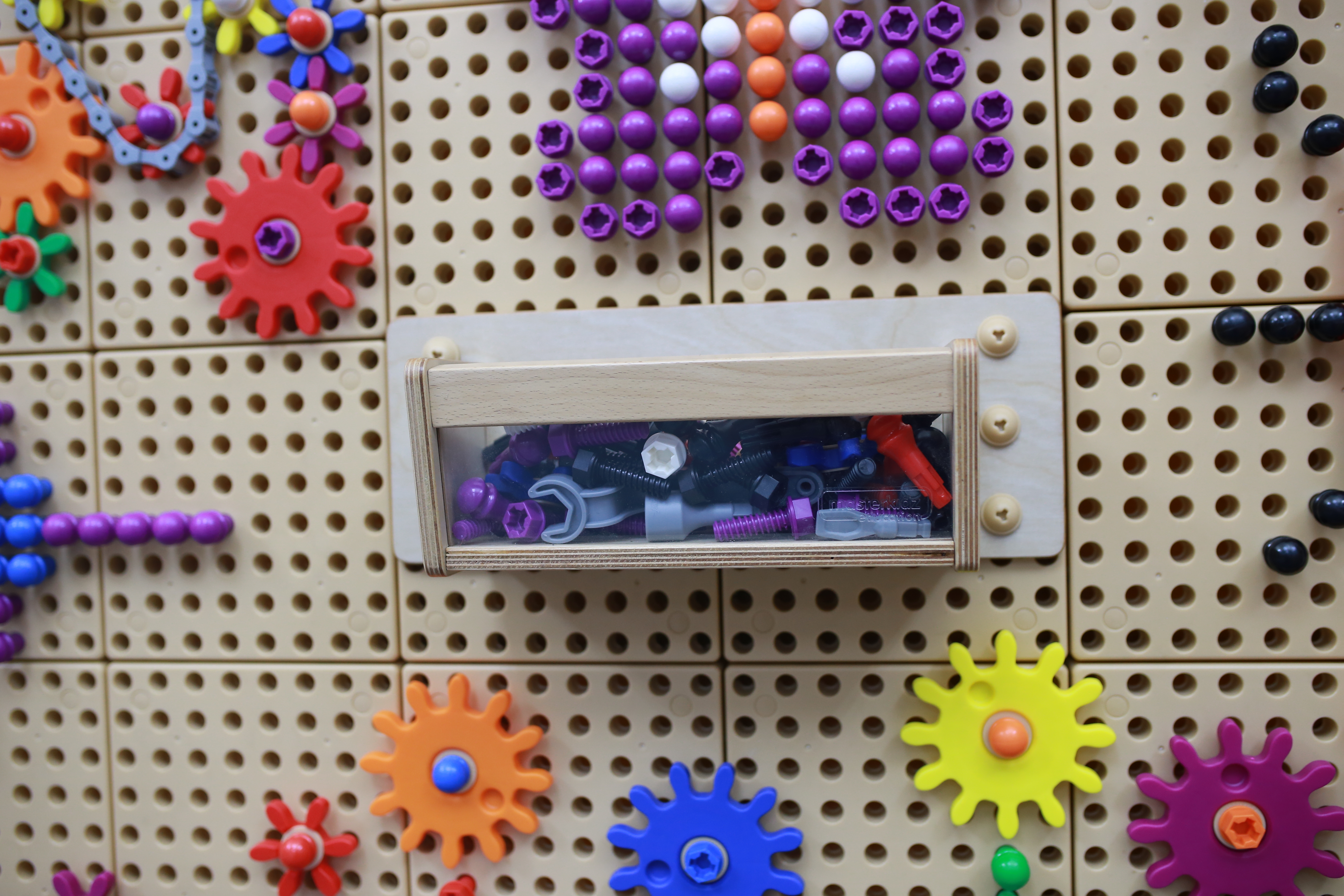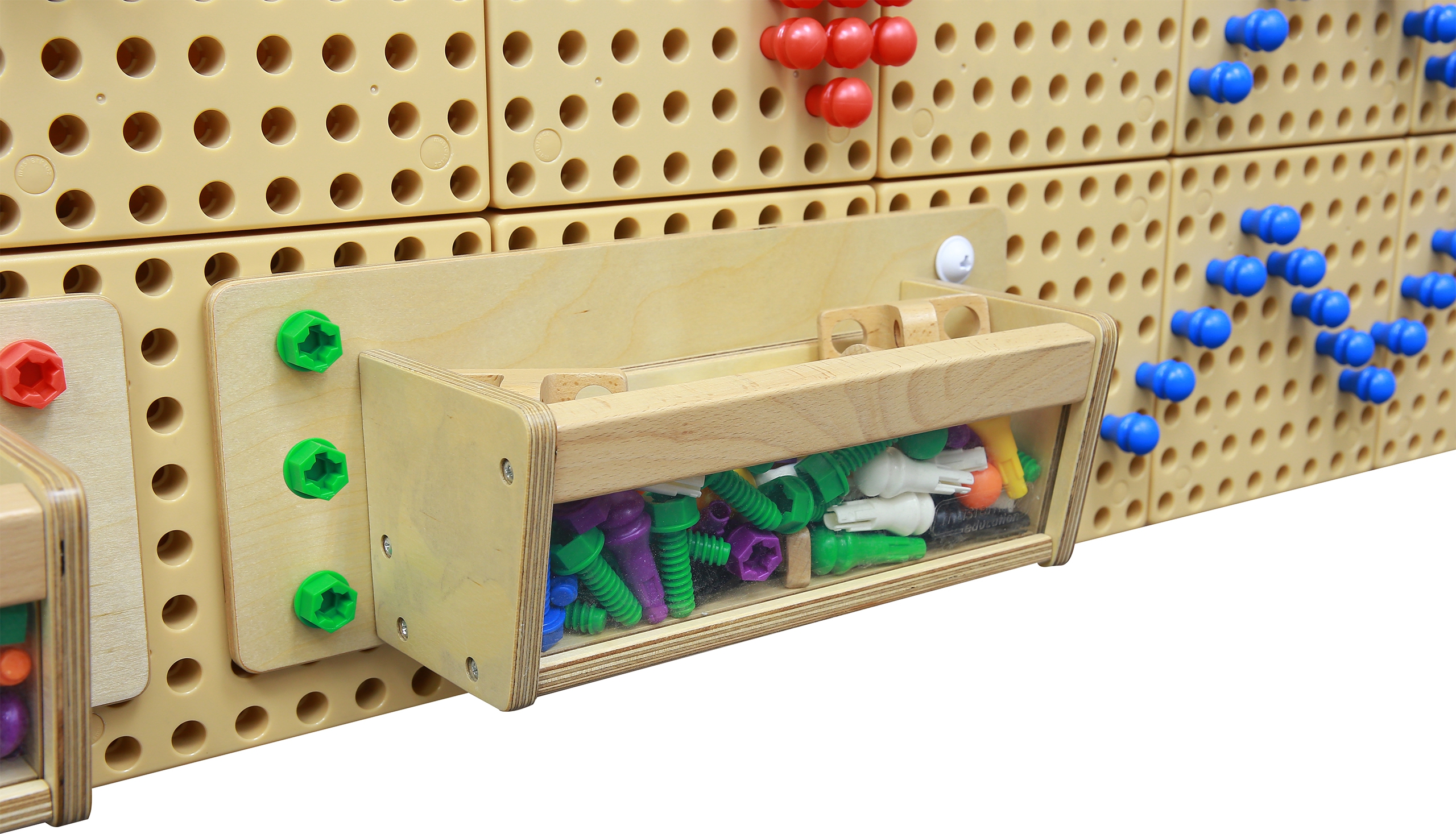 - Kontajner sa upevňuje pomocou skrutiek Masterkidz priamo na stenu STEM, vďaka čomu ho zvládne namontovať kdekoľvek na tabuľu aj dieťa.