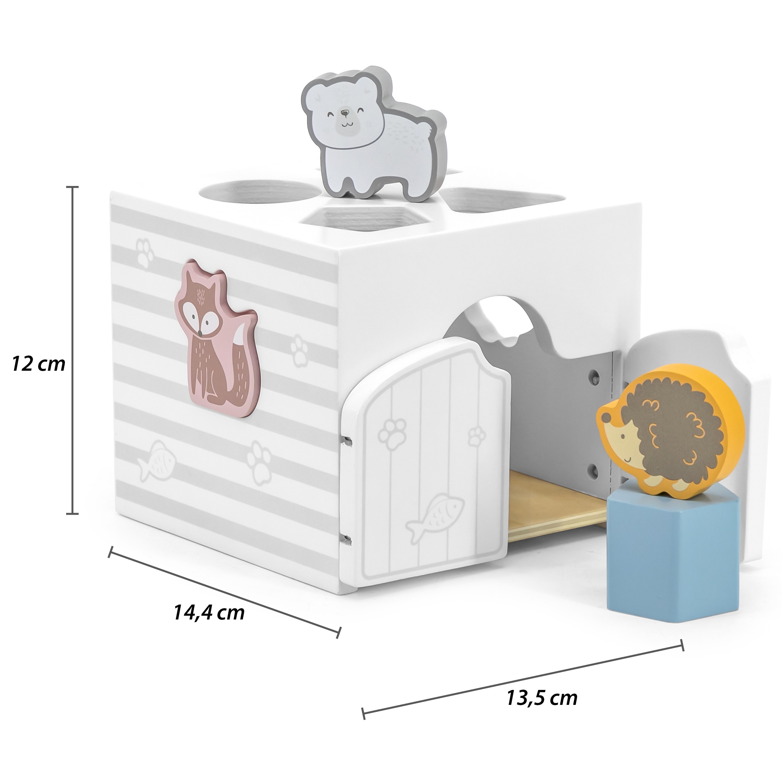 - obsahuje 7 blokov rôznych tvarov - 3 základné geometrické tvary s rôznymi zvukmi, 3 v tvare zvierat a jeden so zrkadlom