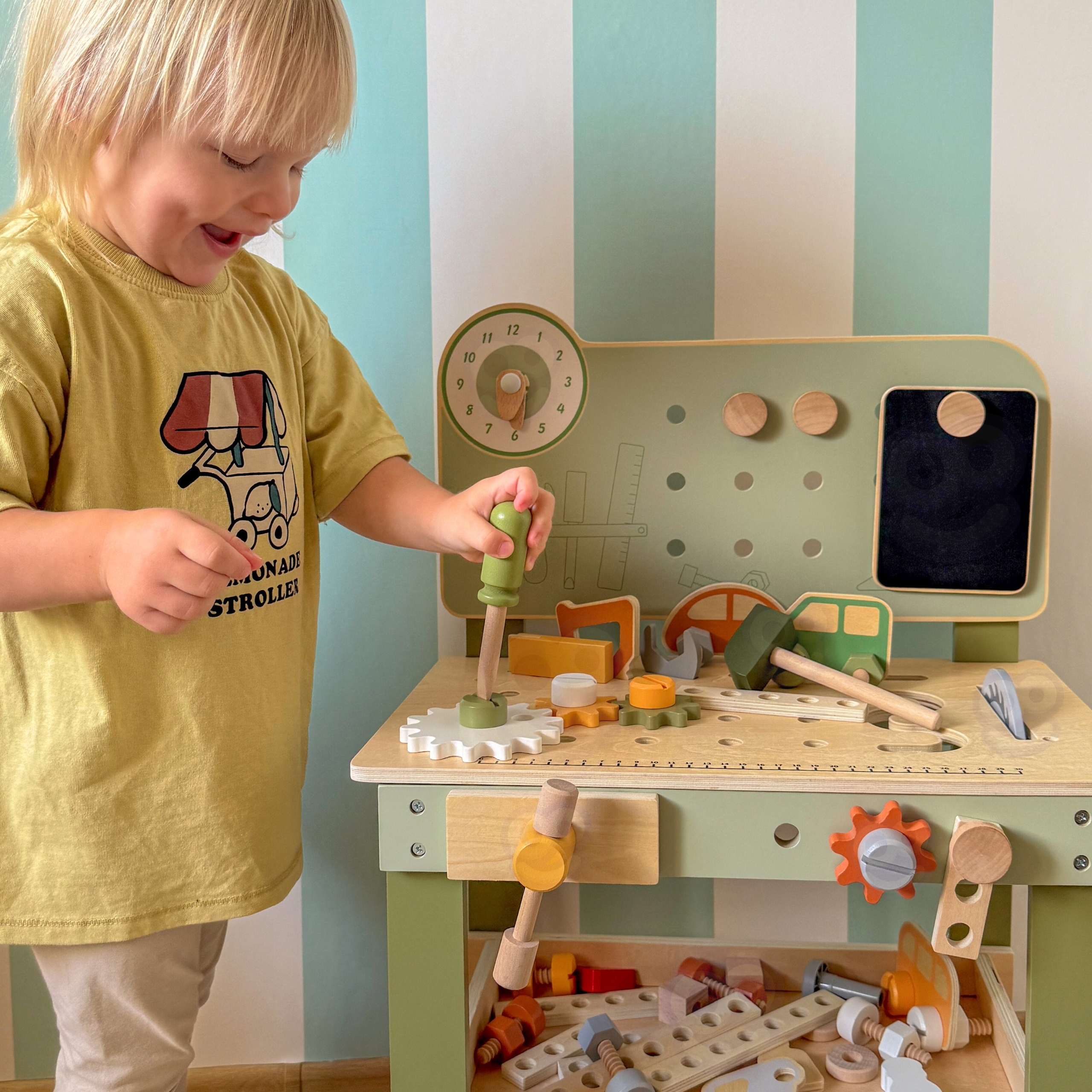 V dielni pre domácich majstrov sa bude vaše dieťa cítiť ako skutočný mechanik. Dieťa môže zatĺkať klince, uťahovať skrutky kľúčom a priskrutkovať drevené dosky a stojany k pracovnému stolu. Stolík tiež disponuje hodinami s ručičkami, obrázky v tvare zvieratiek, závesné vrecká a rôzne pomôcky.