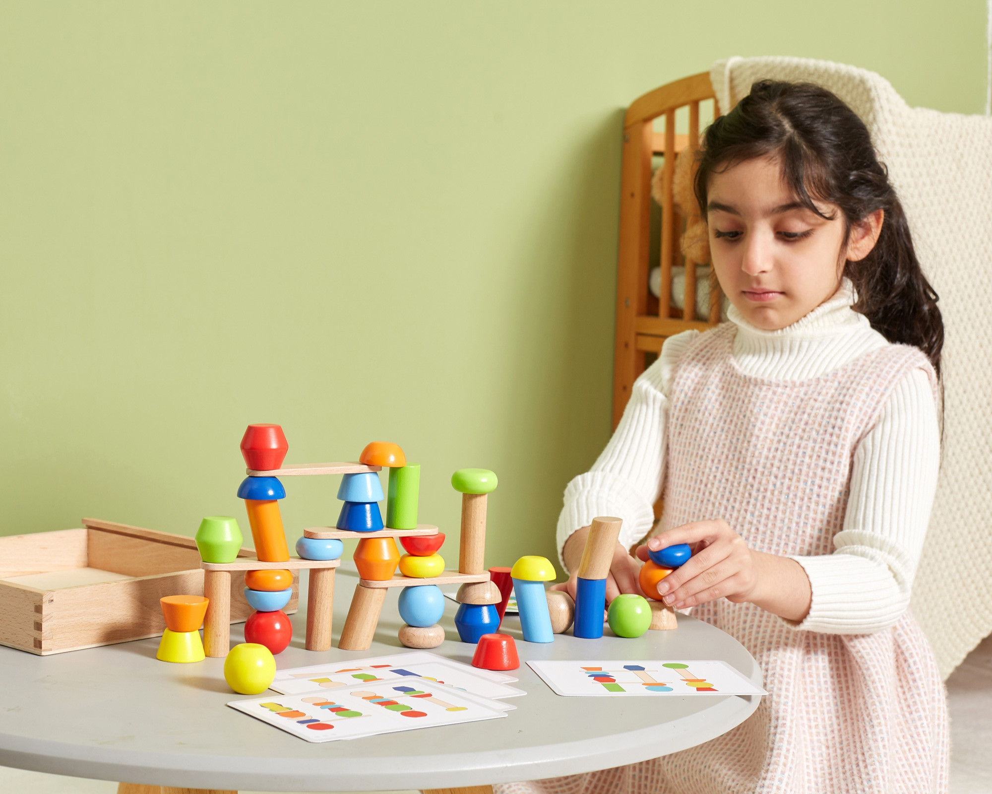 Tradičná skladačka v geometrických tvaroch a v modernej farebnej verzii od spoločnosti VIGA umožnia vášmu dieťaťu prekonávať čoraz náročnejšie výzvy. Deti môžu objavovať vlastnosti blokov, spoznávať veľkosti, tvary, farebné kombinácie a vzory. Nekonečné možnosti dizajnu len s niekoľkými blokmi. Postavte nádherné veže podľa kariet alebo vlastnej fantázie.