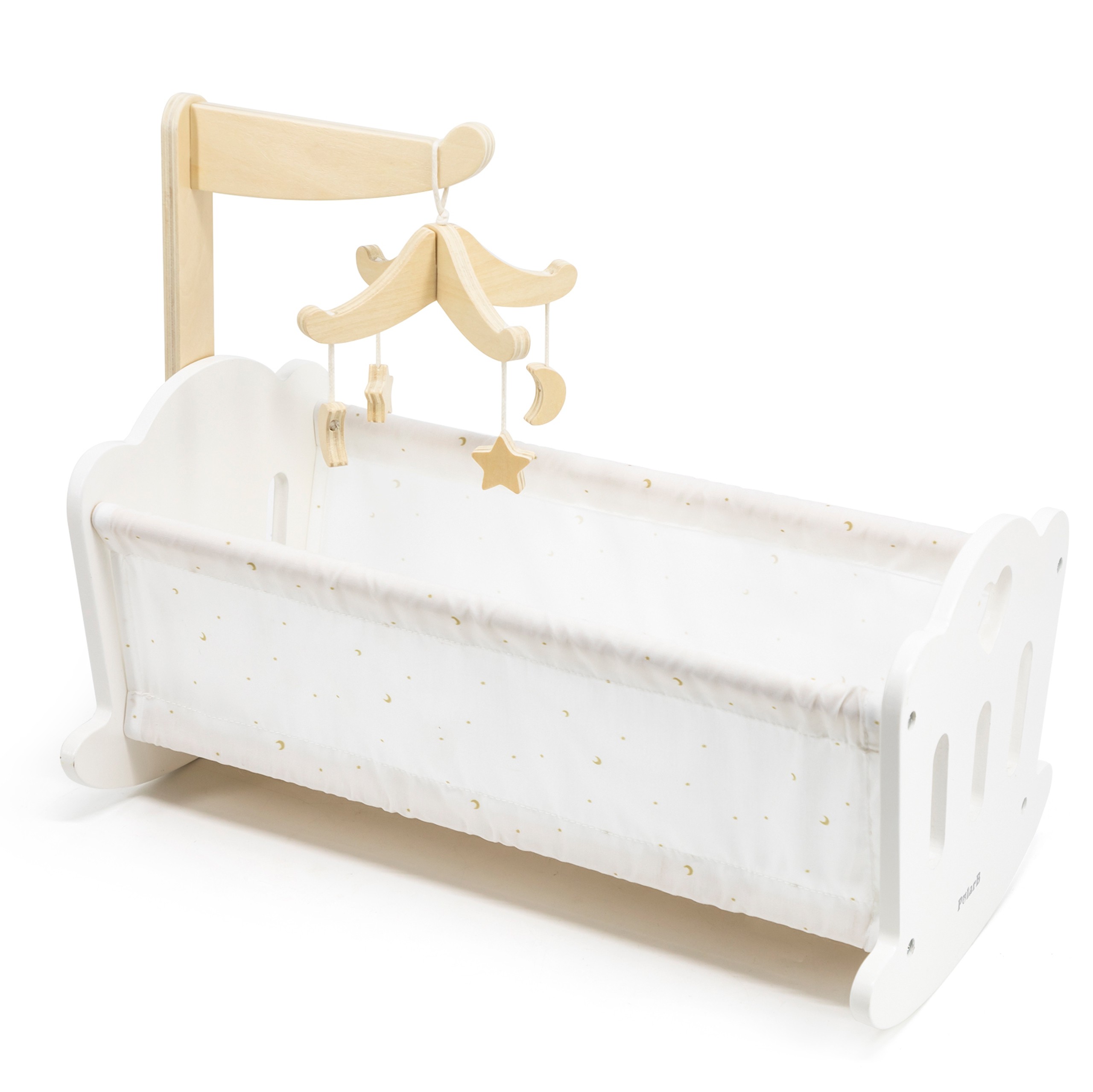 Uložte svoju bábiku spať do krásne drevenej kolísky zo série PolarB od VIGA. Kolíska má mäkký bavlnený vankúšik a paplón so sladkou potlačou hviezd a mesiaca a očarujúci kolotoč nad postieľku. Vhodné pre bábiky s výškou do 38 cm.