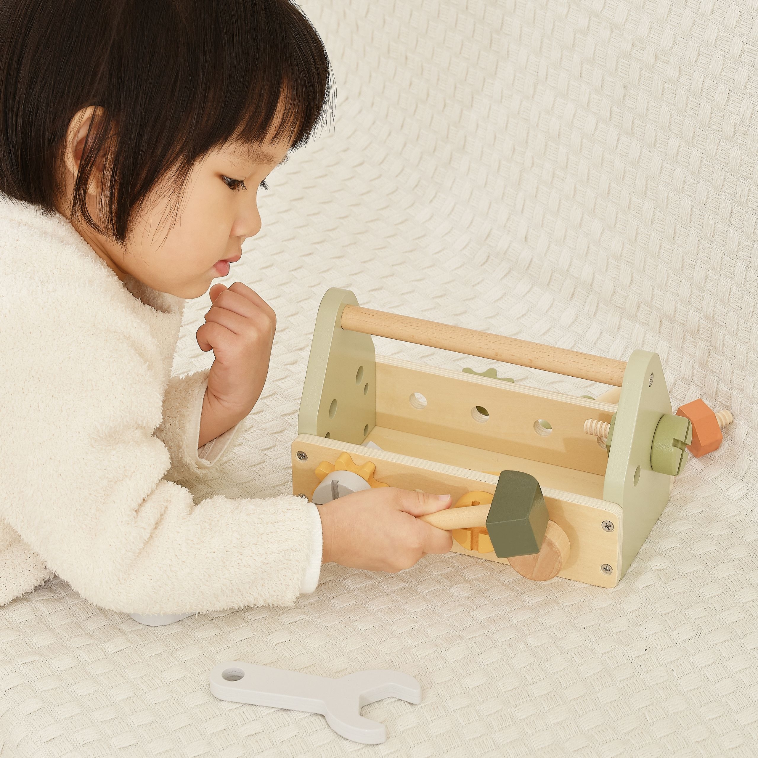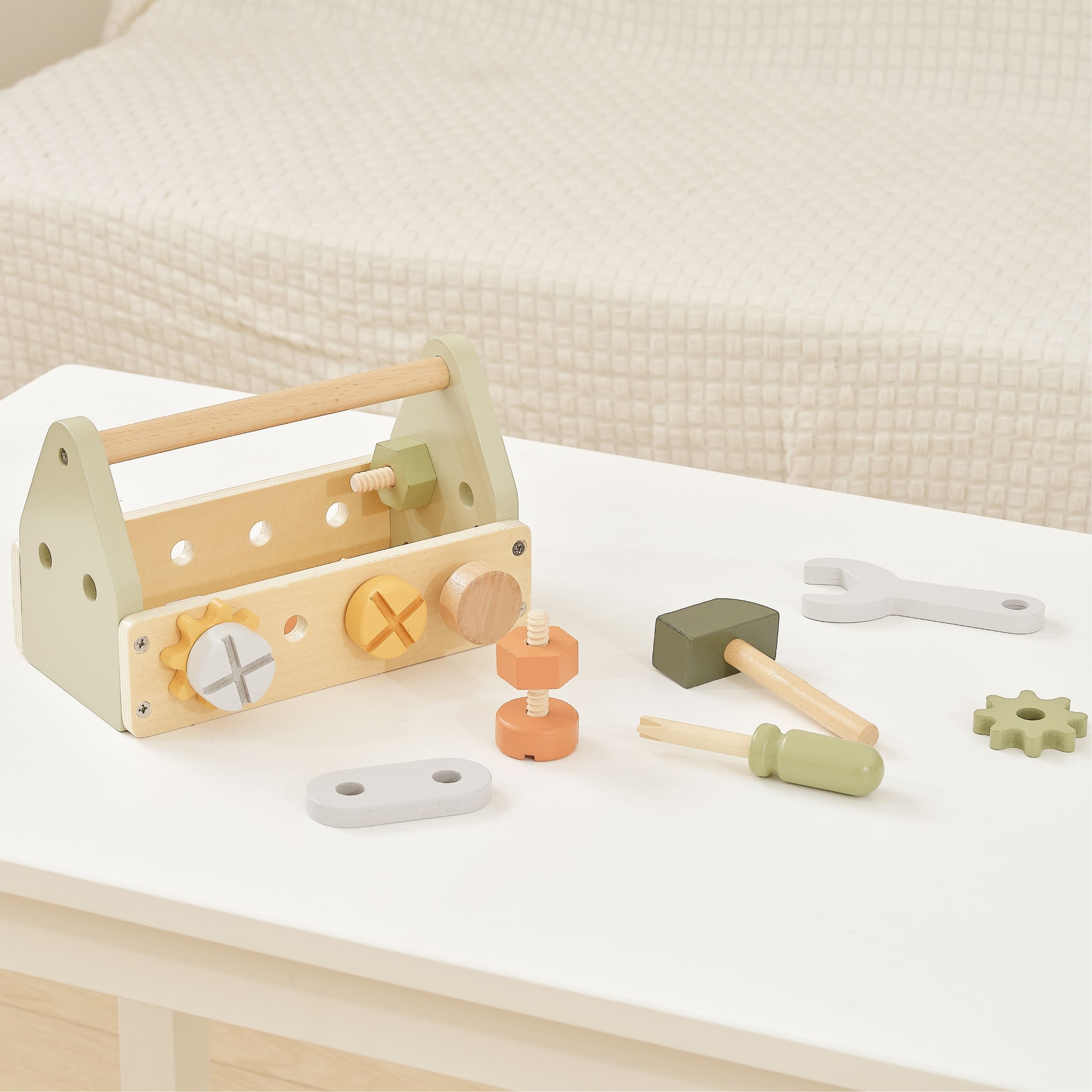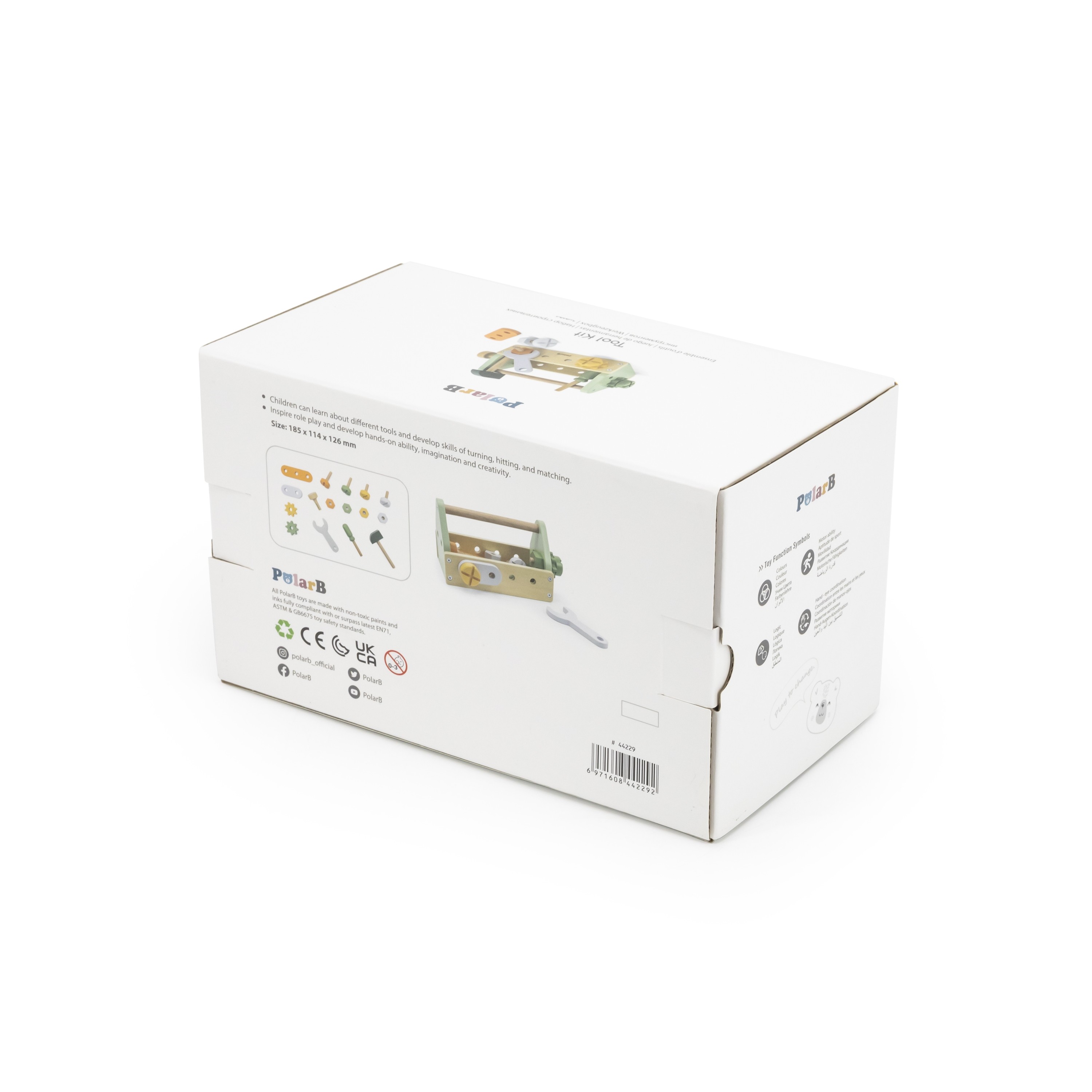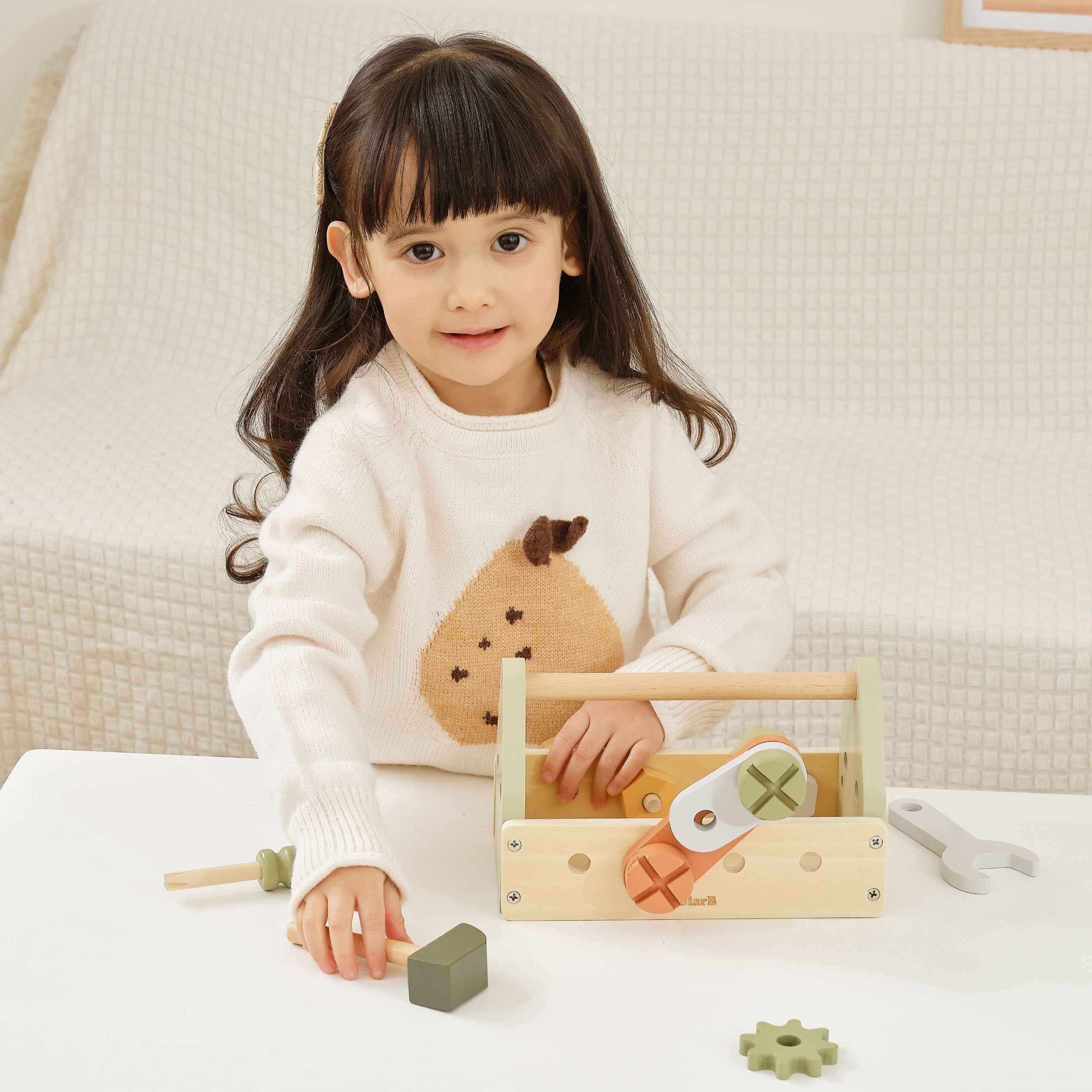Drevený box na náradie od spoločnosti Viga z kolekcie PolarB poskytne skvelú zábavu každému malému kutilovi. Sada obsahuje kladivo, kľúč, skrutkovač, 4 páry skrutiek a matíc, 2 ozubené kolieska a 2 panely s otvormi. Deti môžu skúmať rôzne nástroje a rozvíjať schopnosti otáčaním, udieraním a spájaním.