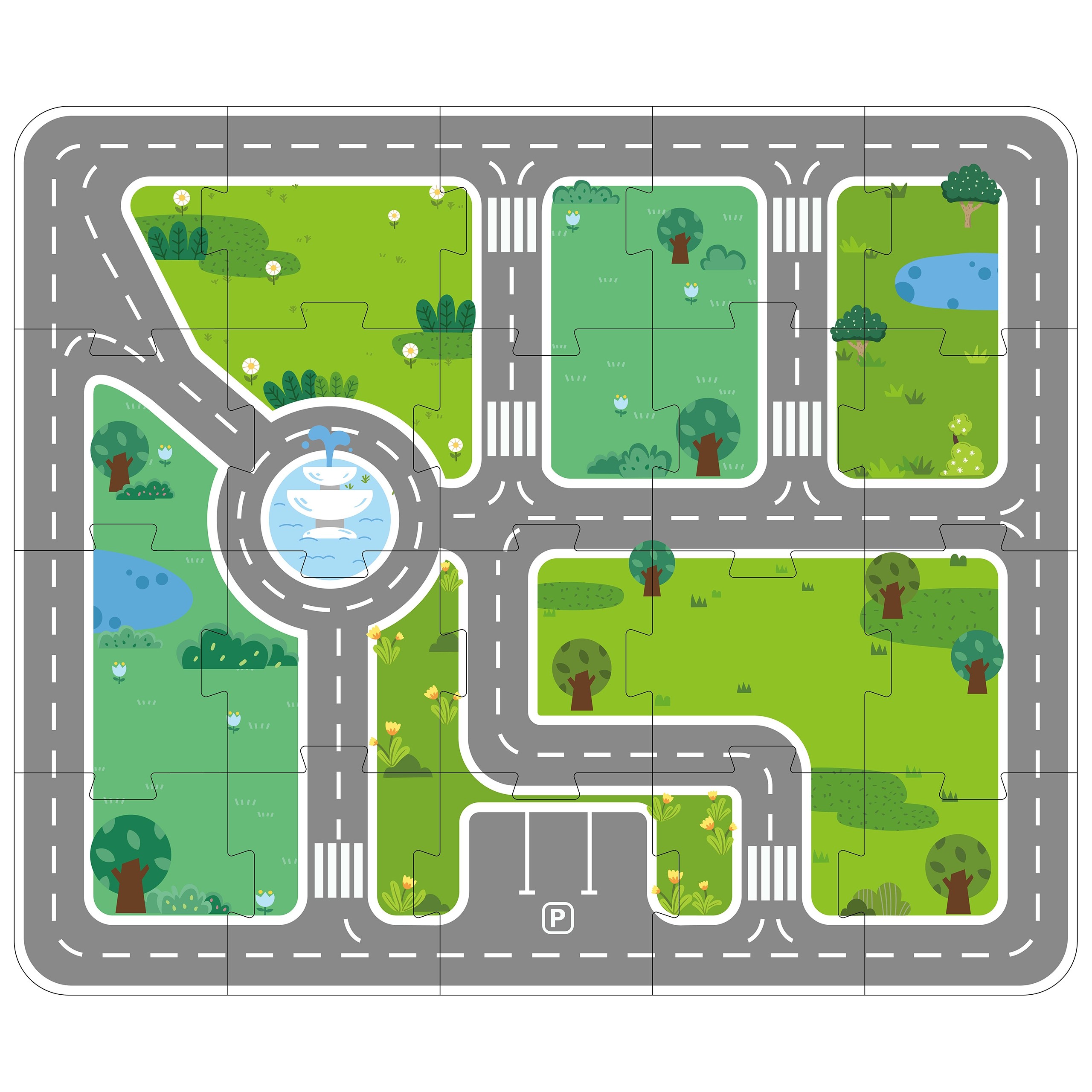 - 20 dielikov puzzle na poskladanie základne, na ktorej bude mesto postavené. Každý je očíslovaný na zadnej strane.