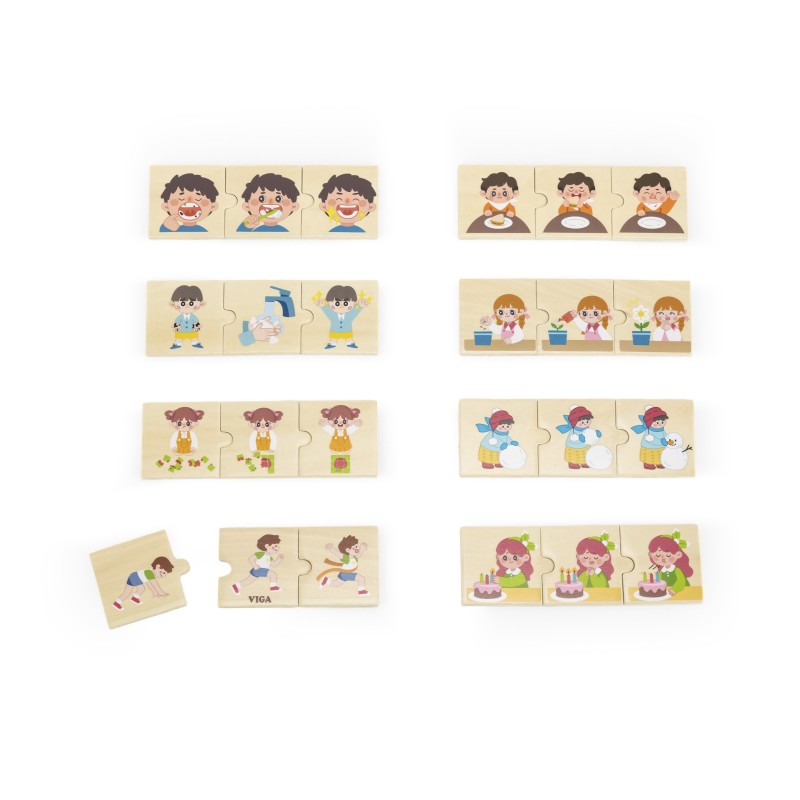 Drevené puzzle od spoločnosti VIGA je puzzle, kde je potrebné spojiť 8 sád farebných dielikov s aktivitami, ktoré deti robia v každodennom živote: umývanie rúk, čistenie zubov, polievanie kvetov, beh, jedenie, stavanie snehuliaka, oslava narodenín pri sfukovaní sviečok alebo hraní puzzle. Ide o skvelú hračku pre deti, ktorá umožňuje deťom naučiť sa a upevniť si vedomosti o rozpoznávaní a opise danej činnosti. Vďaka tejto skladacej sade máme veľa príležitostí na rozvíjanie vzťahov s naším dieťaťom. Pomôžte deťom porozumieť sledu každodenných činností a rozvíjajte logické uvažovanie a rozprávanie. Skvelý spôsob, ako rozvíjať novú slovnú zásobu, koncentráciu a motorické zručnosti u malých detí. Základnou funkciou tejto sady nie je len učenie. Podporuje tiež: postreh, koncentráciu, jemnú motoriku a zrakovú koordináciu.
