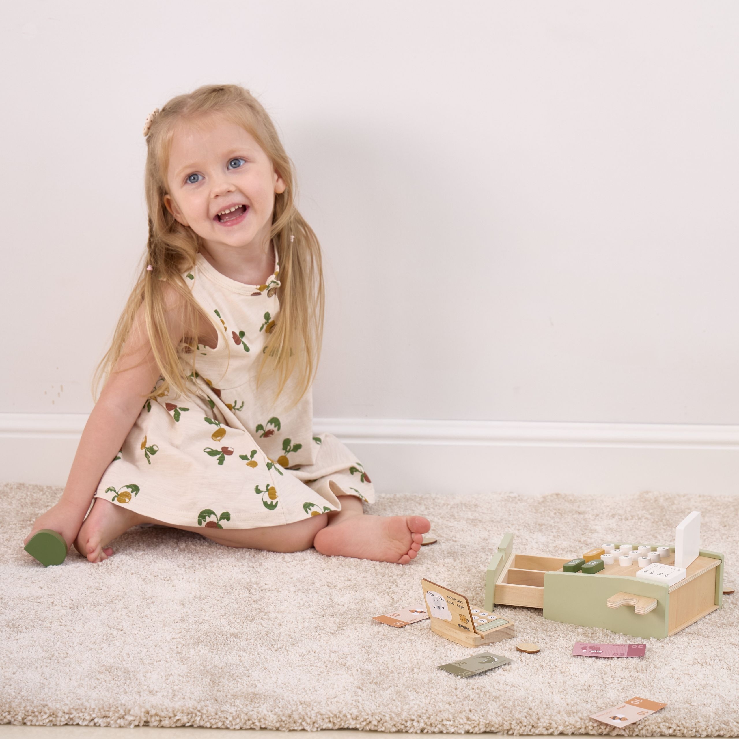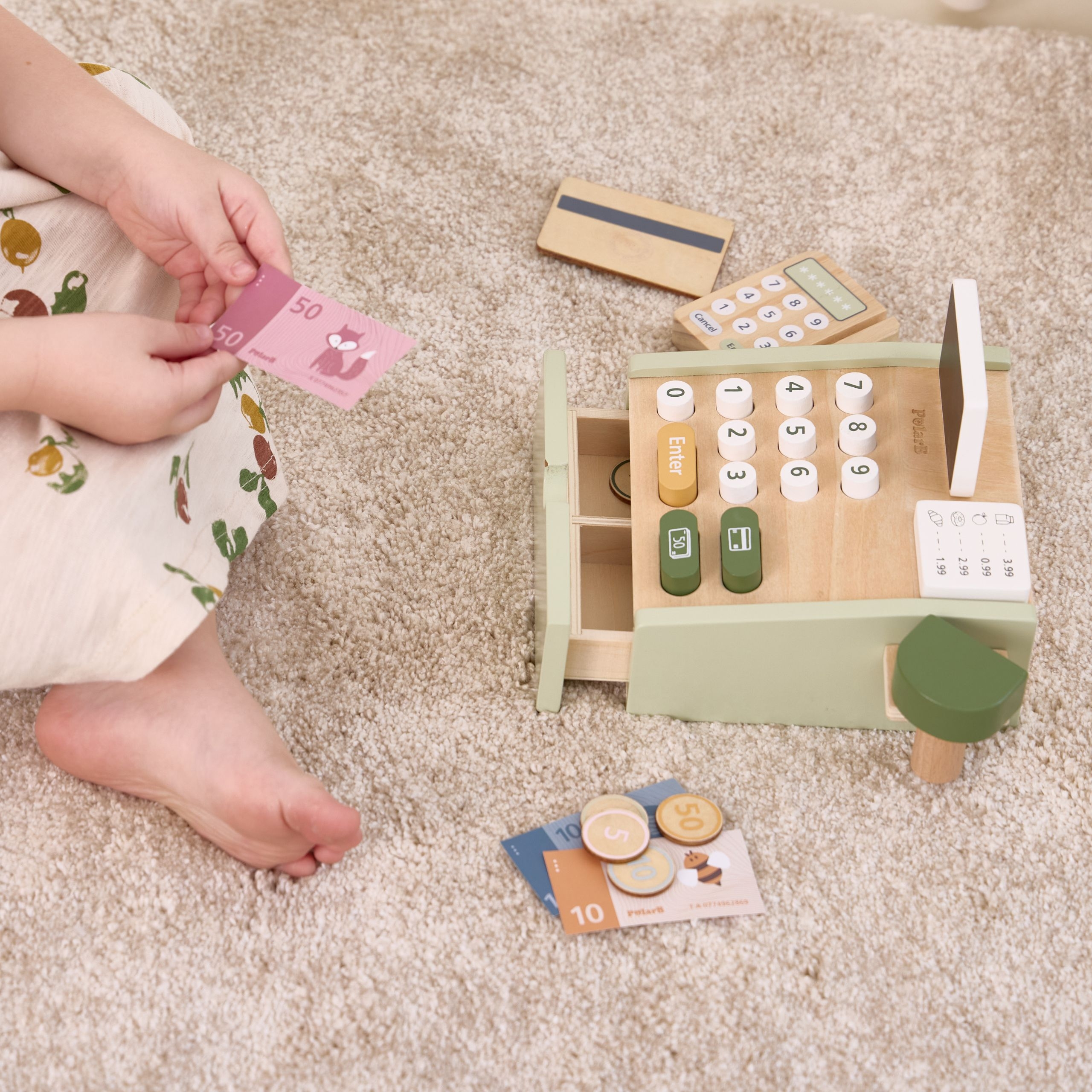 Obchodná pokladňa je skvelá drevená hračka, ktorá vám umožní zahrať si množstvo scén, ktoré sa môžu v obchode odohrávať. Deti sa môžu vžiť do úlohy predavača alebo zákazníka a spoločne si precvičiť sociálne interakcie a svoje komunikačné schopnosti. Hotovosť alebo karta? Vypočítajte dlžnú sumu, prijmite peniaze a správne vydajte drobné. Pokladňa obsahuje bankovky, mince a platobnú kartu. Vaše dieťa sa môže učiť a zároveň sa zabávať! Kráľovná vied – matematika už nebude strašidelná.