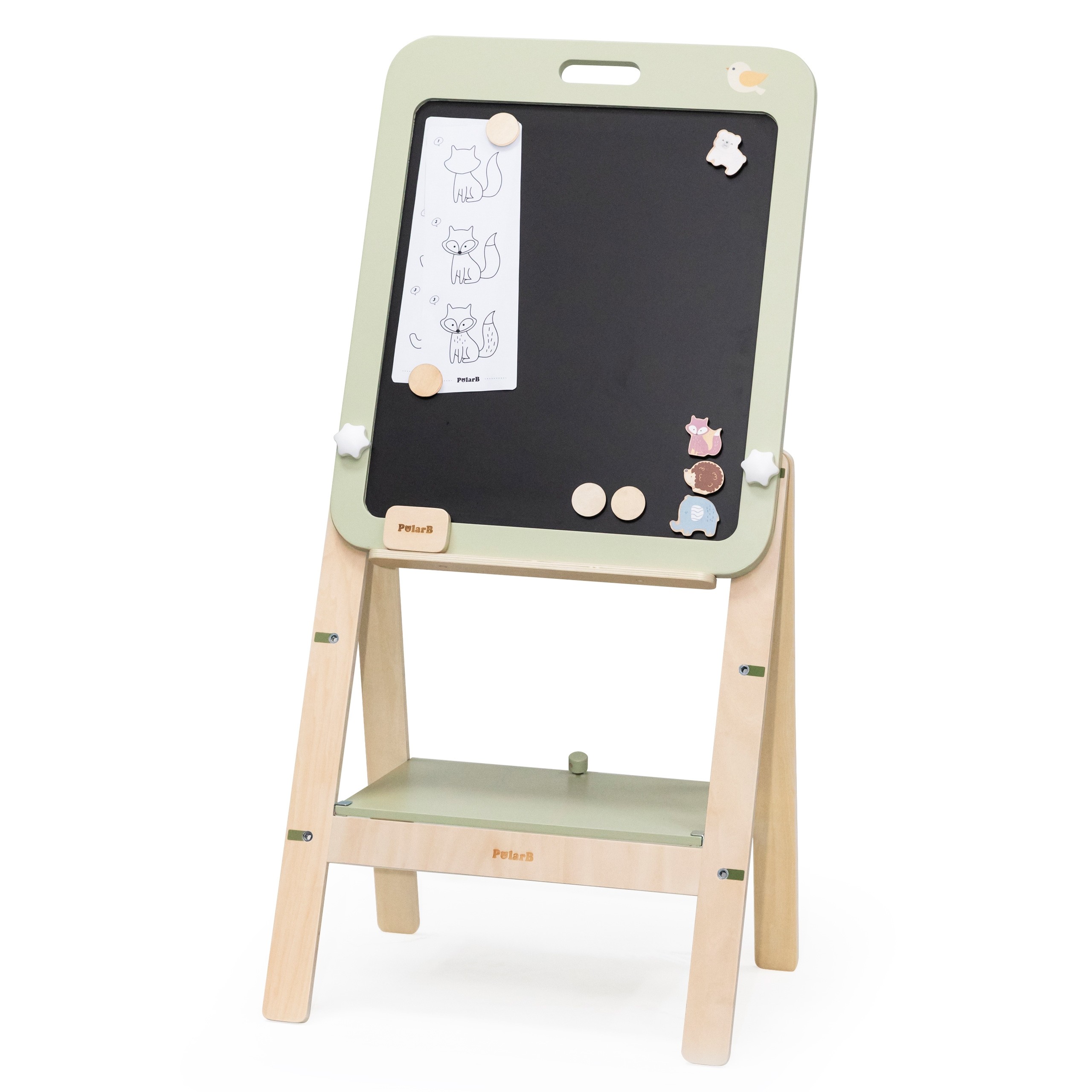 Drevená tabula na písanie zo série PolarB je skvelá pomôcka pre malých umelcov, ktorá podporuje kreatívnu hru a rozvíja manuálne zručnosti. Tabuľa má obojstranný povrch - z jednej strany klasická čierna kriedová tabuľa a z druhej biela magnetická tabuľa. Vďaka nastaviteľnej výške sa dá ľahko prispôsobiť rastúcemu dieťaťu a zaistí pohodlnú hru v rôznych fázach vývoja. A čo viac, tabuľu môžete po skončení hry použiť ako dekoráciu, pretože ju môžete odstrániť a zavesiť na stenu!