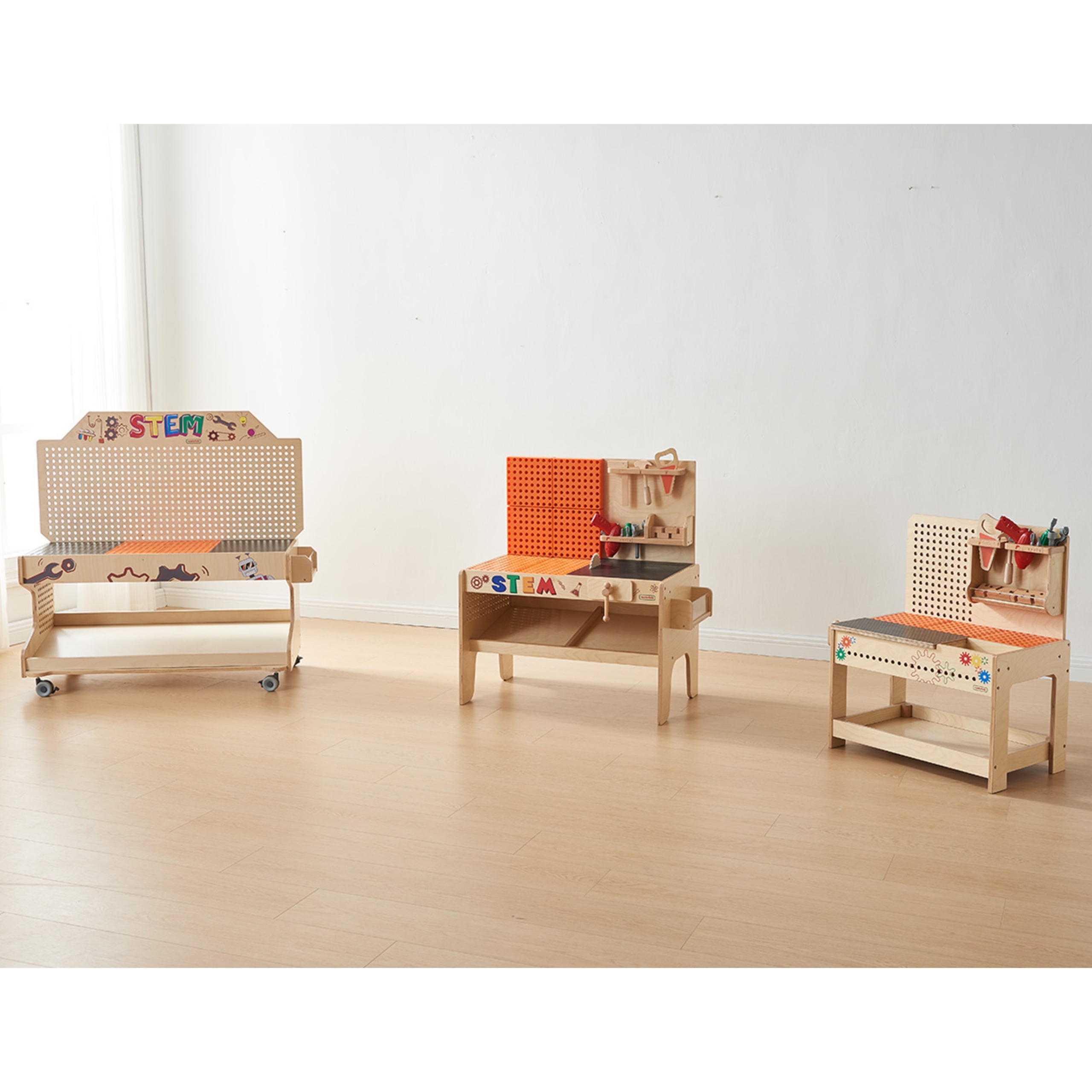 Drevená STEM vzdelávacia dielňa umožňuje kreatívnu hru a spoznávanie sveta vedy. Stôl má panel s otvormi, na ktorých môžete vytvárať krásne vzory vložením farebných a geometrických kolíkov, skrutiek a ozubených kolies. Výška pracovnej dosky 42,5 cm je určená pre deti od 3 rokov. Deti môžu vytvárať skutočné pracovné systémy a zabaviť sa pri stavaní s realistickými nástrojmi.