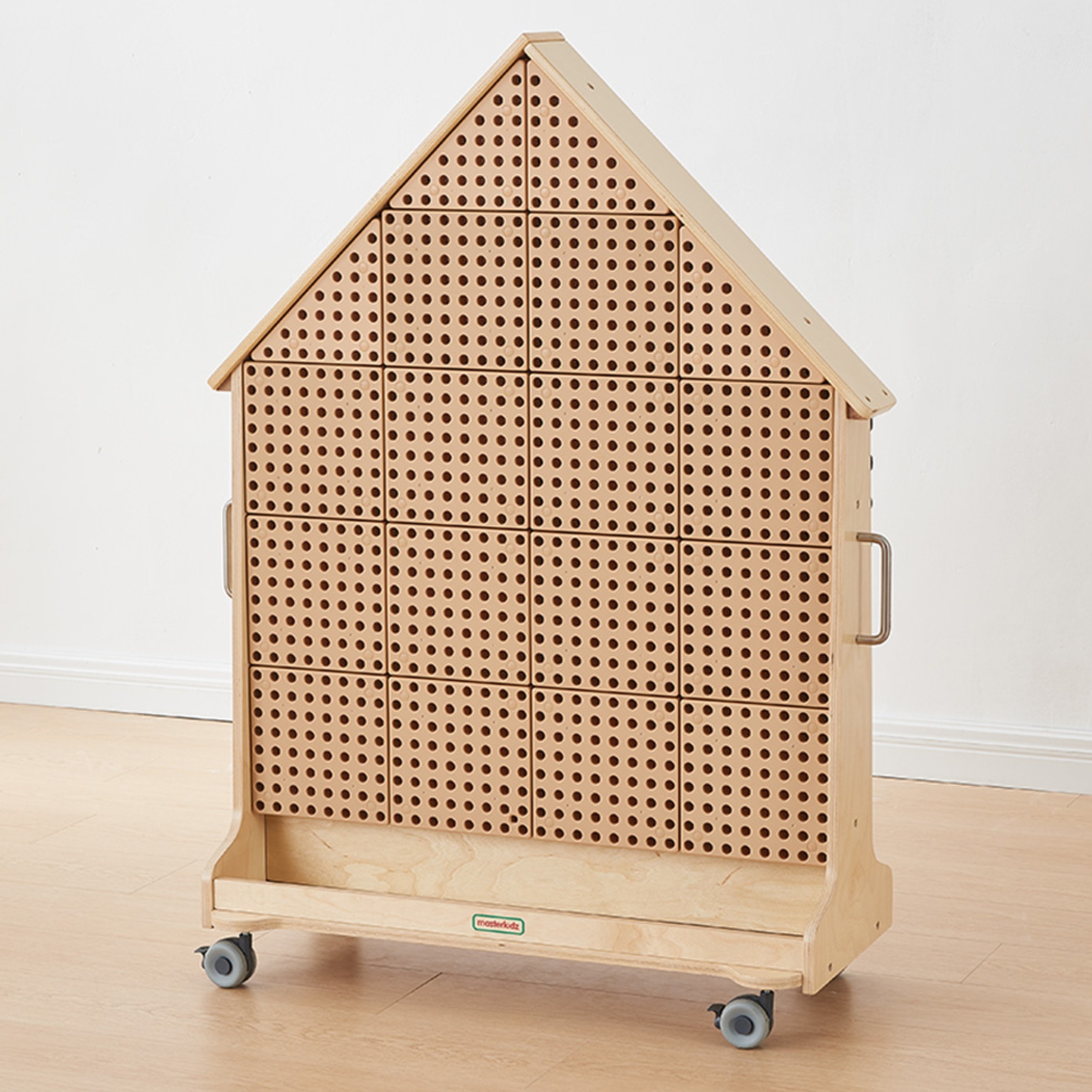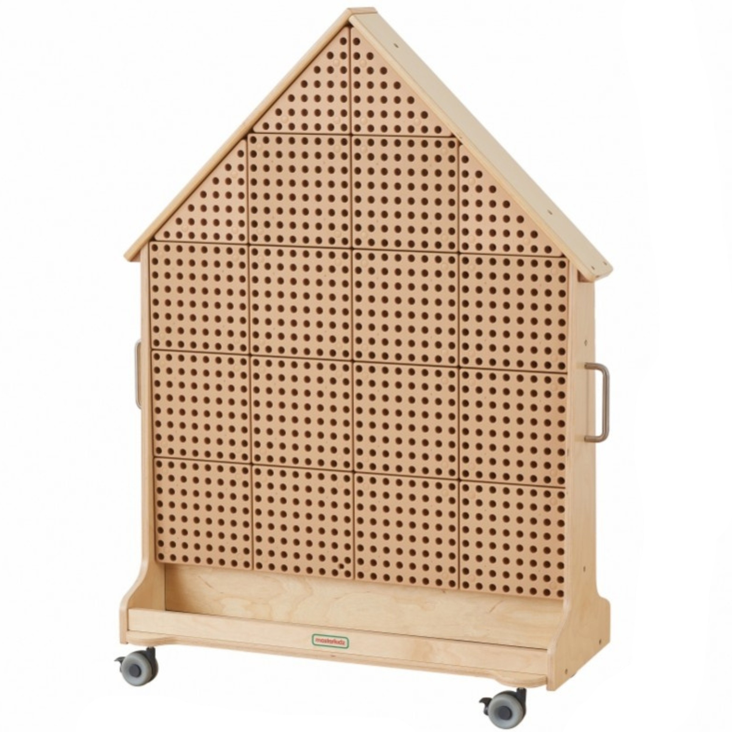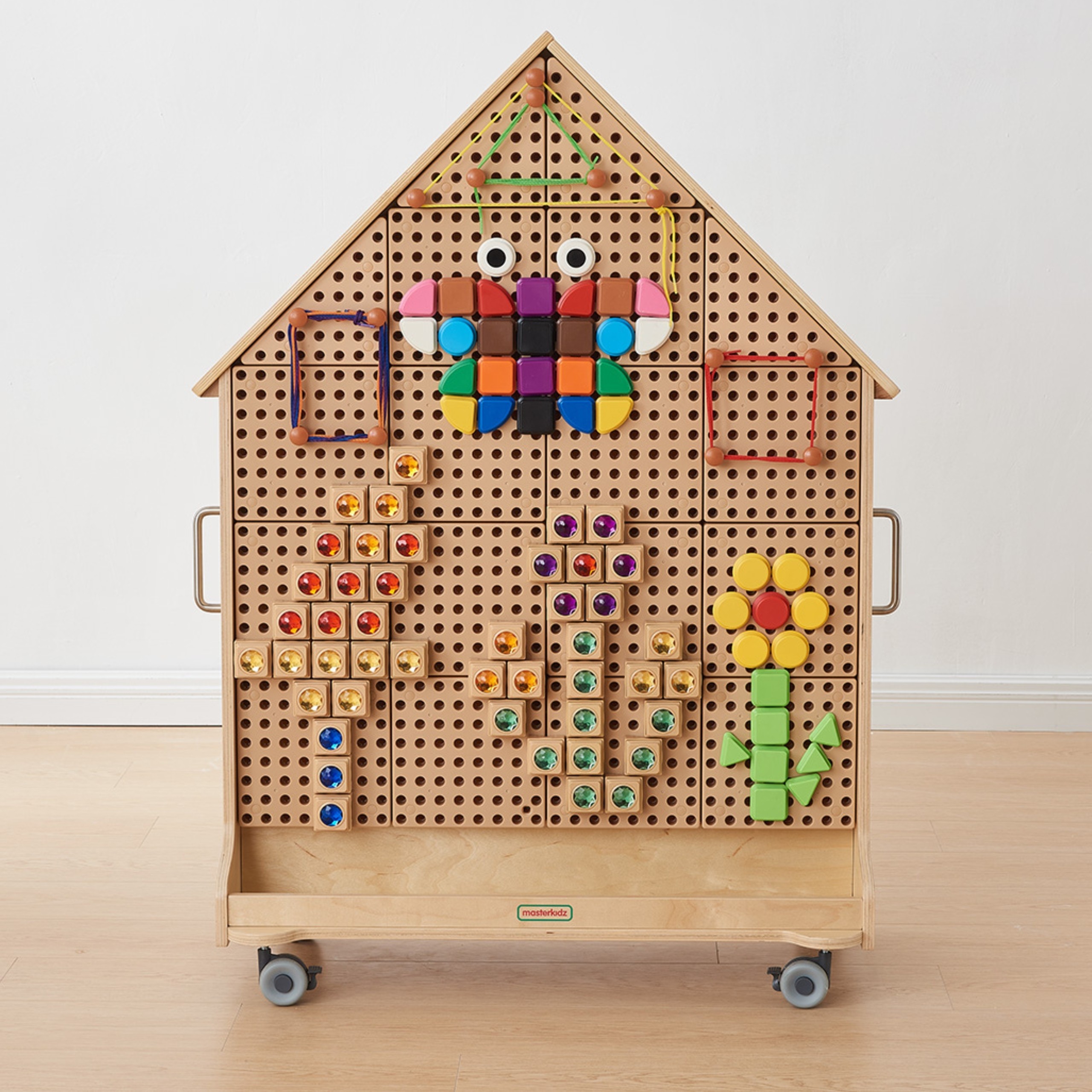 Voľne stojaca tabuľa STEM v tvare domu je dokonalý vstup do sveta STEM. Nádherný vzdelávací a kreatívny panel, ktorý sa dá ľahko presúvať vďaka kolieskam. Vďaka tejto tabuli sa deti dozvedia o svete mechanizmov, fyziky, matematiky a mnoho ďalších zaujímavostí. Špeciálne kolíky a farebné prvky im umožňujú vytvárať jedinečné štruktúry a nádherné vzory.