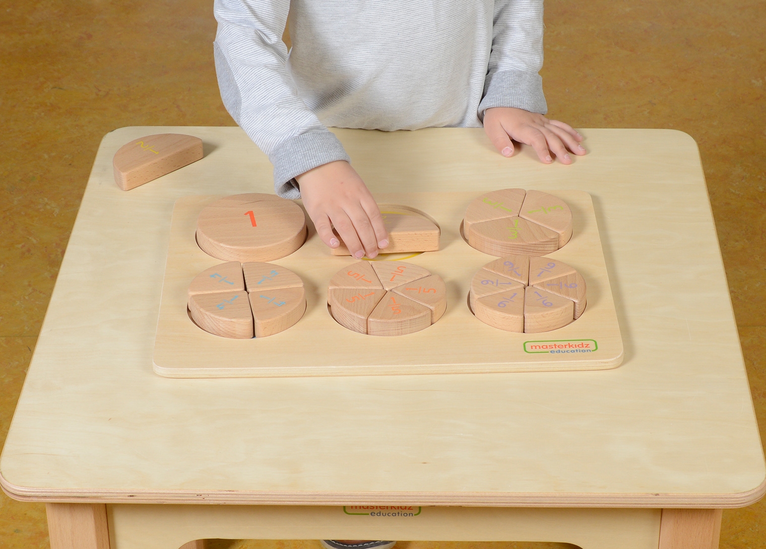 Farebné kódovanie pomáha dieťaťu intuitívne priraďovať dieliky na správne miesto. Na zadnej strane každého dielika nájdete vytlačený matematický zápis zlomku (napr. 1/2, 1/4), čo umožňuje starším deťom prepojiť vizuálny tvar s číslom. Je to ideálna pomôcka pre domáce vzdelávanie, škôlky aj prvé ročníky základných škôl.