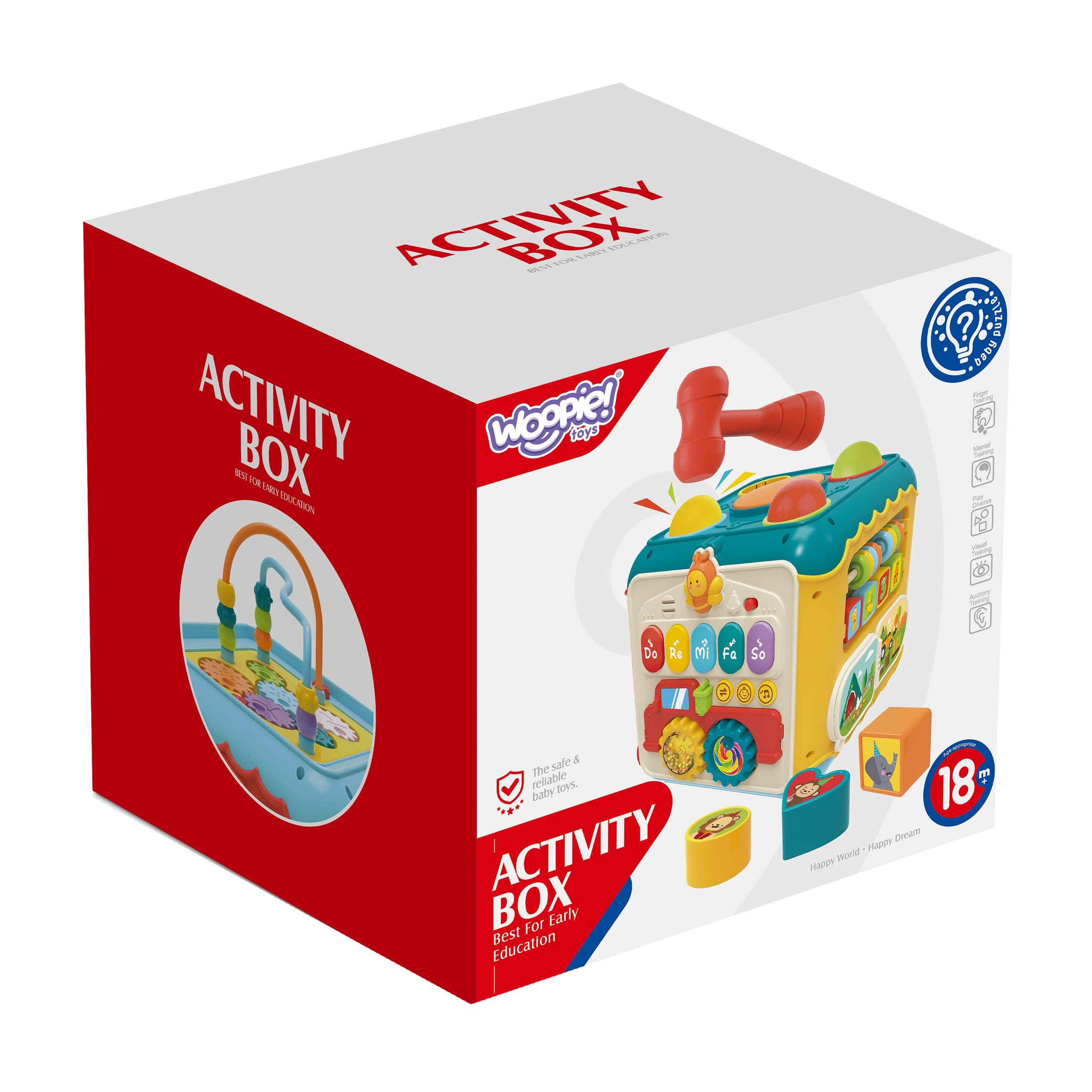 Activity Box 6 v 1 značky WOOPIE je hračka, ktorá ponúka vášmu dieťaťu veľa rôznych a zaujímavých aktivít. Každá stena boxu má inú funkciu, vďaka čomu je hračka univerzálna a prispôsobená rôznym záujmom a vývojovým štádiám dieťaťa. Kocka obsahuje klavír, na ktorom sa dieťa môže hrať s klávesmi, ktoré vydávajú priateľské zvuky, a dierovačku, s ktorou dieťa kladivkom zatĺka farebné loptičky do boxu - kladivo a loptičky sú súčasťou sady. Každá aktivita je starostlivo navrhnutá tak, aby podporovala rôzne zručnosti, ako je koordinácia očí a rúk, rozpoznávanie tvarov a farieb, rozvoj sluchu a prejav kreativity. Vďaka malým rozmerom je Activity Box ľahko prenosný a zároveň plný nekonečnej zábavy pre malých prieskumníkov, ktorí sa chcú učiť hrou.