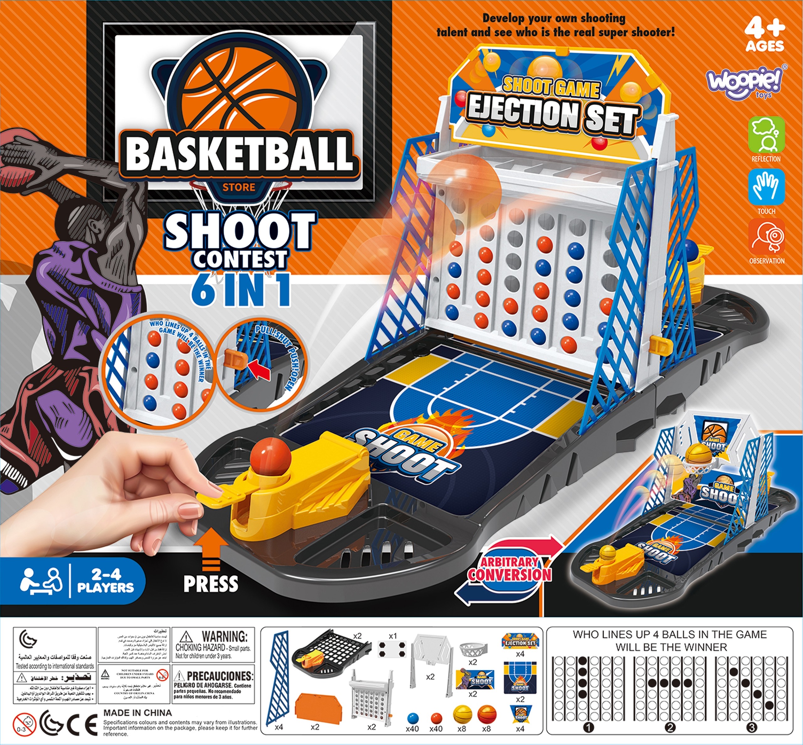Mini Basketball - detská hra od spoločnosti WOOPIE je hra určená pre deti od 4 rokov, ideálna na trávenie času s rodinou, pretože ju môžu hrať až štyria ľudia. Spodná časť konštrukcie je vybavená mechanizmom na vhadzovanie loptičiek do koša. Rozvíja myseľ, reflexy a koncentráciu. Umožňuje vám rozvíjať vzťahy s priateľmi a rodinou. Hra je ideálnym darčekom k narodeninám alebo Vianociam pre každé dieťa.