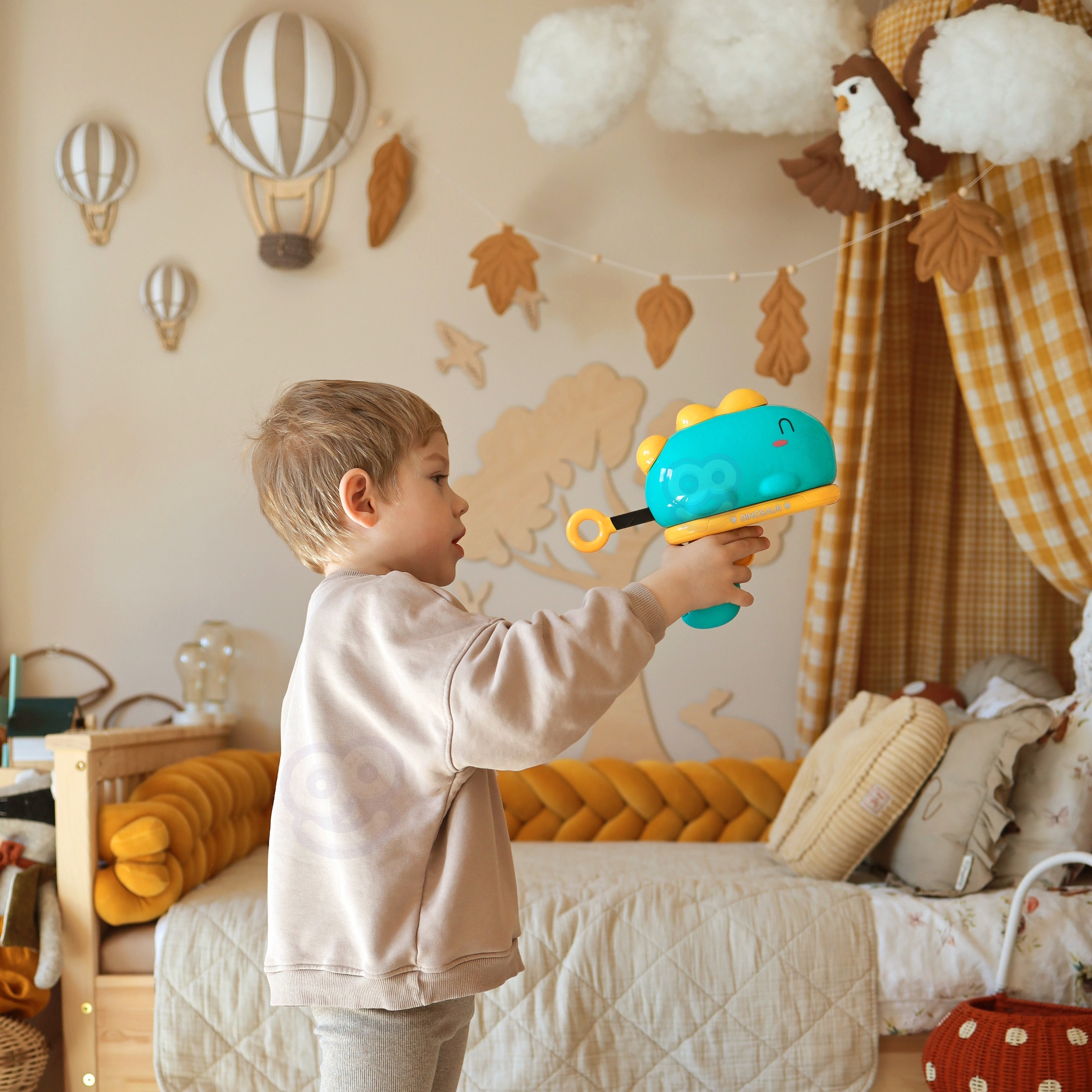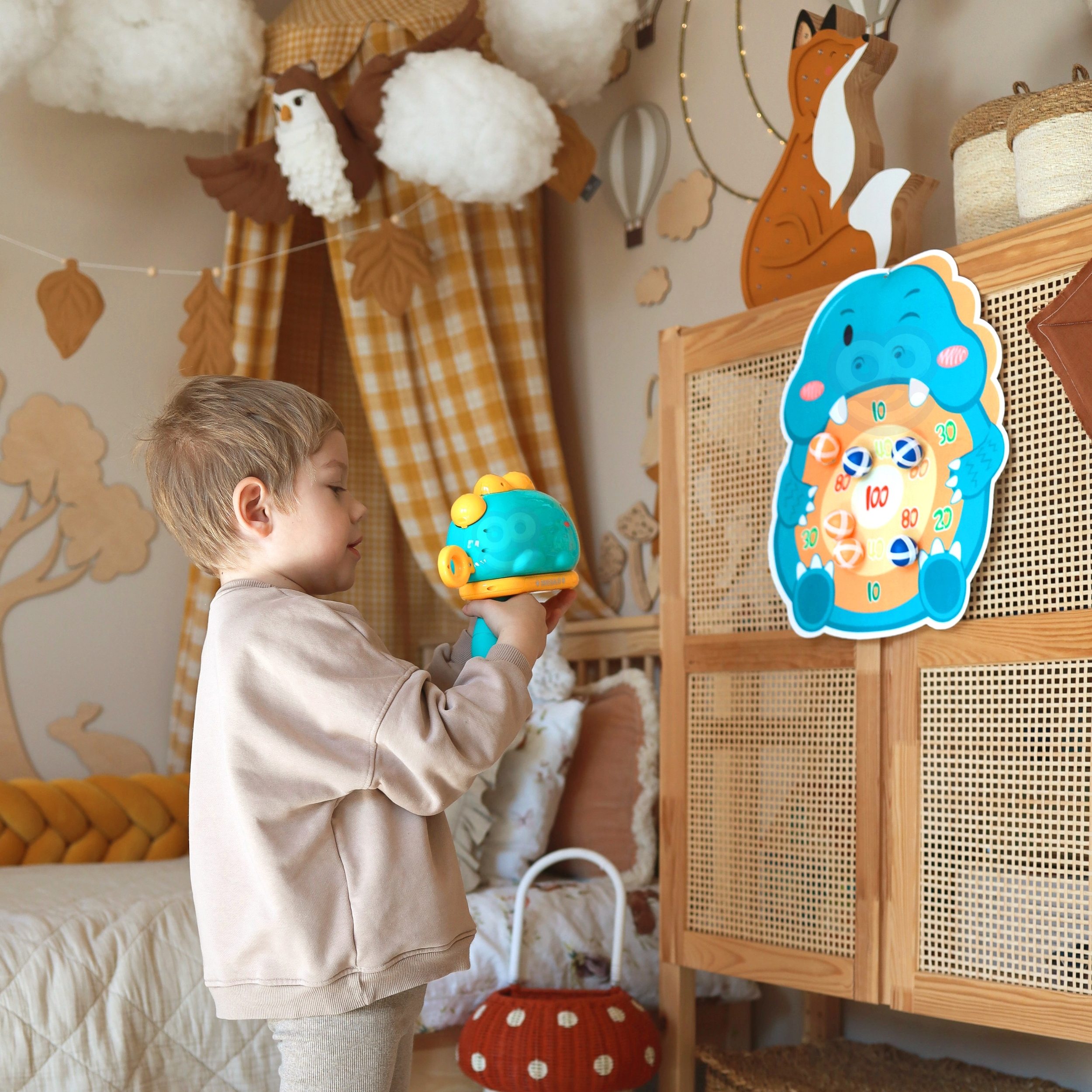 Pištoľ na loptičky značky WOOPIE v dino štýle, takže bude ako stvorená pre všetkých milovníkov tohto typu atmosféry. Stačí nabiť pištoľ v tvare dinosaura loptičkami, potiahnuť páku, potom namieriť na cieľ a strieľať. Terč je ľahký a prenosný, čo vám umožní hrať kdekoľvek – vo vnútri aj vonku. Terč je vybavený háčikom na pripevnenie, ľahko sa prichytí na rôzne povrchy a po hraní ho môžete rýchlo zložiť a uložiť, čím budete mať poriadok. Sada obsahuje 6 loptičiek rôznych farieb. U najmenších hra dokonale podnieti motoriku a koordináciu, u starších zasa súťaživosť. Cieľ rozdelený do bodovacích zón pridáva prvok súťaženia – skontrolujte, kto z vašej rodiny alebo skupiny priateľov sa stane šampiónom v presnosti.