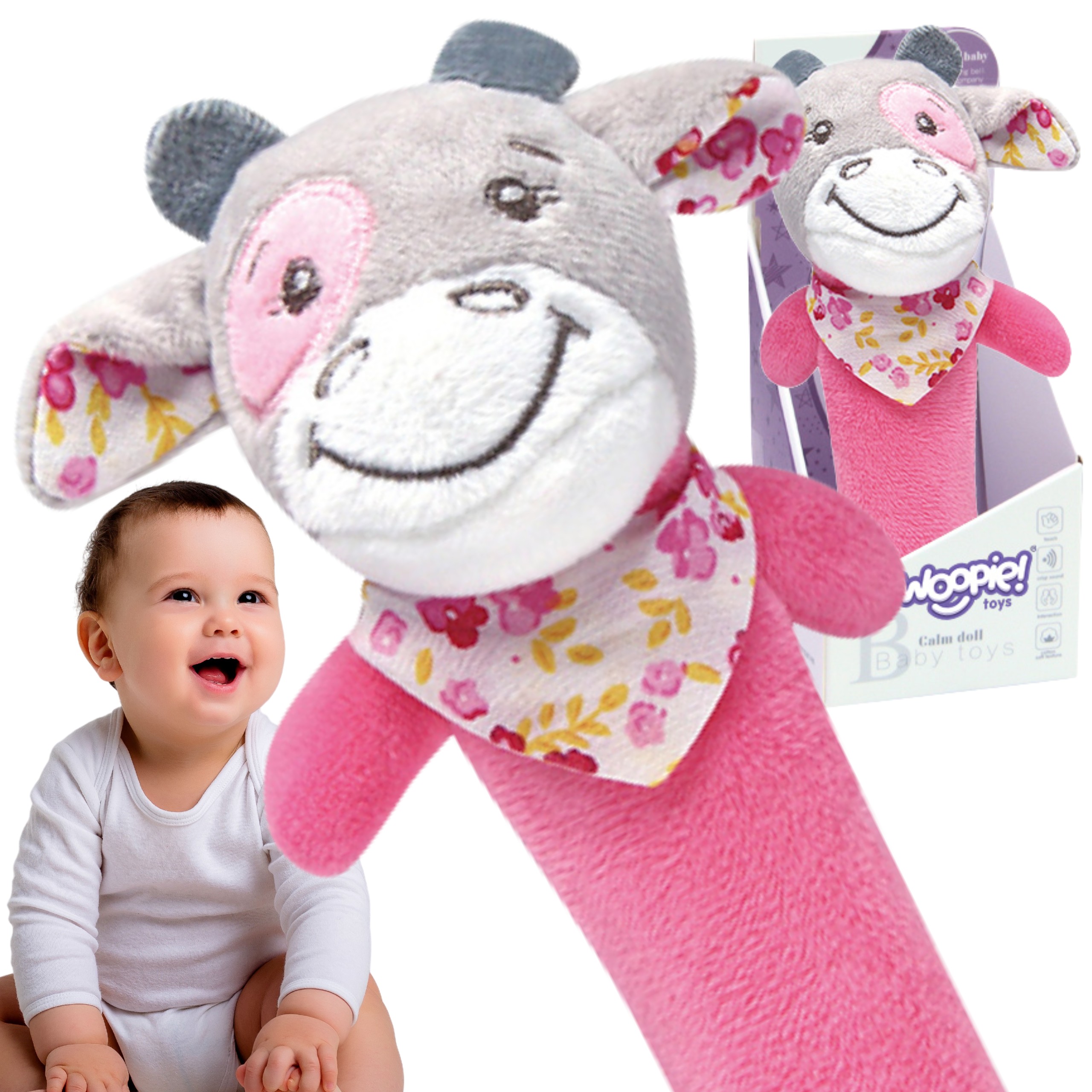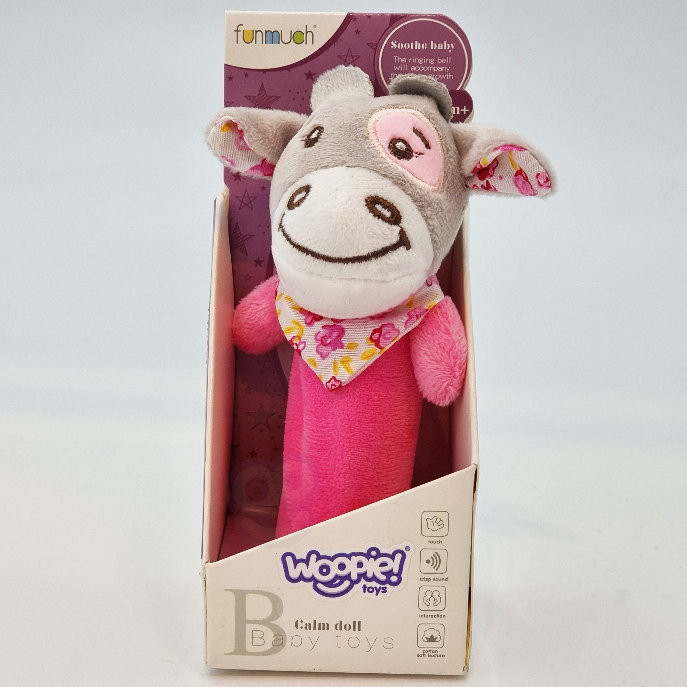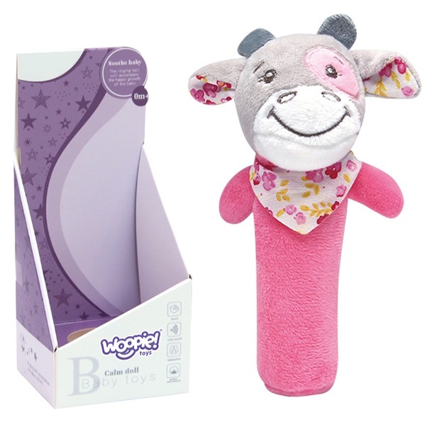 Plyšová kravička od spoločnosti Woopie. Hračka je prispôsobená pre bábätká a ich malé ručičky.