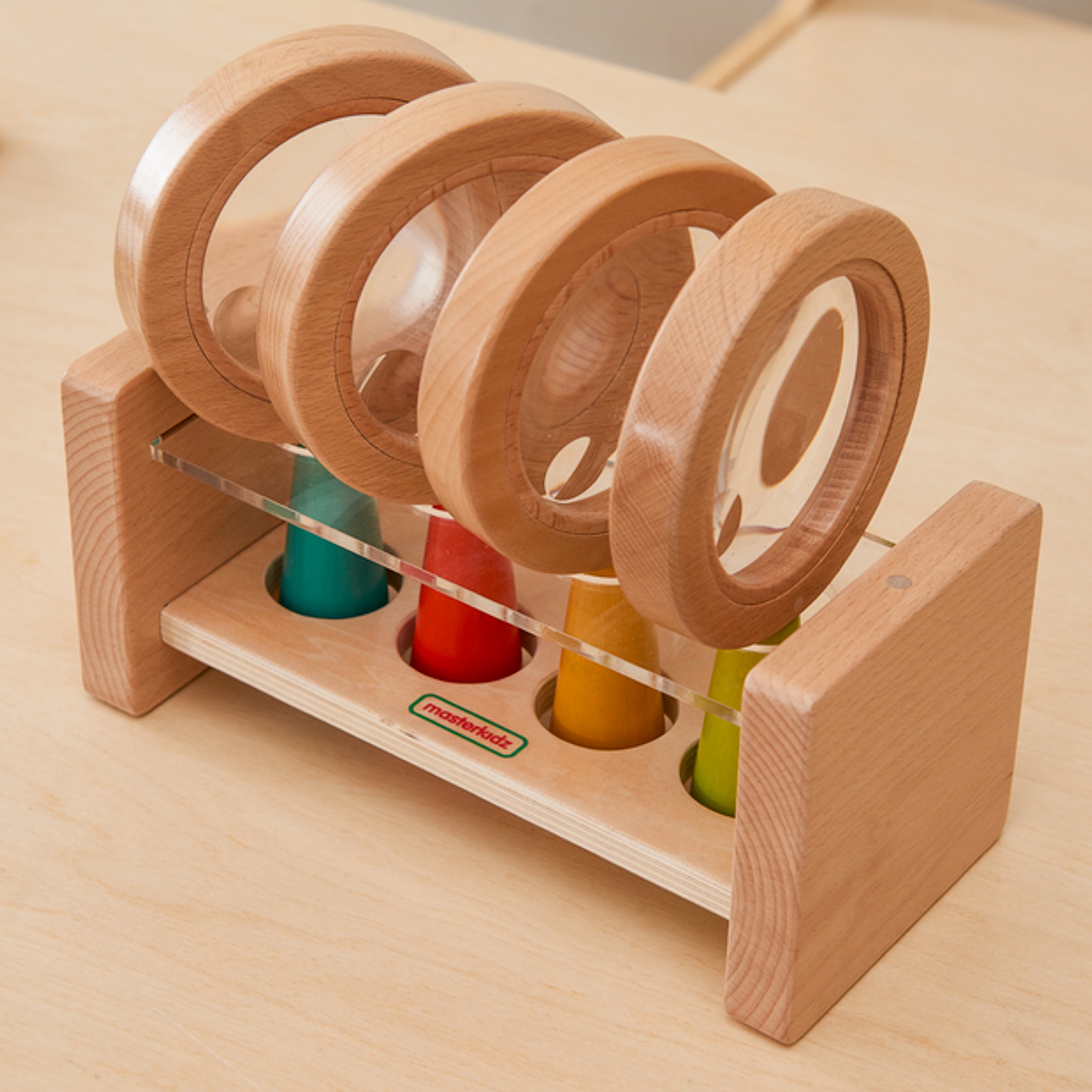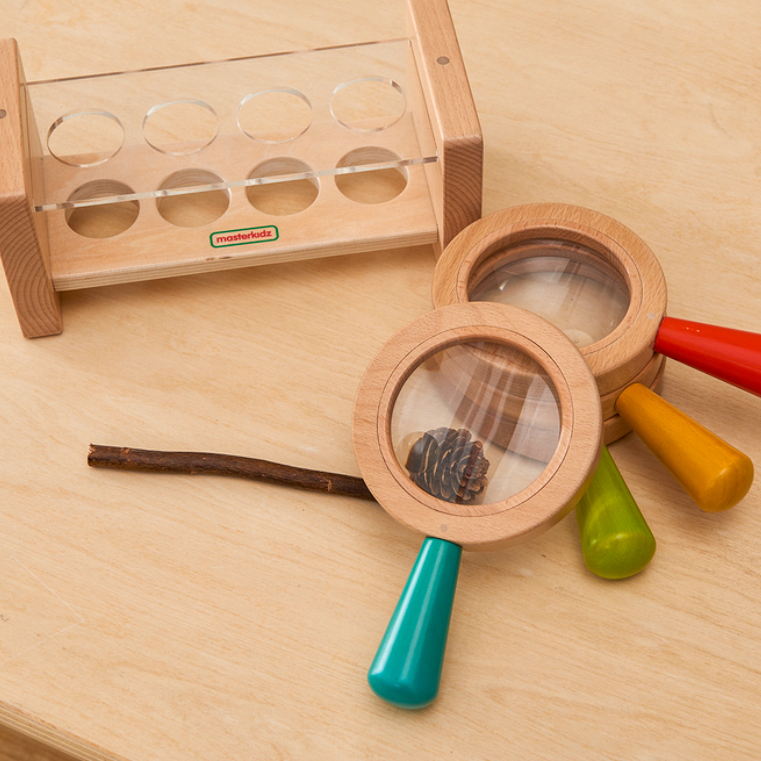 Nechajte svoje dieťa premeniť sa na malého objaviteľa s touto jedinečnou sadou lup s dreveným stojanom! Sada obsahuje štyri robustné lupy s veľkými, priehľadnými šošovkami, ktoré poskytujú zväčšenie ideálne na skúmanie rastlín, hmyzu a iných prírodných pokladov. Každá lupa má ergonomickú drevenú rukoväť v živých farbách (červená, zelená, žltá a modrá), prispôsobenú malým ručičkám.