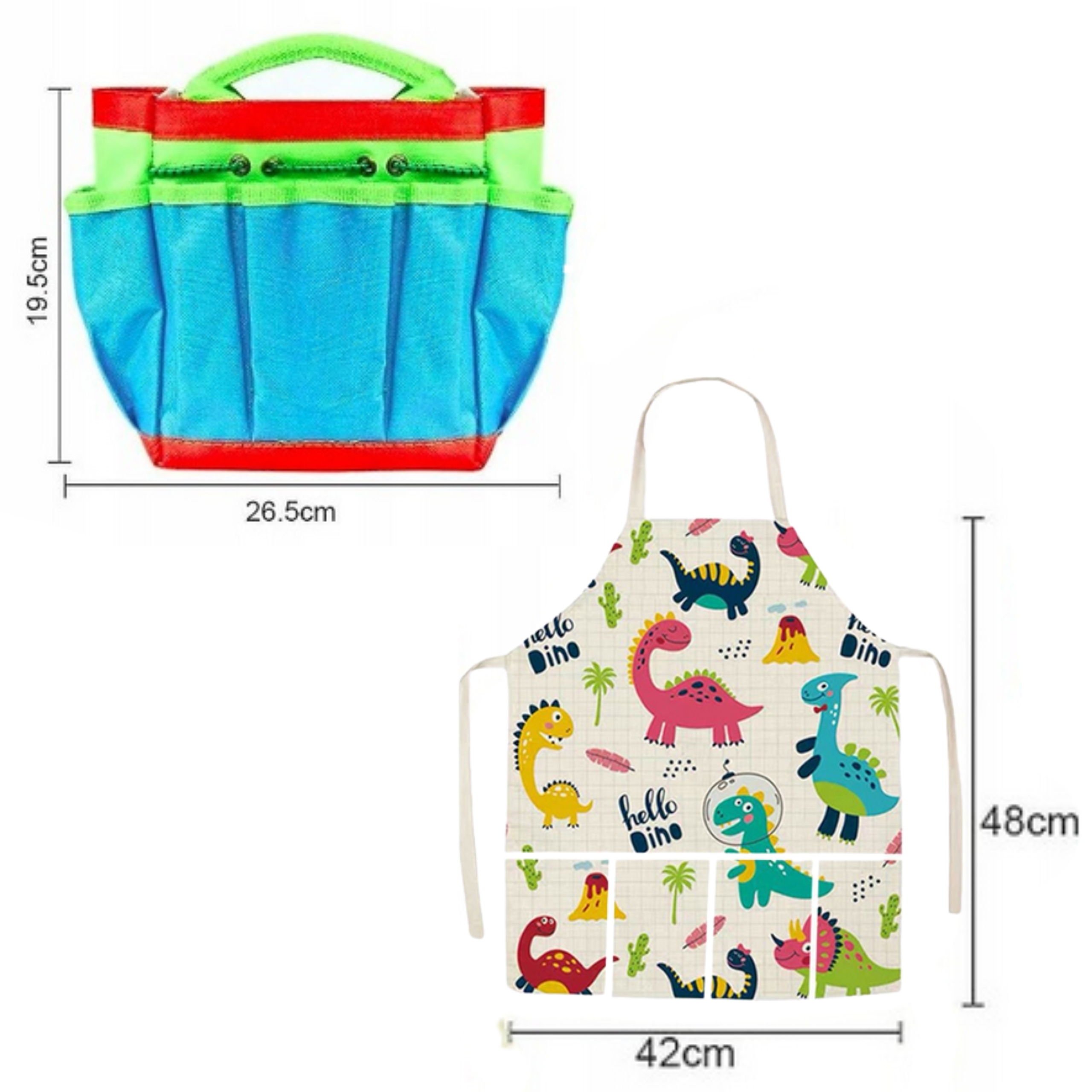 🦖 Všetko potrebné v jednom balení: Bohatá 15-dielna sada obsahuje kvalitné náradie, kvetináče, krhličku, rukavice, zásteru aj praktickú tašku. Nemusíte dokupovať nič navyše, zábava sa môže ihneď začať! 🔧 Bezpečné a prispôsobené deťom: Kovové náradie s drevenými rúčkami má zaoblené hrany a veľkosť prispôsobenú detským rúčkam. Zástera a rukavice chránia oblečenie a ruky pred zašpinením. 🌱 Učenie hrou a kontakt s prírodou: Deti sa hravou formou učia základom záhradkárčenia, spoznávajú rastliny a budujú si zmysel pre zodpovednosť a trpezlivosť pri starostlivosti o vlastný záhon. 👜 Praktická taška na náradie: Všetky nástroje a doplnky sa dajú prehľadne uložiť do priloženej tašky, takže sa nič nestratí a sada sa dá ľahko prenášať.