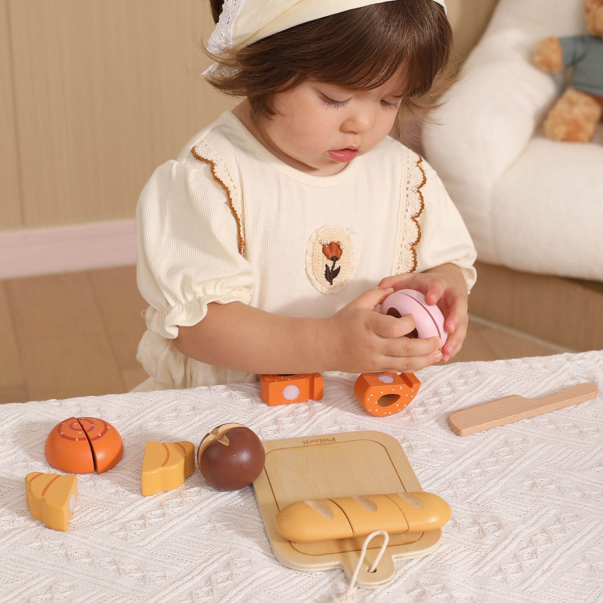 Vôňa čerstvého pečiva a radosť zo samostatnej prípravy jedla! Tento nádherný drevený edukačný set z pastelovej série PolarB umožňuje vašim deťom stať sa na chvíľu skutočným pekárom. Súčasťou je pevná doska, bezpečný nožík a lákavý výber raňajkového pečiva (od bagety a croissantu až po sladký donut), ktorých polovice sú spojené odolným suchým zipsom. Práve rozdelenie zipsu nožíkom vydáva deťmi milovaný "chrumkavý" zvuk a poskytuje ruke reálny odpor.