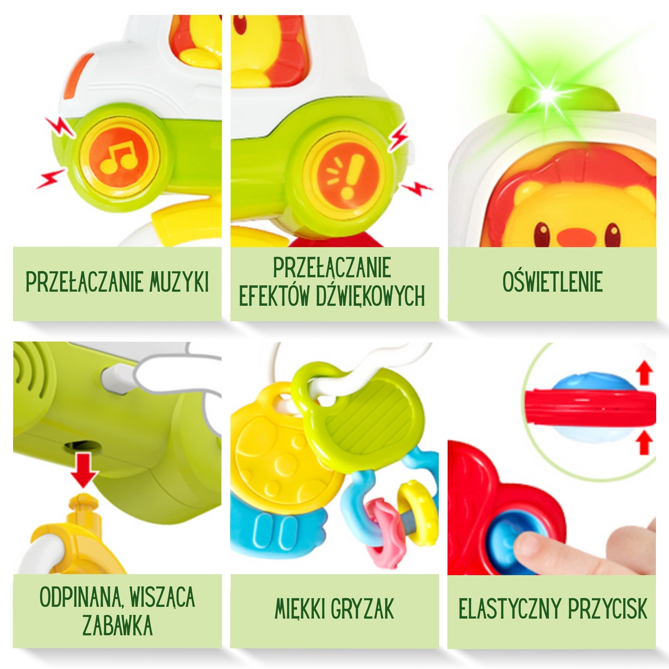 Hlavnou časťou je interaktívny ovládač v tvare autíčka s levíkom. Po stlačení tlačidiel sa aktivujú veselé melódie, realistické zvuky auta (štartovanie, trúbenie) a jemné svetelné efekty. K ovládaču sú pripojené tri kľúče na hranie, odnímateľná hrkálka a mäkké silikónové hryzadlo, ktoré prináša úľavu pri prerezávaní zúbkov. Vďaka praktickému krúžku môžete hračku jednoducho zavesiť na kočík, autosedačku alebo postieľku.