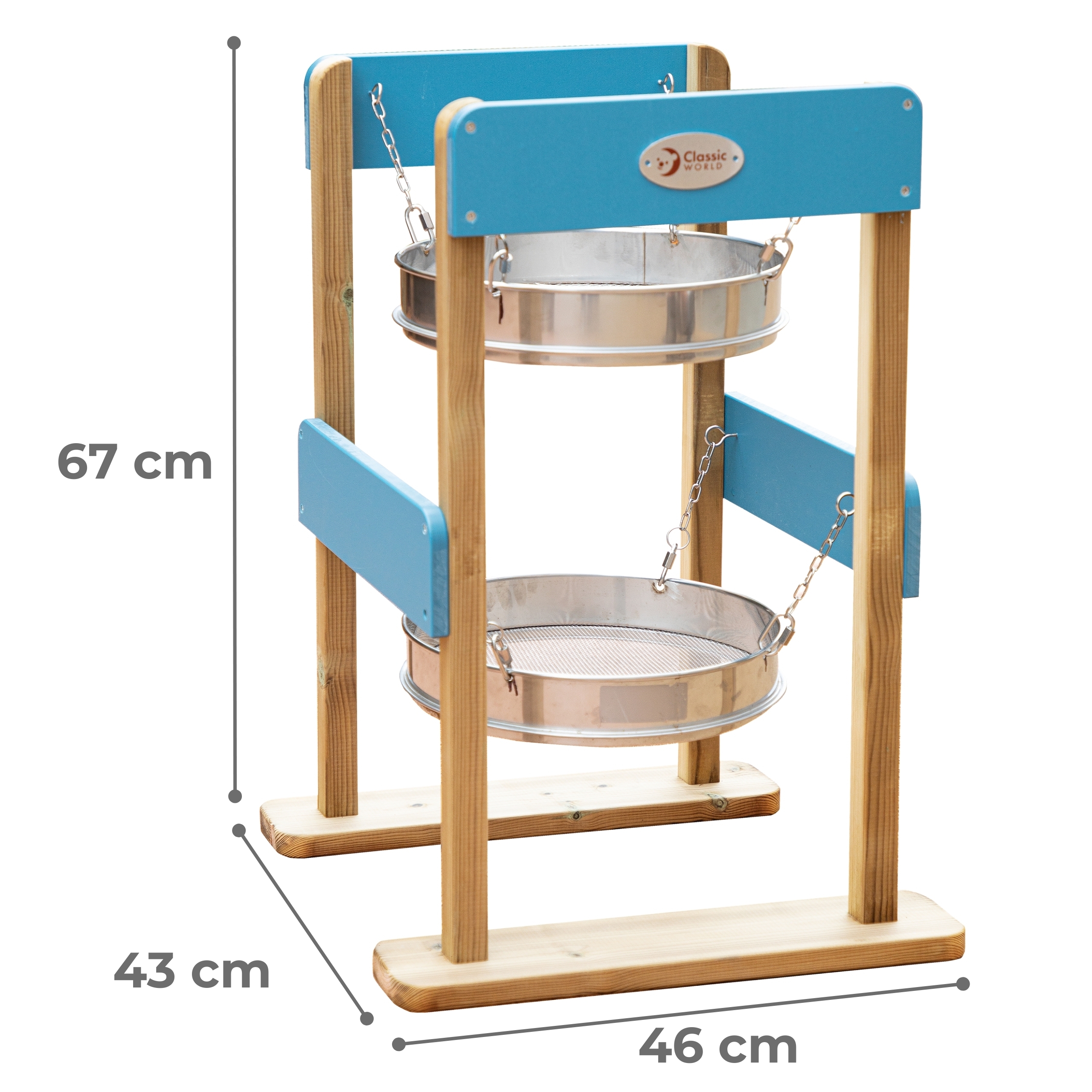 Drevené dvojité sito na piesok od spoločnosti Classic World je skvelým doplnkom pre hravé detské dobrodružstvo na pieskovisku. Jeho kvalitné a odolné prevedenie z dreva zaisťuje dlhú životnosť a bezpečnosť pri používaní. S dvoma oddelenými sitami umožňuje deťom hravo oddeľovať piesok od nežiaducich prímesí a objavovať tak pieskové poklady s ľahkosťou. Táto hračka podporuje kreatívnu hru vonku a rozvíja detskú predstavivosť a jemnú motoriku.
