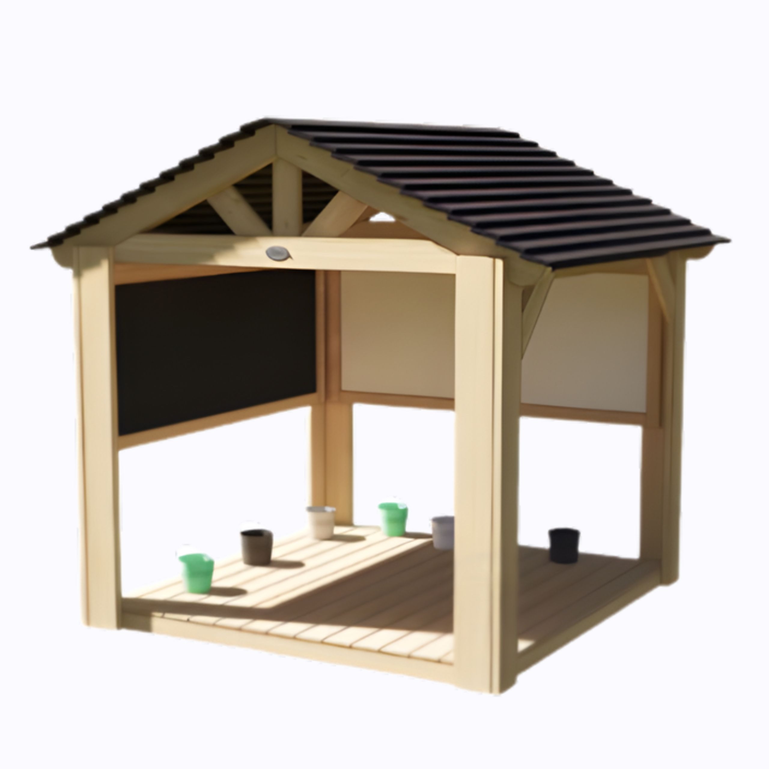 Tento model je často označovaný ako "Outdoor Art House" (Vonkajší umelecký ateliér). Vďaka priestrannosti a pevnej drevenej podlahe poskytuje ideálne zázemie pre malých umelcov. Strecha s efektom šindľa spoľahlivo chráni pred ostrým poludňajším slnkom alebo letnou prehánkou, takže zábava nemusí skončiť ani pri zmene počasia. Otvorená konštrukcia zaručuje, že deti dýchajú čerstvý vzduch a vy máte nad nimi neustály vizuálny dohľad.