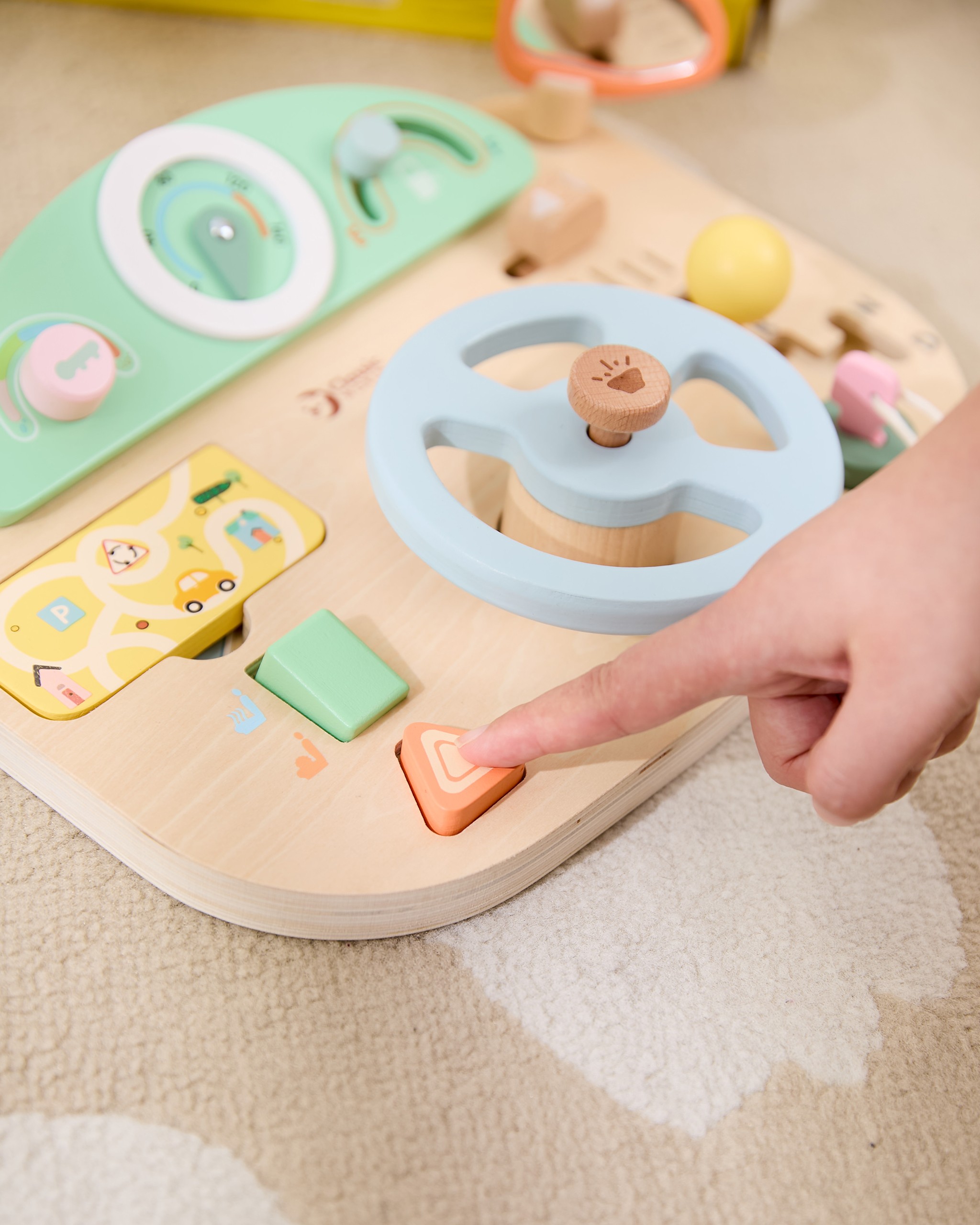 Naštartujte motor detskej kreativity s Drevenou motorickou tabuľou Volant od CLASSIC WORLD! Tento prepracovaný activity board v tvare palubnej dosky je snom každého malého šoféra a šoférky. Vďaka množstvu realistických a interaktívnych prvkov, ako je pohyblivý volant so zvukovým klaksónom, radiaca páka, kľúčik v zapaľovaní či rôzne budíky, sa dieťa bude cítiť ako v skutočnom aute. Táto hračka je nielen zdrojom nekonečnej zábavy, ale aj fantastickým nástrojom na rozvoj jemnej motoriky.