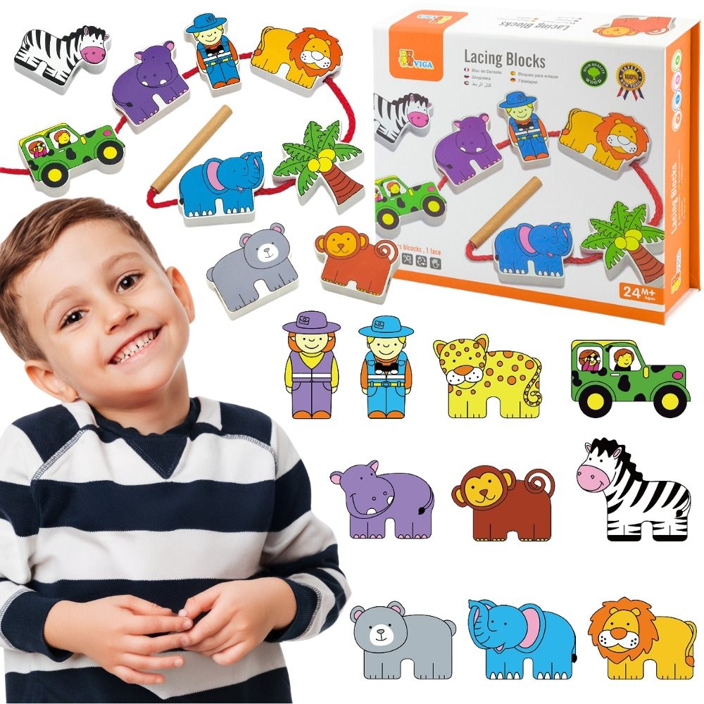 Drevená navliekačka Viga Safari ZOO je interaktívna motorická hračka navrhnutá pre deti už od 2 rokov. Rieši problém s tréningom jemnej motoriky tým, že hravou formou učí batoľatá presne prevliekať šnúrku s ihlou cez otvory v rôznych tvaroch. Je ideálna na rozvoj koordinácie oko-ruka, trpezlivosti a rozoznávania exotických zvierat, pričom figúrky slúžia aj na samostatnú rolovú hru.