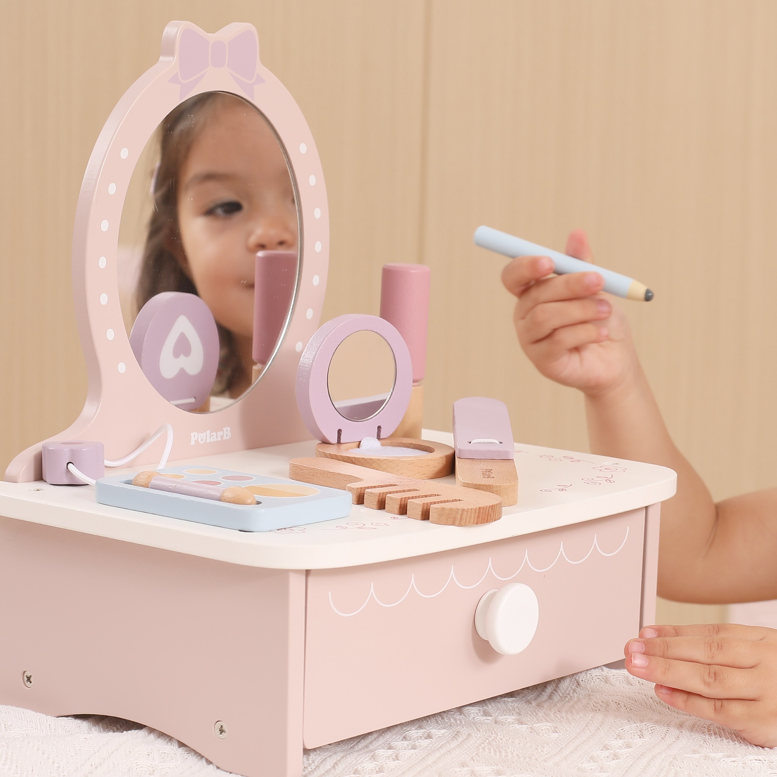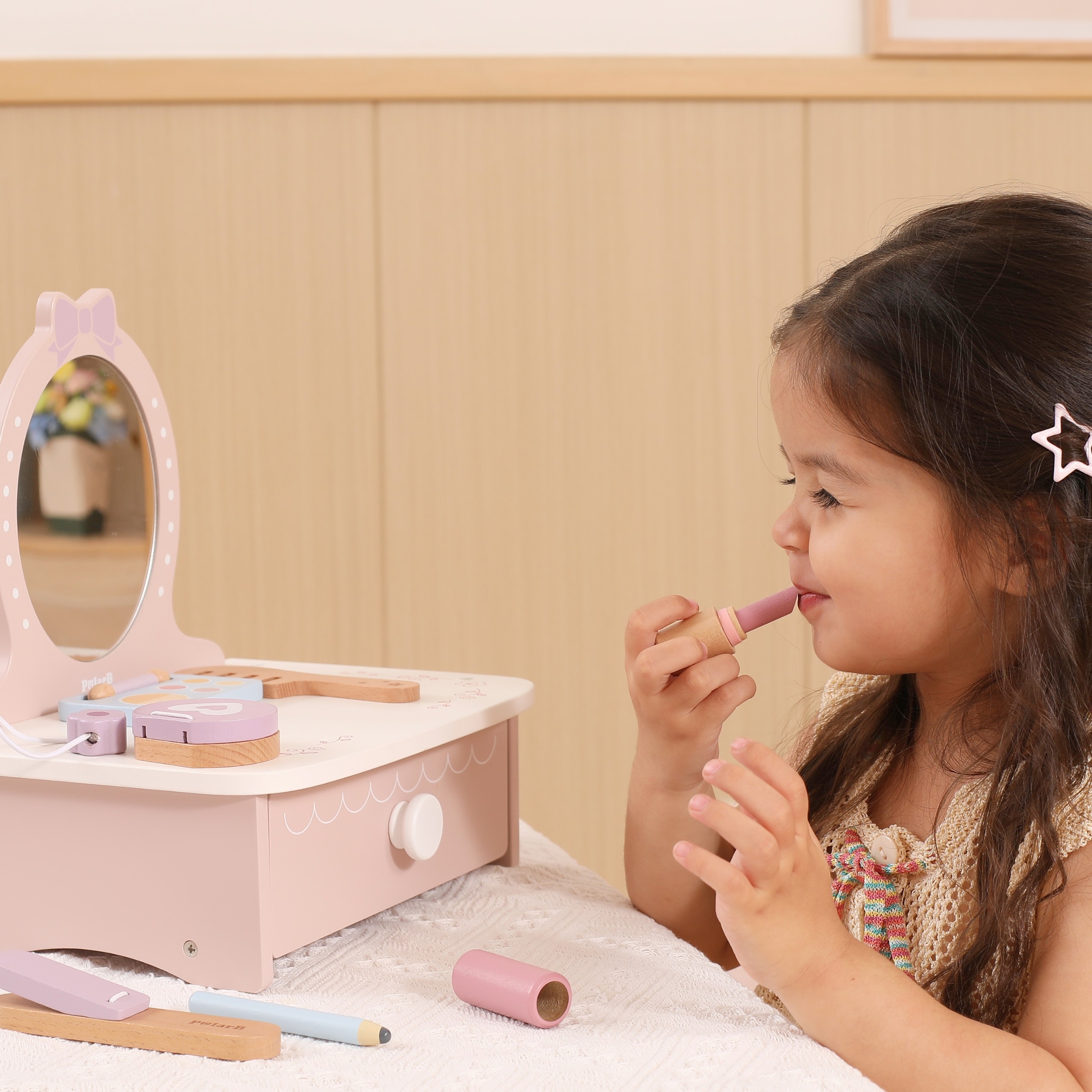 Pre malé dieťa je kozmetický stolík "magickým" miestom dospelých. Možnosť mať vlastné, bezpečné miesto so zrkadlom, kde môže napodobňovať ranné rituály mamičky, je preň neuveriteľne dôležitá. Učí sa tým nielen jemnej motorike pri manipulácii s doplnkami, ale aj starostlivosti o seba a hravou formou objavuje svoju vlastnú tvár a identitu. Je to brána do sveta fantázie, ktorá buduje sebavedomie.