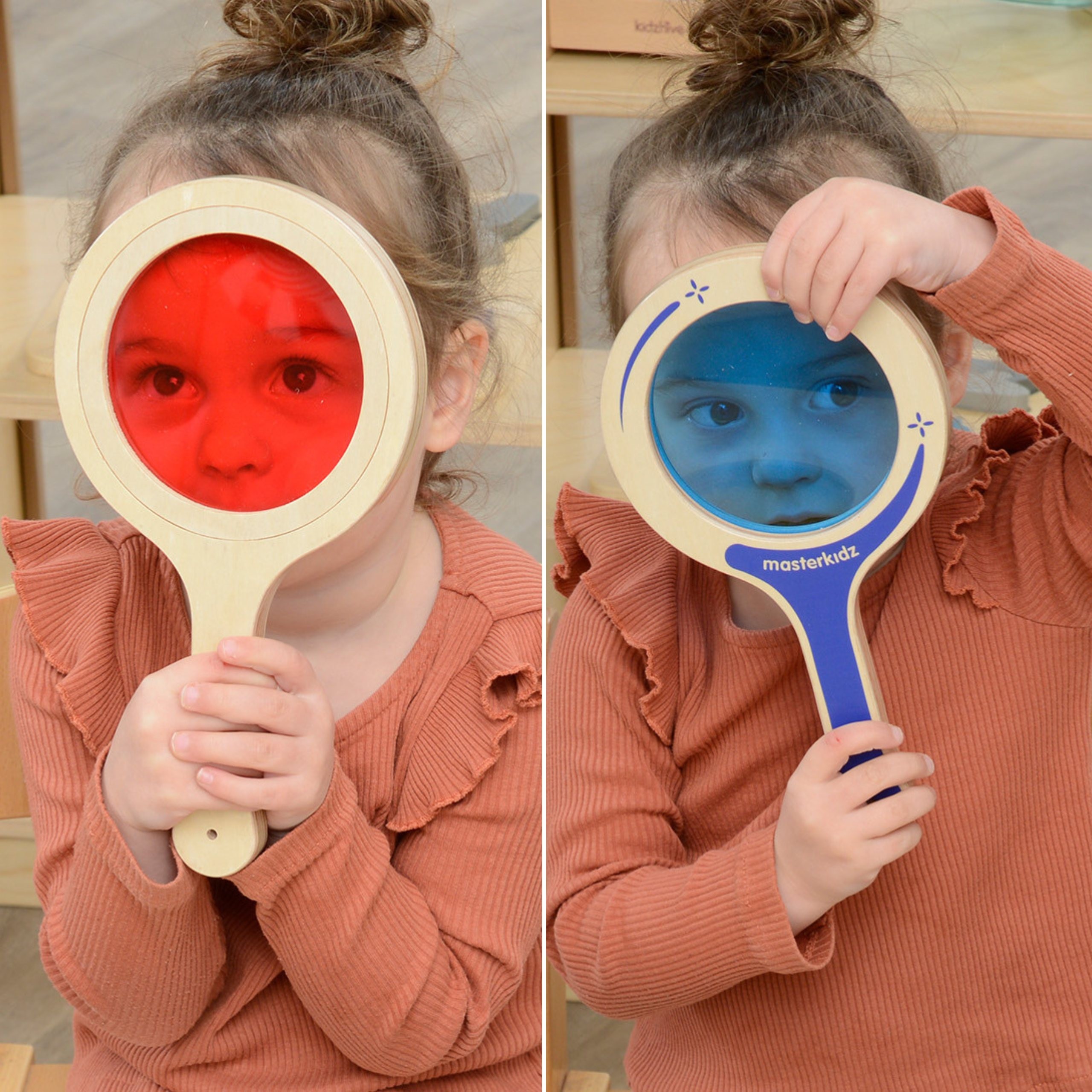Masterkidz Sada 5 drevených paletiek s farebnými šošovkami – Objavovanie farieb a svetla