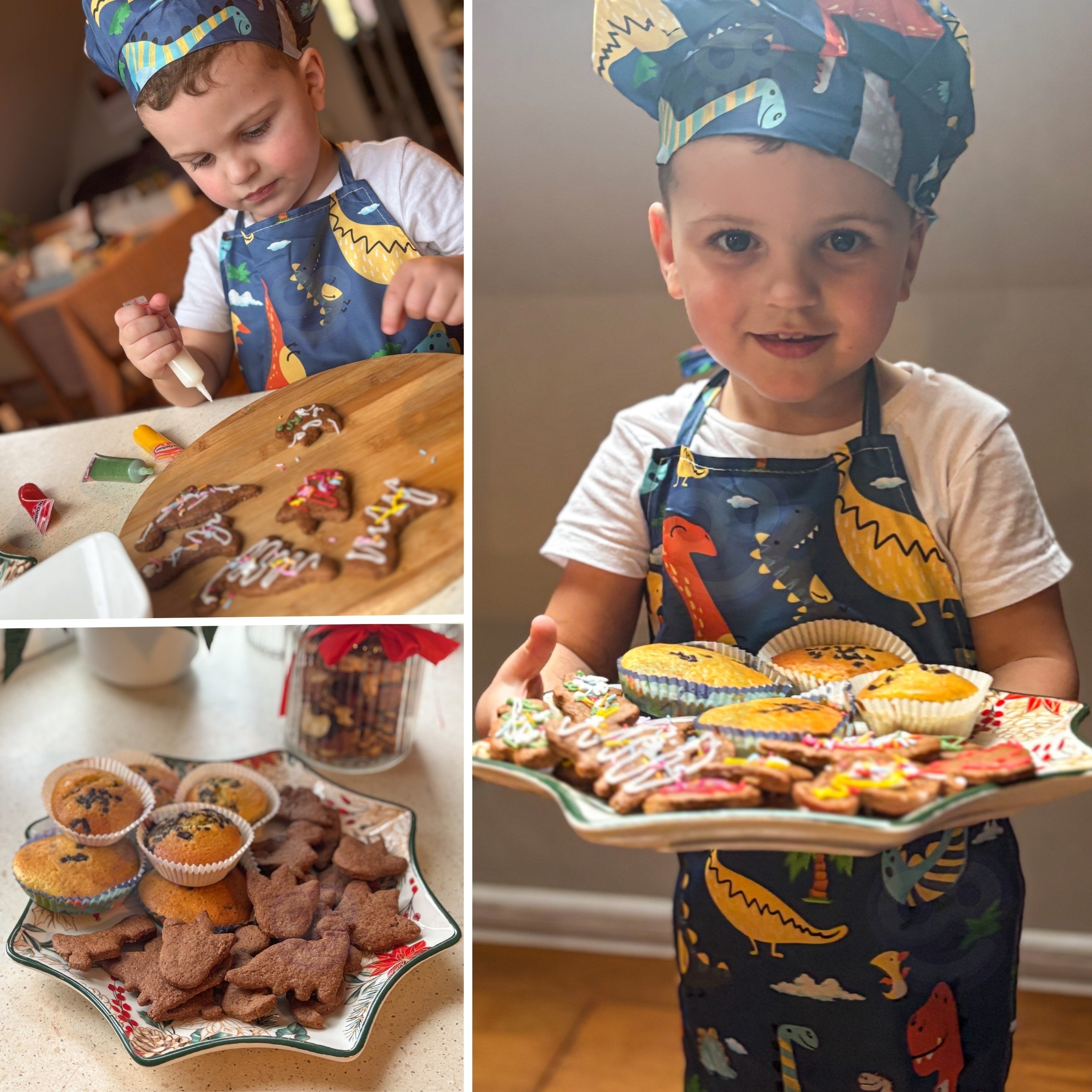 👨🍳 Profesionálny vzhľad a pohodlie: Roztomilá zástera s motívom dinosaurov má nastaviteľný popruh okolo krku a kuchárska čiapka má elastickú gumičku. Sada tak dokonale padne a "porastie" spolu s vaším dieťaťom. 🍪 Skutočné pečenie, nielen hra: Vďaka potravinársky nezávadným materiálom môže dieťa naozaj pomáhať a vytvárať jedlé majstrovské diela. Je to skvelý spôsob, ako ho zapojiť do prípravy jedla. 🦖 Všetko pre malého cukrára: Táto neuveriteľne bohatá sada obsahuje všetko od valčeka a metličky cez odmerky, formičky, cukrárske vrecká až po silikónovú formu na mini dinosaurov. 🧠 Učenie dôležitých zručností: Dieťa sa hravou formou učí samostatnosti, kreativite, jemnej motorike a základným kuchynským postupom. Spoločné pečenie navyše posilňuje rodinné putá.